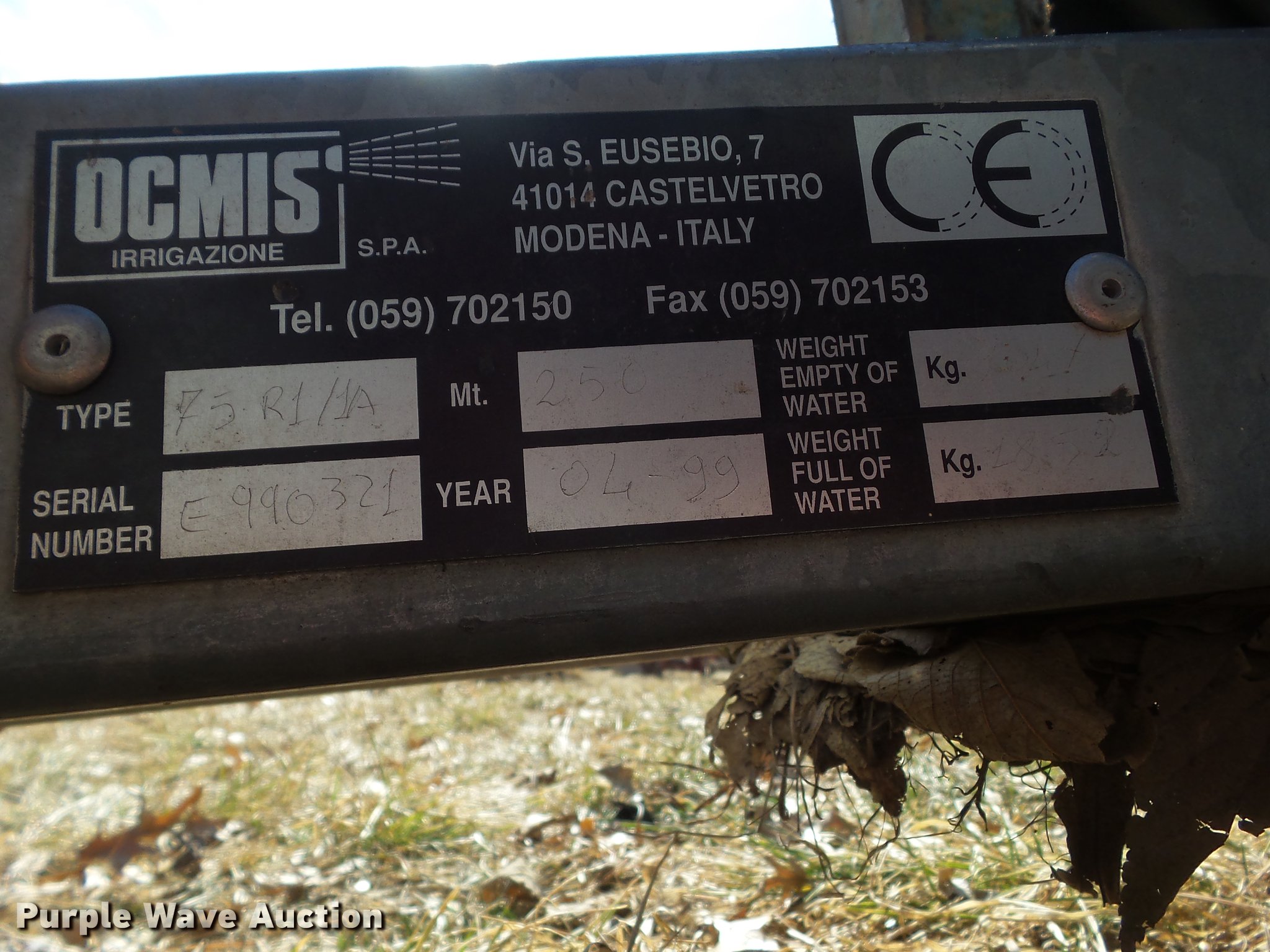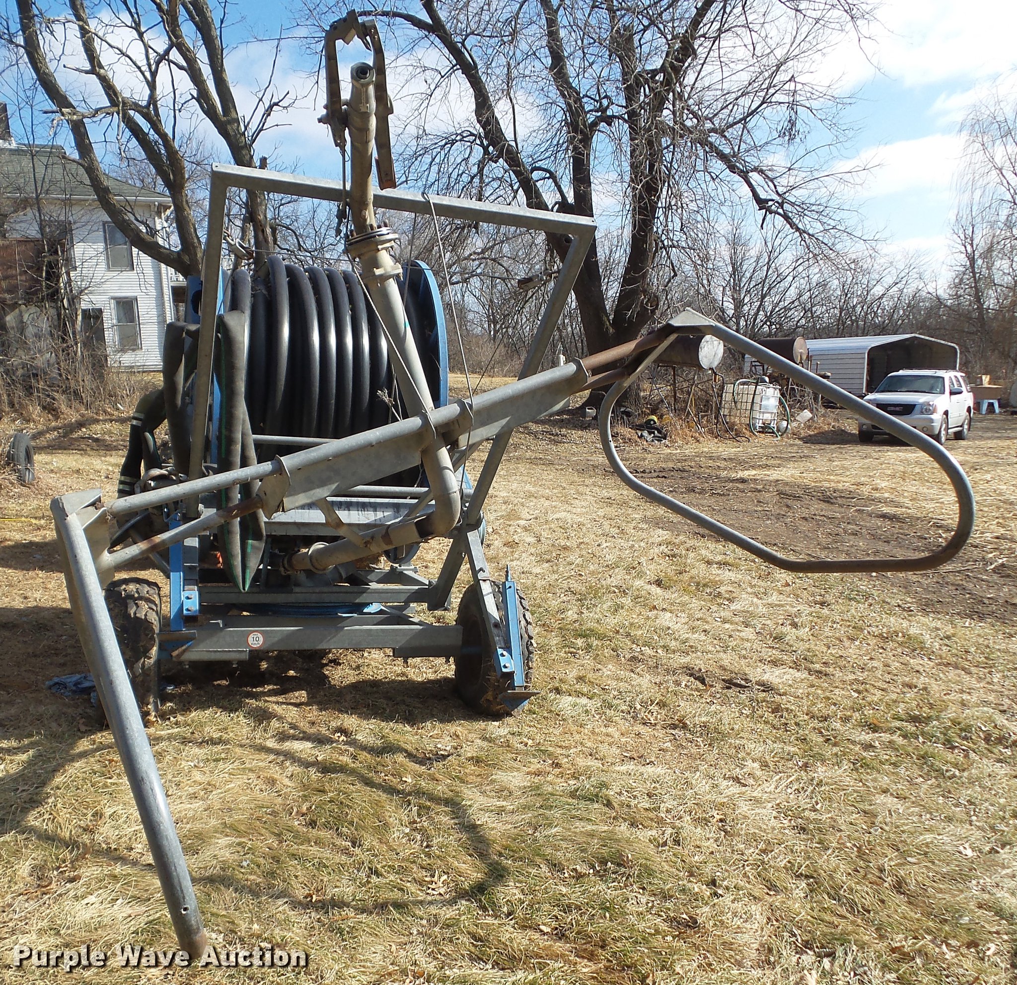 Purple Wave is selling a used Hose Reel in Iowa. This item is a 1999 Ocmis 75R11A water reel with the following: 4" flexible hose connection, Automatic rewind, Approx. 1/8 mile of 3" tubing, Rotating head, Traveling gun, Pin hitch, Single leg landing gear, 10/80-12 tires, Serial E990321