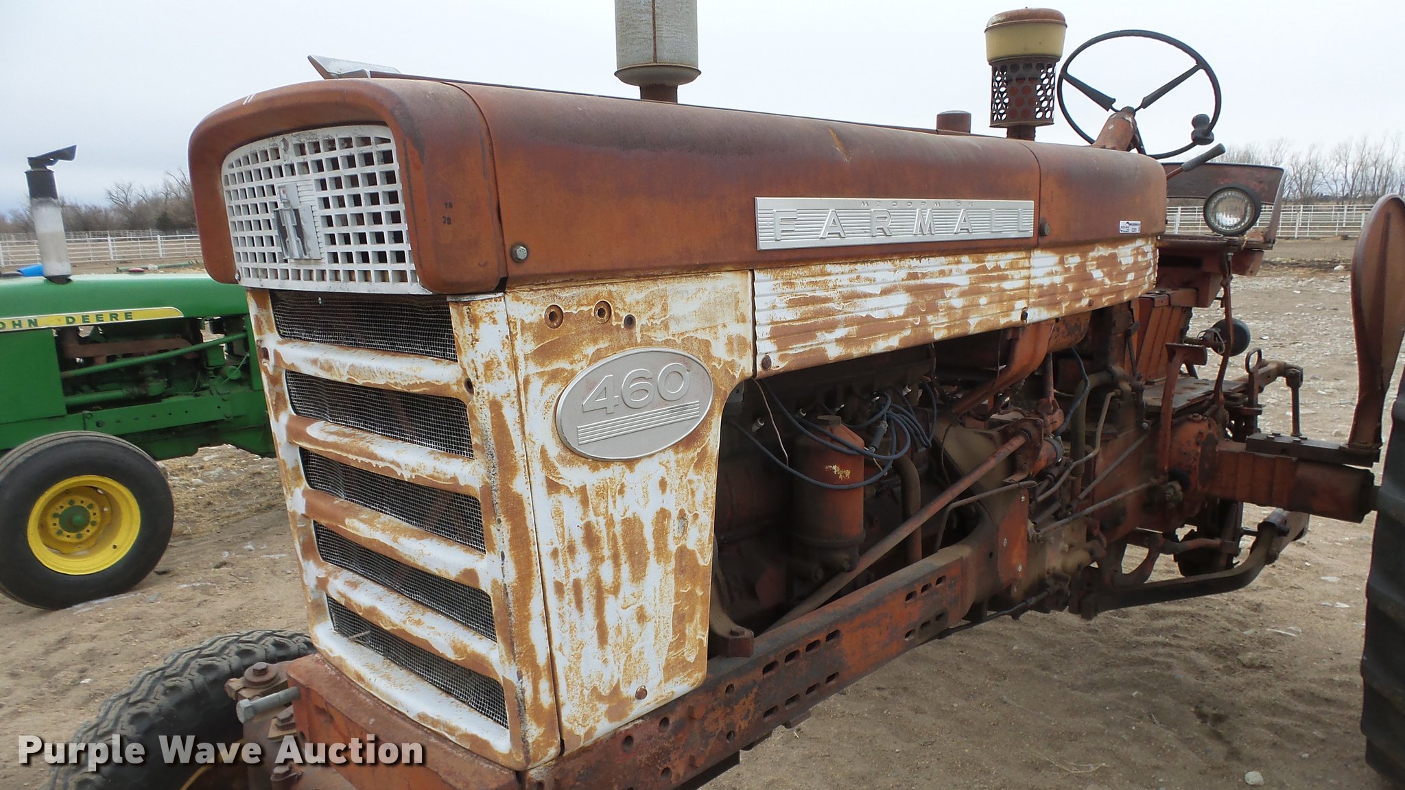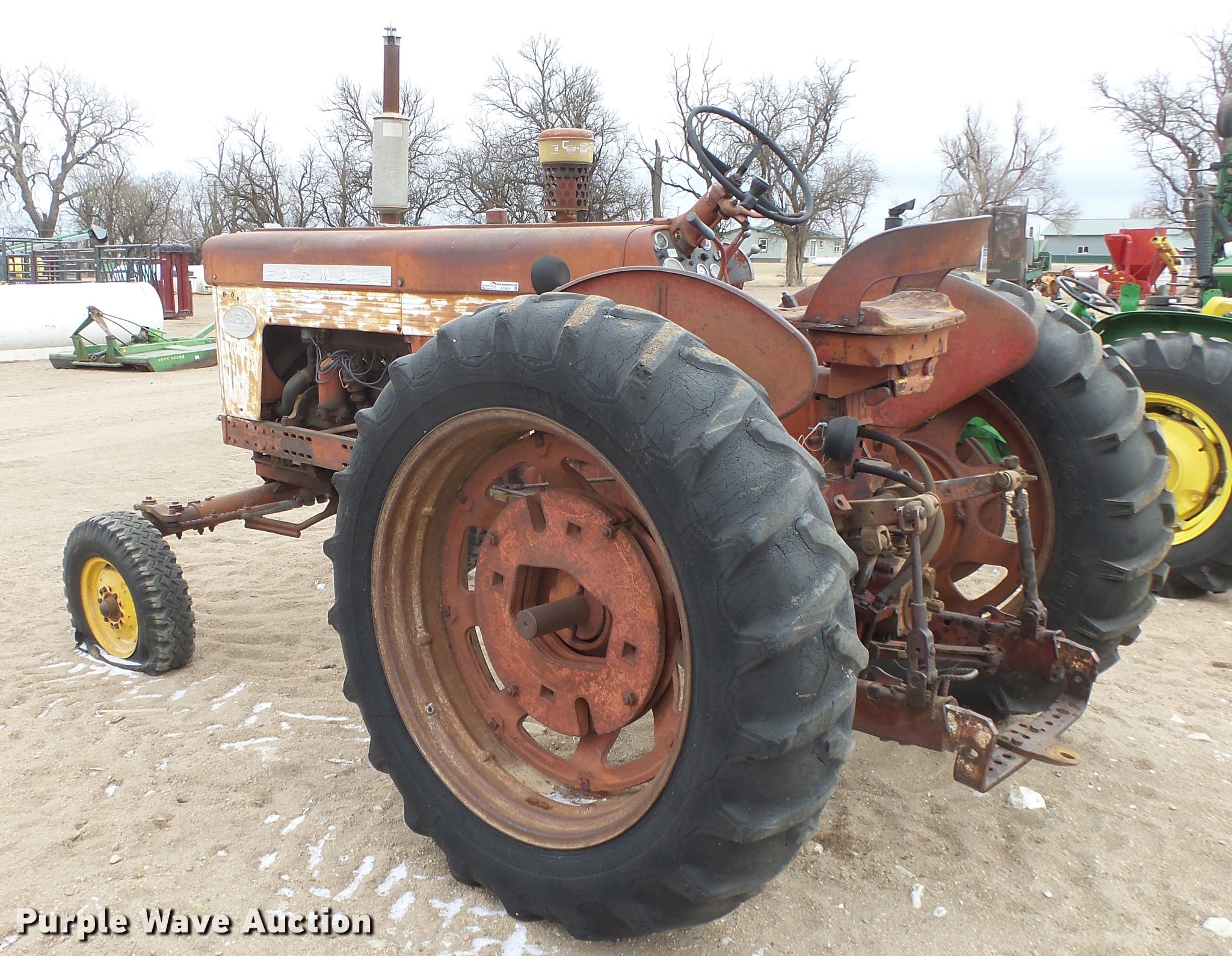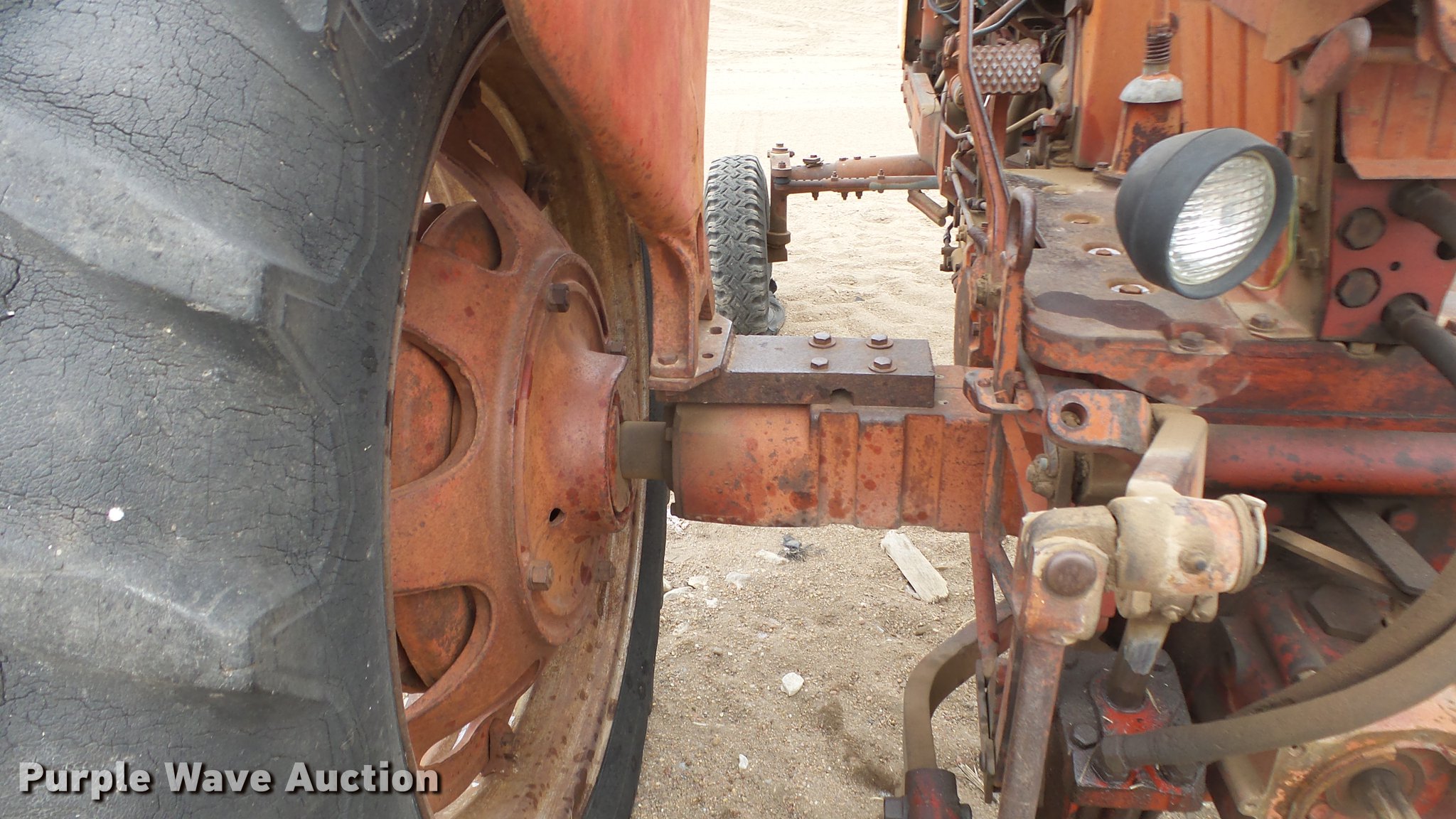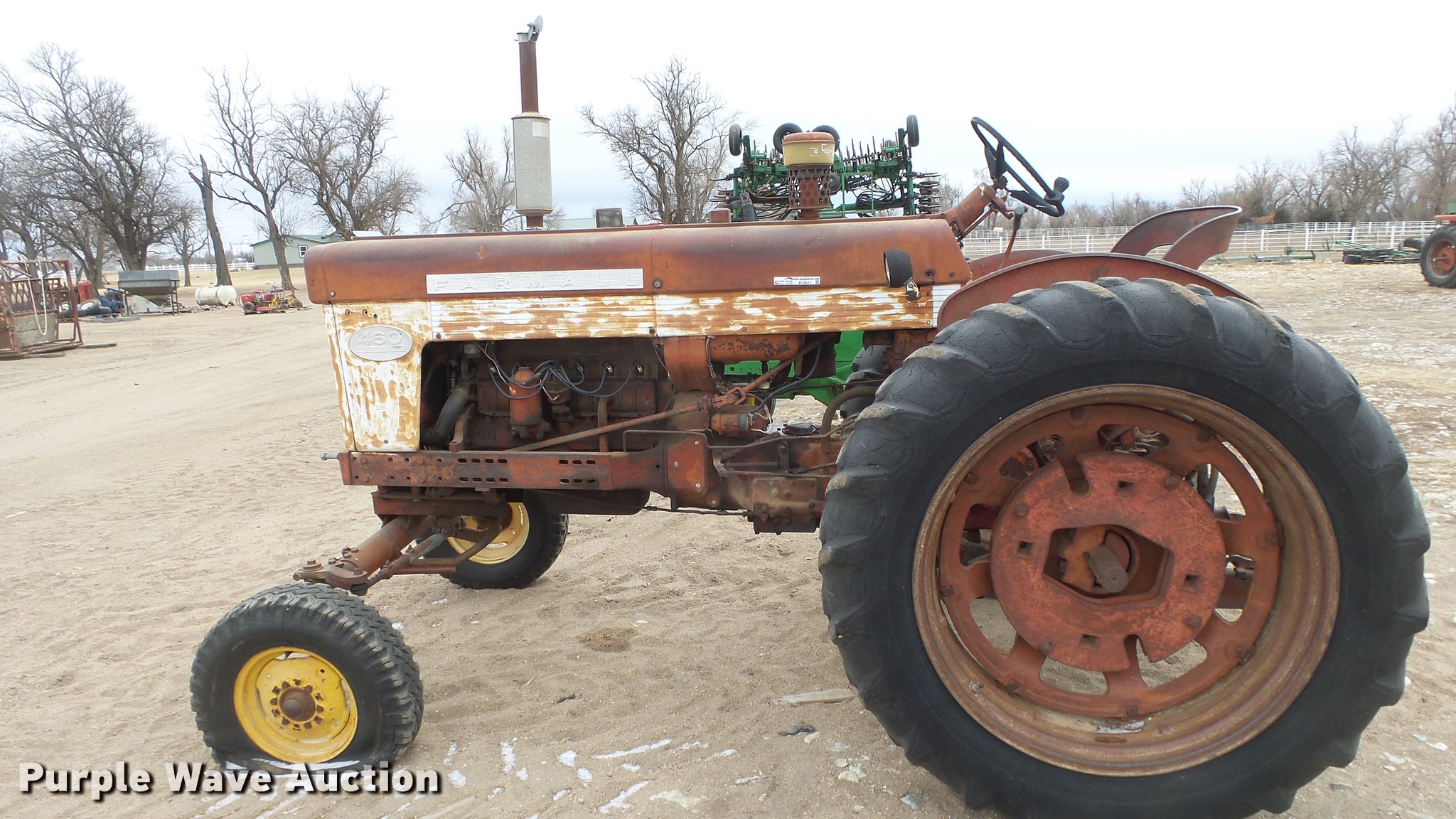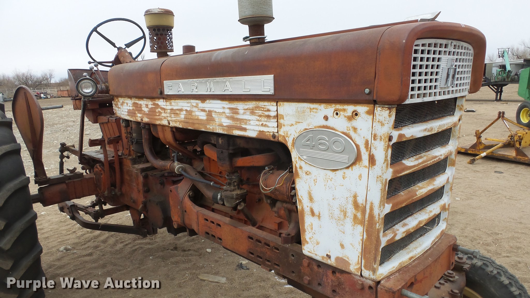 Purple Wave is selling a used Tractor in Kansas. This item is a International 460 tractor with the following: 7,311 hours on meter, International 3.6L six cylinder gas engine, Sliding gear transmission, 5F-1R gears, Work lights, 540 PTO, 7.00-15 front tires, 15.5-38 rear tires