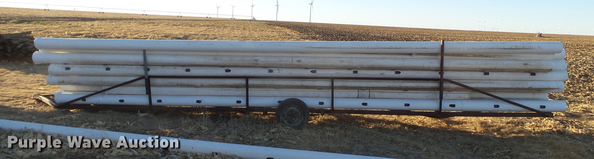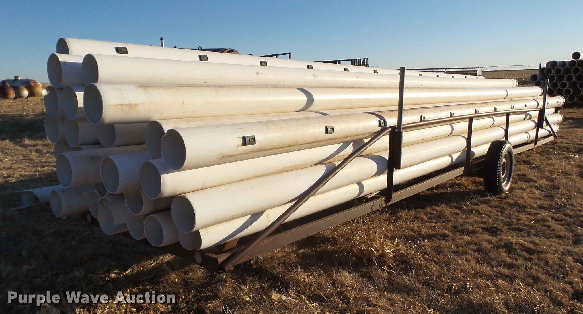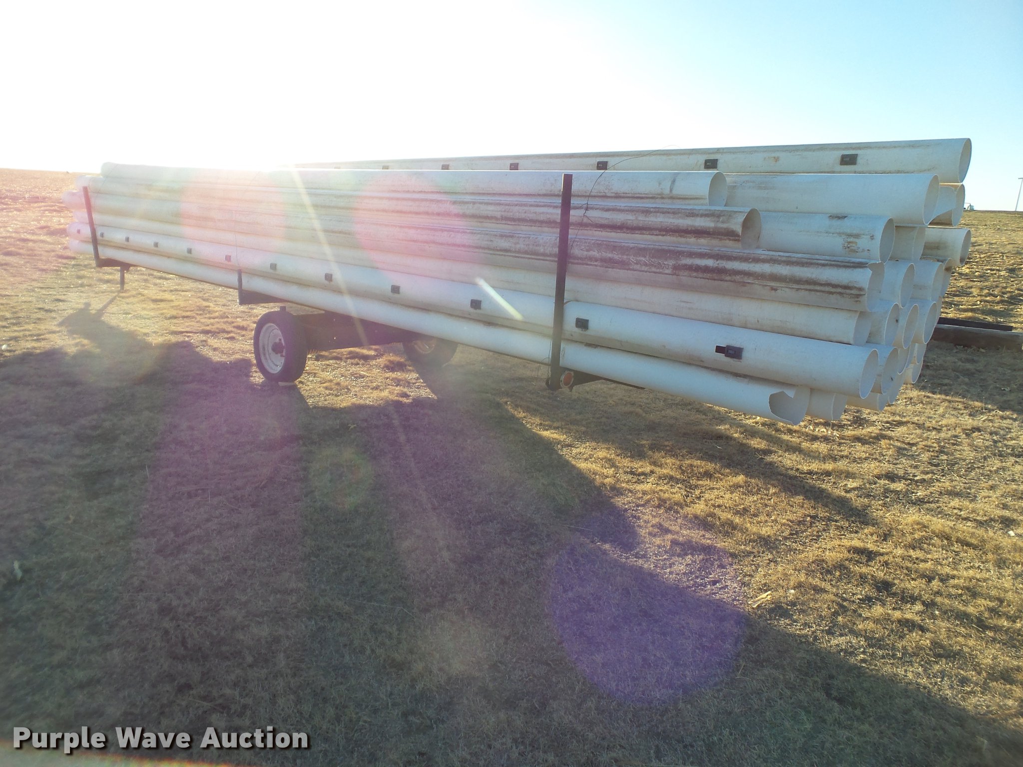 Purple Wave is selling a used Irrigation Equip. Attach. in Texas. This item is a Irrigation PVC pipe with the following: Approx. 115 joints, 30'L x 8" diameter, Some joints are shorter than 30'L, Most joints are gated at 30" rows, Some at 32" rows, (3) transport trailers, One trailer tire needs replaced