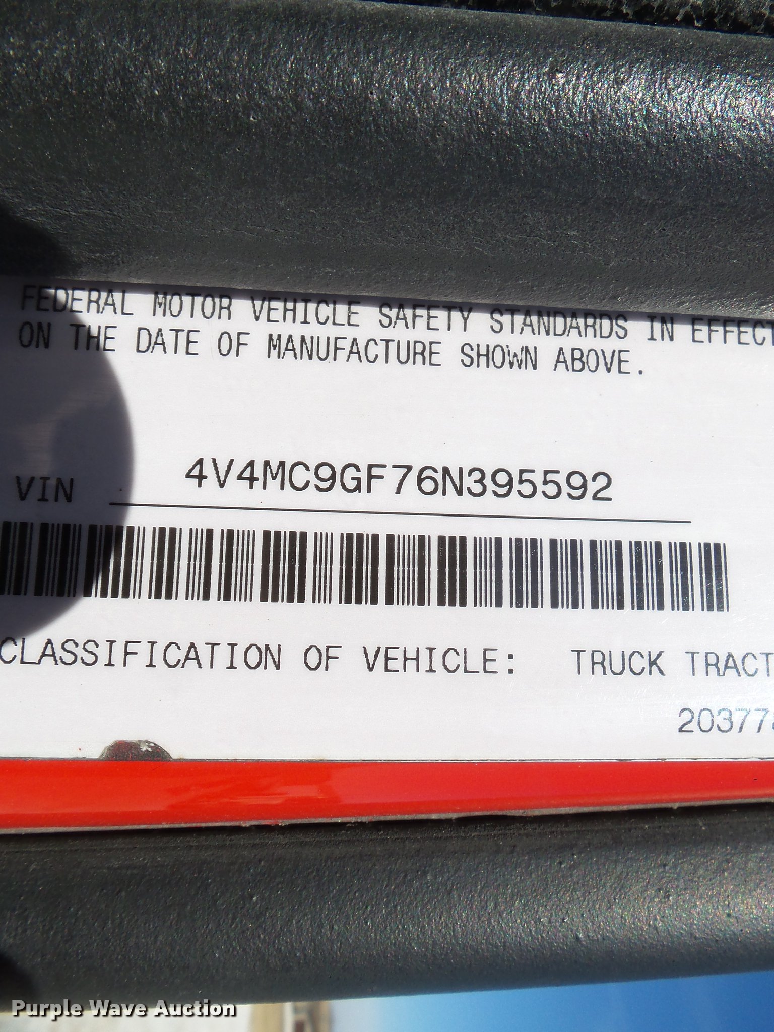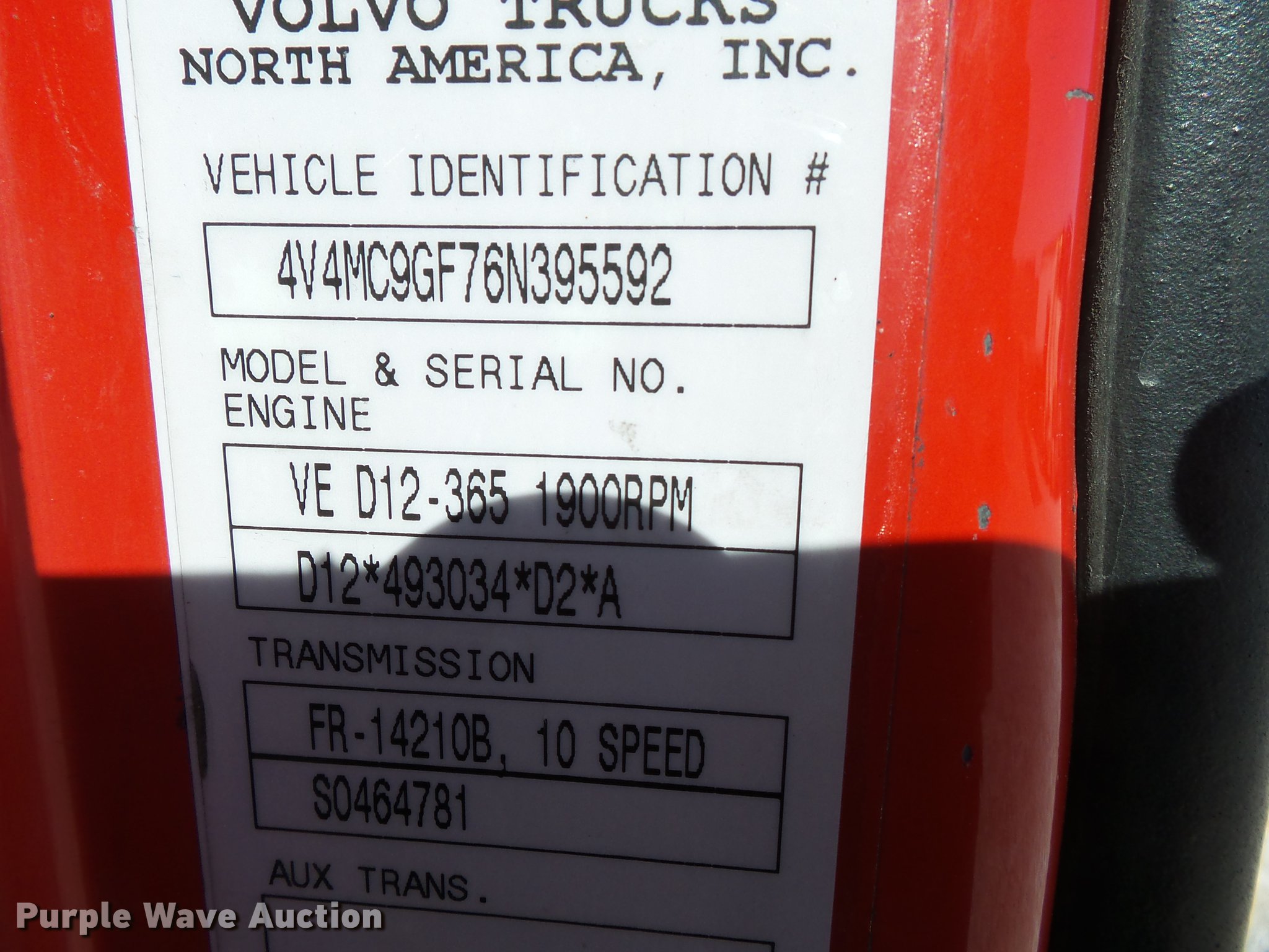 2006 Volvo VNM semi truck. 807,087 miles on odometer, Volvo D12-365 12.1L L6 turbo diesel engine, Eaton Fuller FR142108 10 speed manual transmission, Tandem axle, Inter-axle differential lock, AC and heat, AM/FM, Power mirrors, Air suspension seat, Exterior visor, Single exhaust stack, Aluminum deck plate, Fixed fifth wheel plate, Dual feul tanks, Stainless steel fenders, Air suspension, Air brakes, Engine brake, 3:07 gear ratio, 152" wheelbase, 295/75R22.5 front tires, 11R22.5 rear tires, GVWR 50,500 lbs, FAWR 12,500 lbs, IAWR 19,000 lbs, RAWR 19,000 lbs, Check engine light on, Intermittent dash electrical issues, Unit# 114. Missouri title. Title distribution may be delayed up to 14 days from verification of funds. 4V4MC9GF76N395592. Keuker Trucking. 992 Pcr 910. Perryville, MO 63775