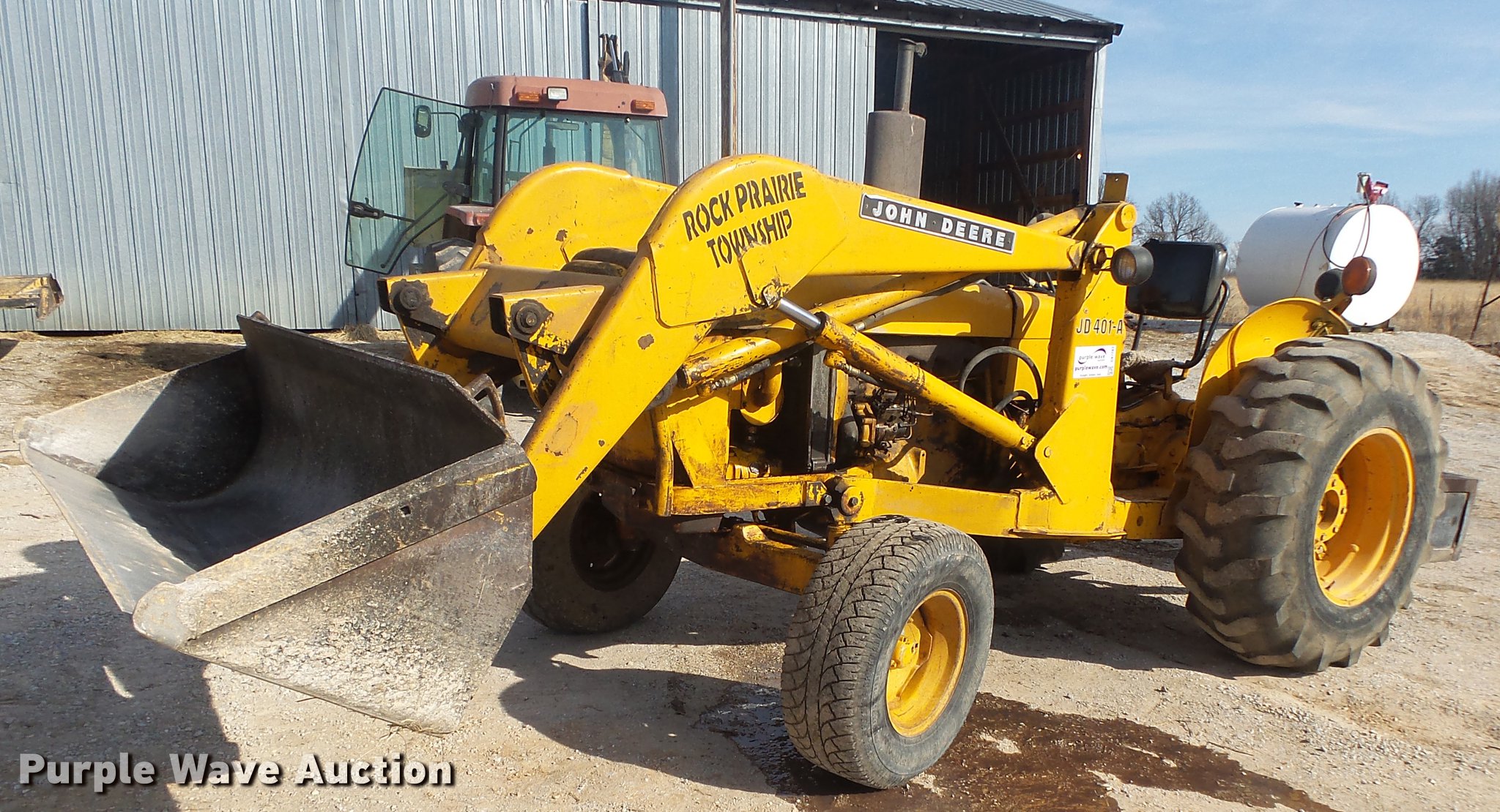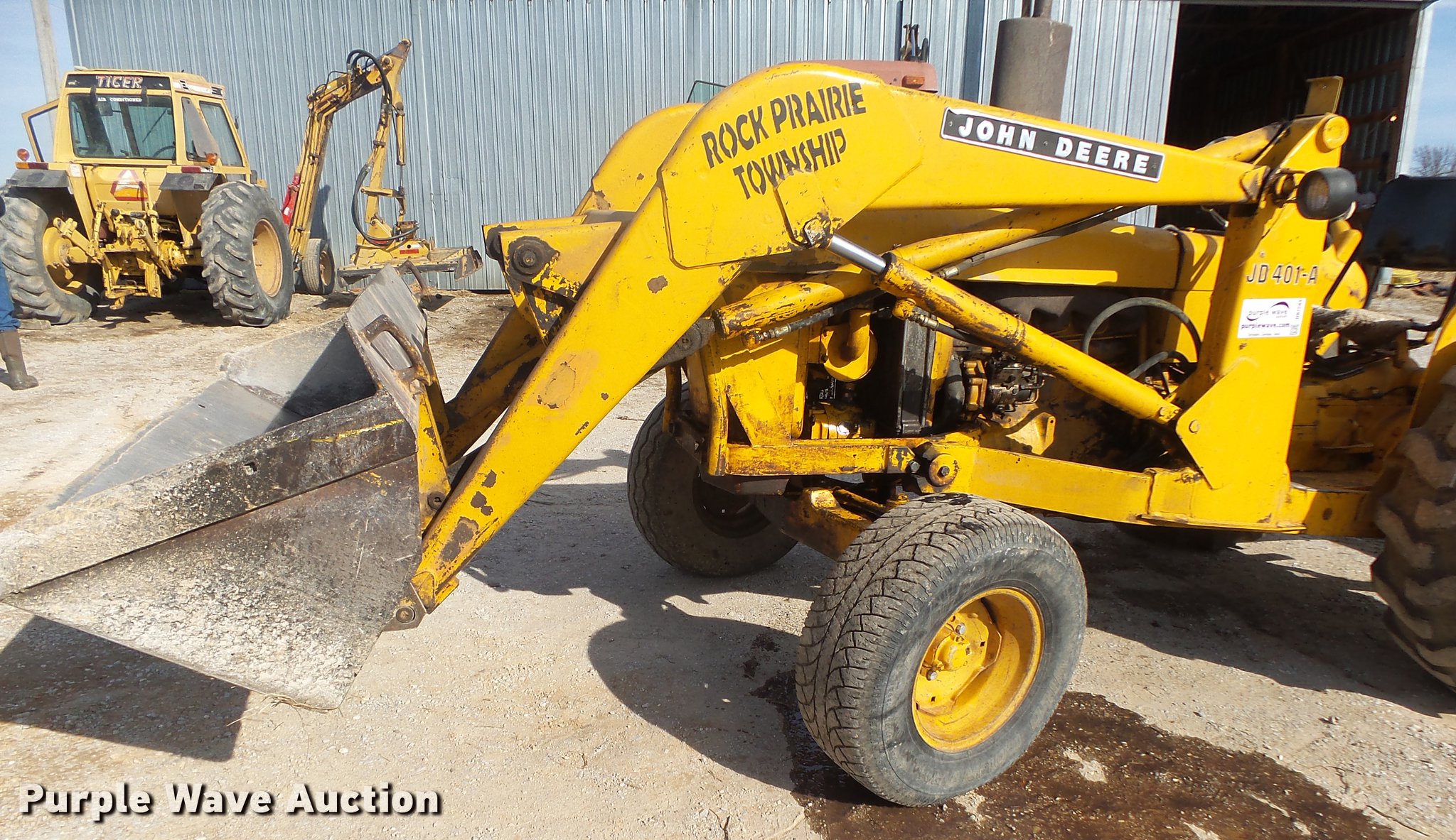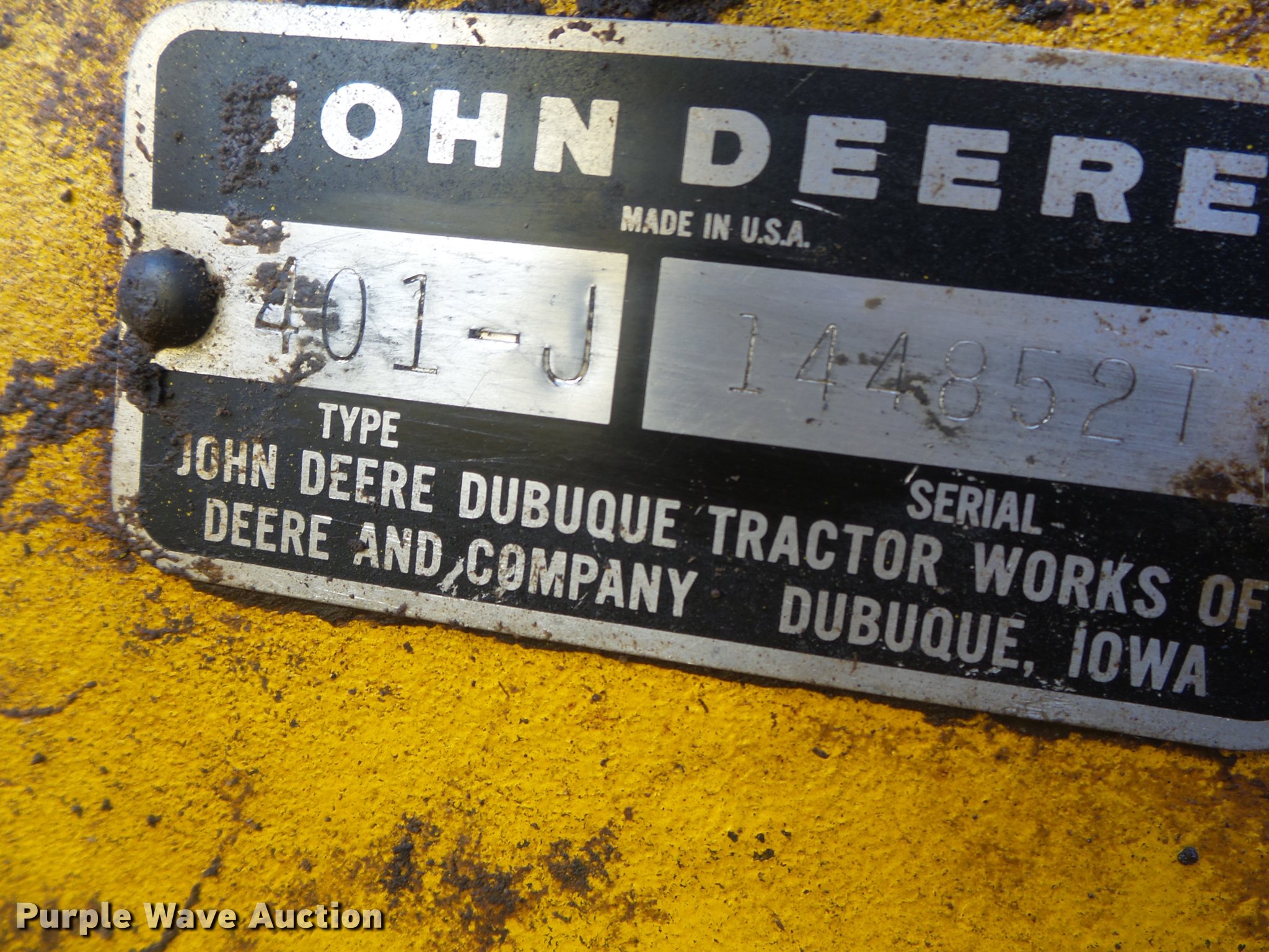 Purple Wave is selling a used Tractor in Missouri. This item is a John Deere 401J tractor with the following: 3,001 hours on meter, John Deere 40020DT four cylinder diesel engine, Serial 214114T, Manual transmission, 8F-1R gears, Differential lock, John Deere JD401-A loader, 81"W bucket, Joystick controls, Three point, Top link, 540 PTO, Rear weight, Three point, 31x10.5R15L front tire, 11L-15SL front tire, 16.9-24 rear tires, Serial 1448521