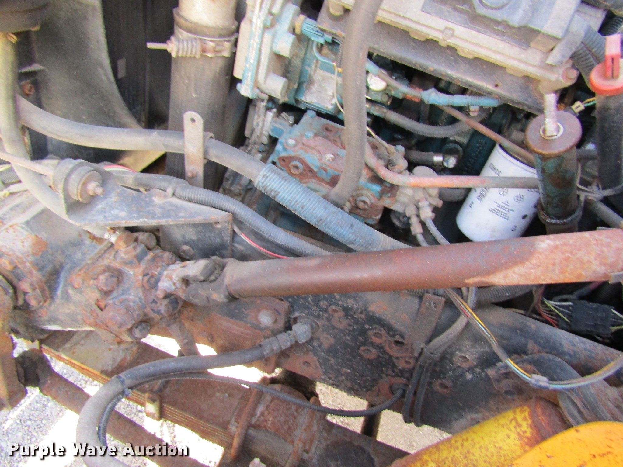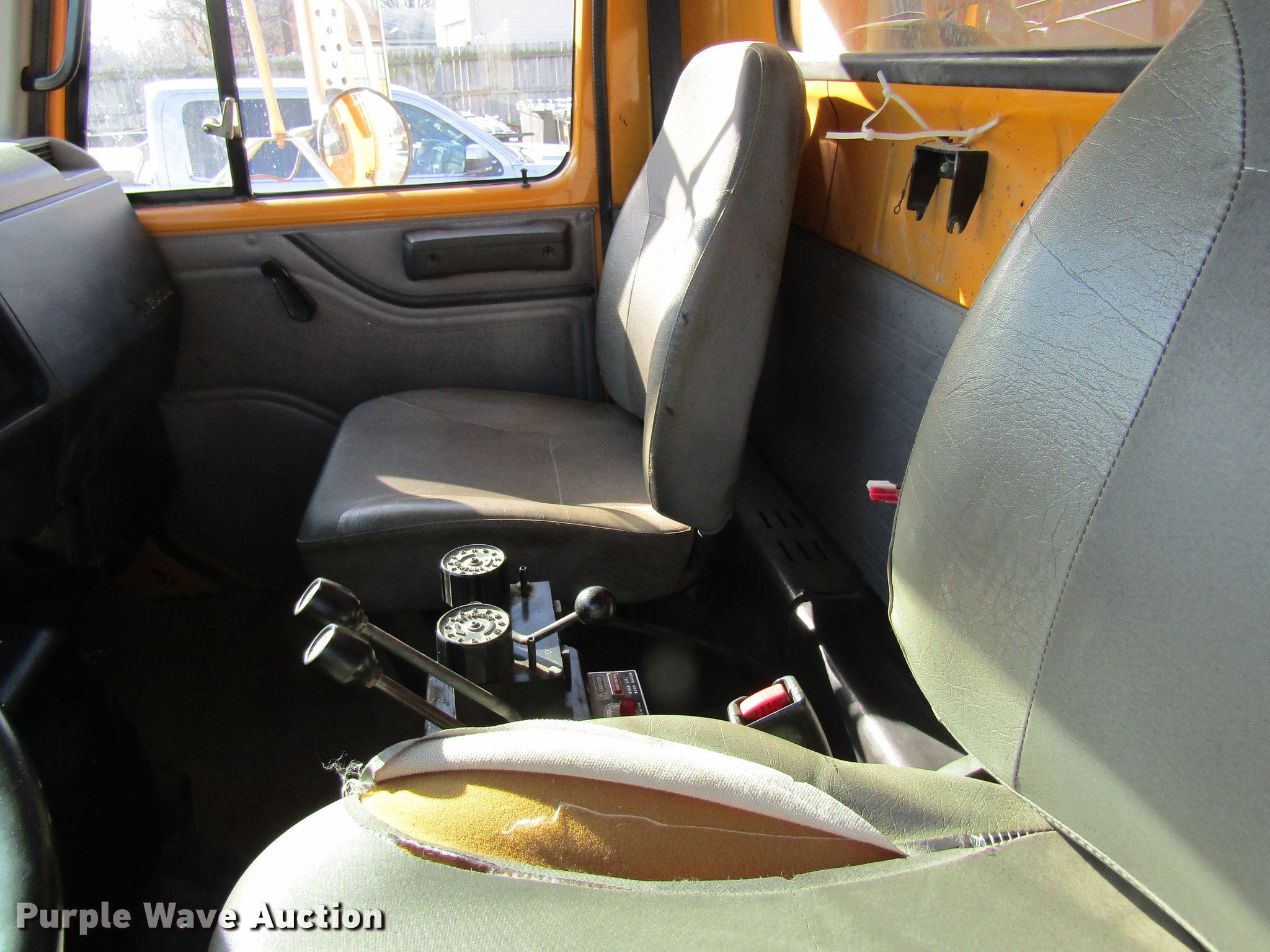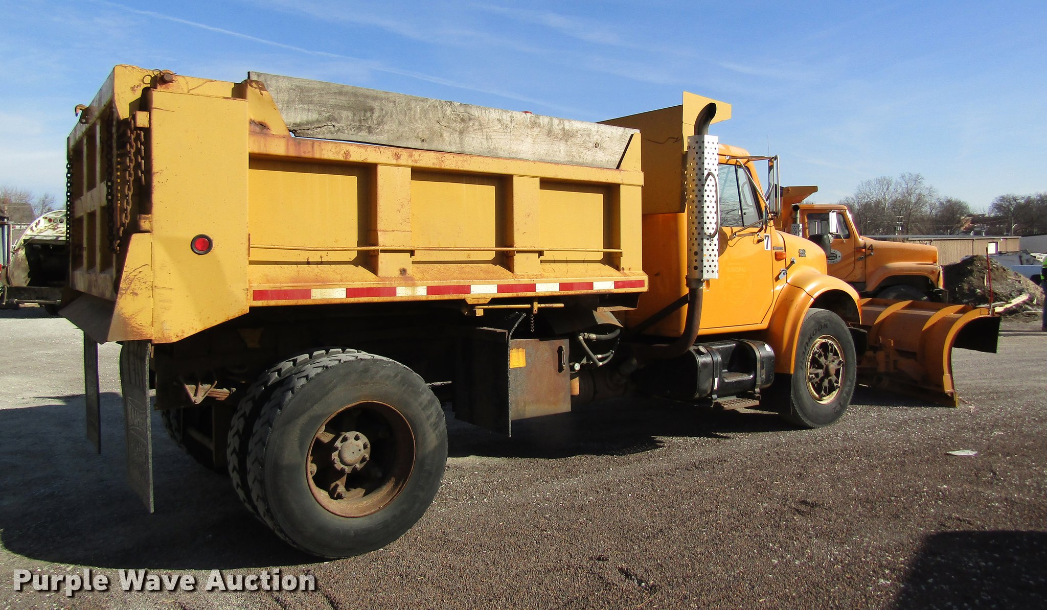 Purple Wave is selling a used Construction Dump Truck in Missouri. This item is a 1999 International 4900 dump truck with the following: 55,995 miles on odometer, 6,348 hours on meter, International DT466 7.6L L6 turbo diesel engine, Automatic transmission, Single axle, AC and ehat, Cruise, Weatherband, Heated mirrors, Air suspension seat, PTO, Heil steel dump bed, 10'L x 8'W, 32" side height, 12" sideboard height, Single ram hoist, Air operated end gate, Flink PF91S snow plow, 10'W, Single fuel tank, Spring suspension, Air brakes, 11R22.5 tires, Spreader chains in bed, Unit# 7