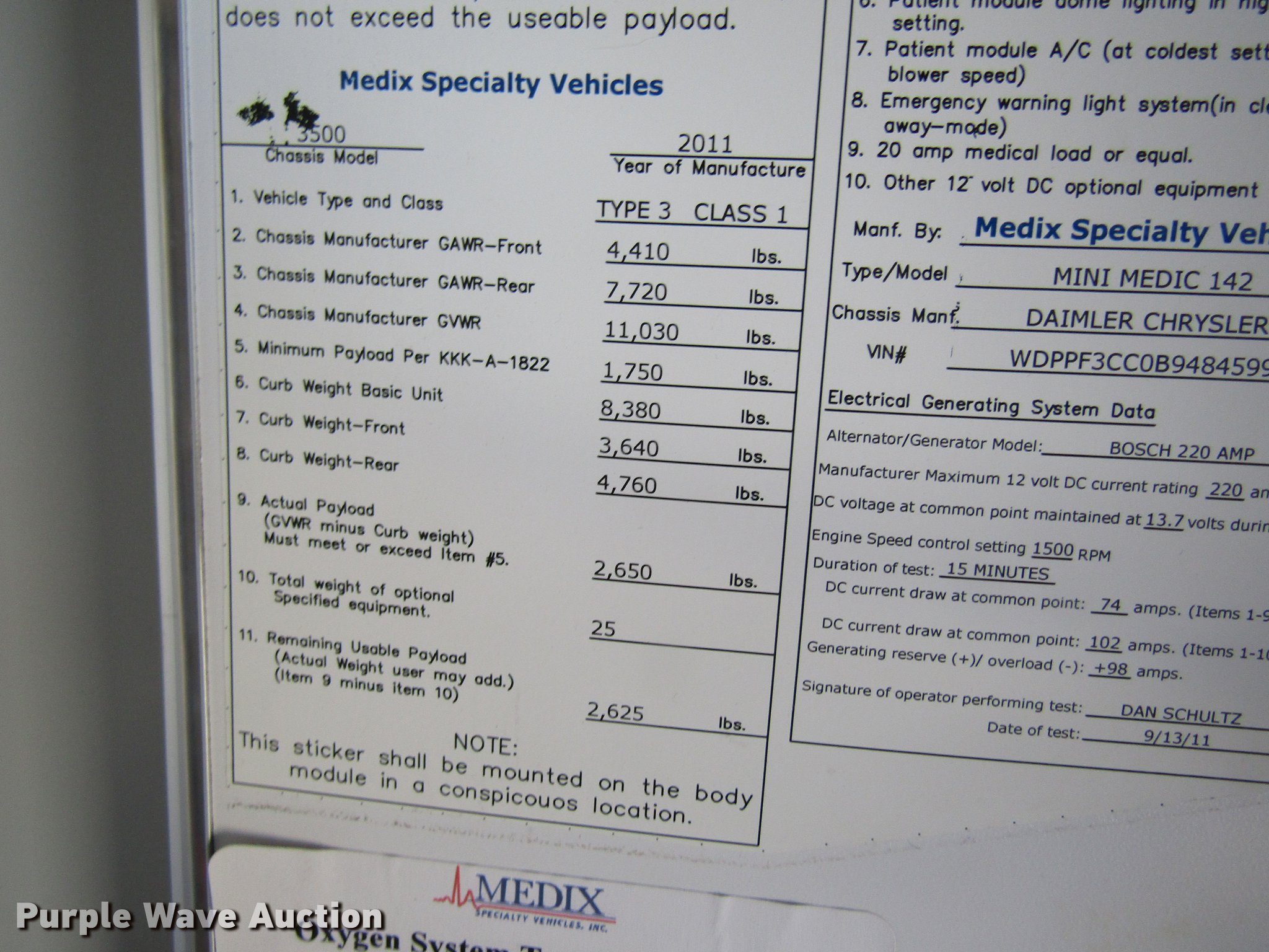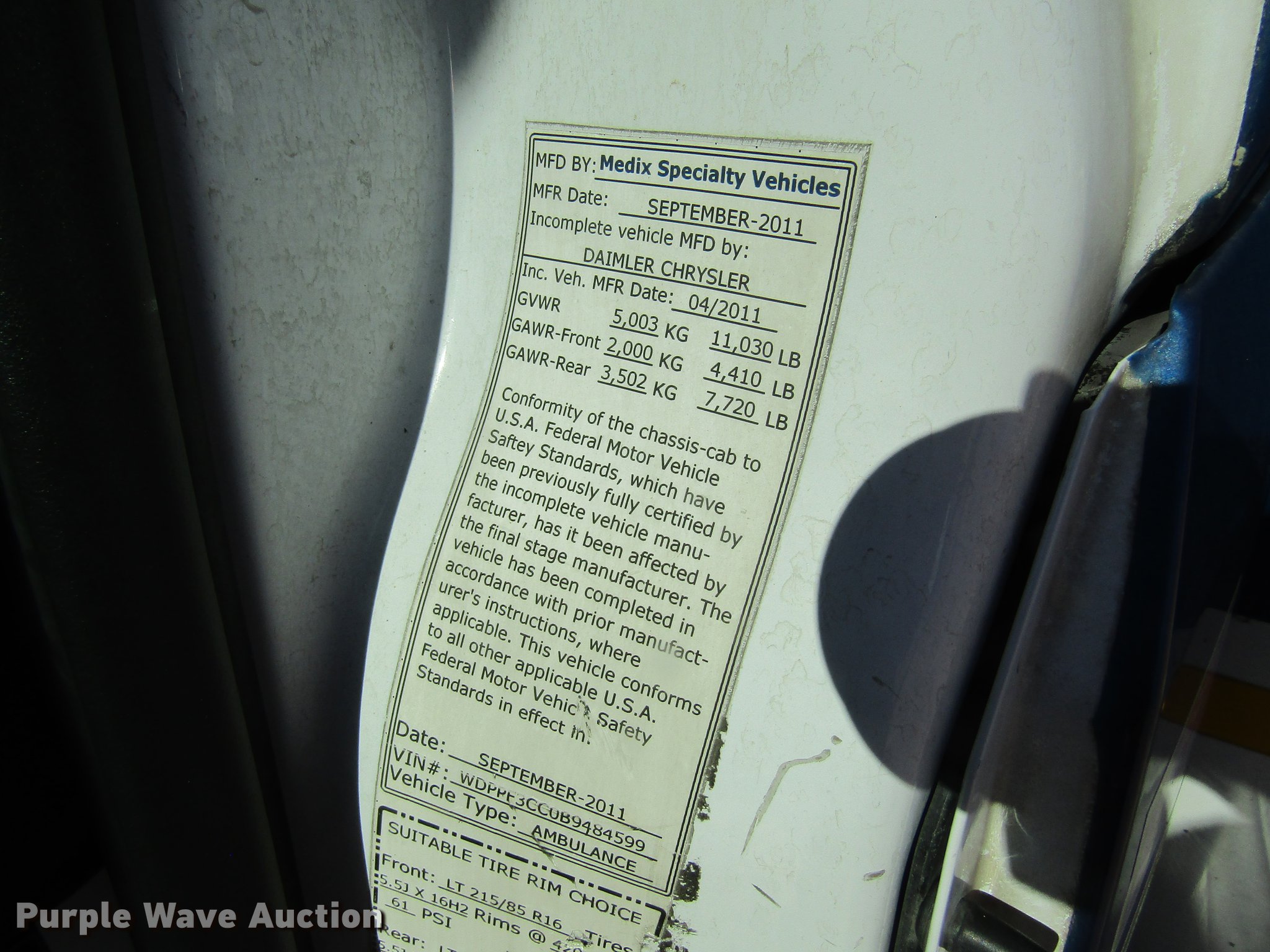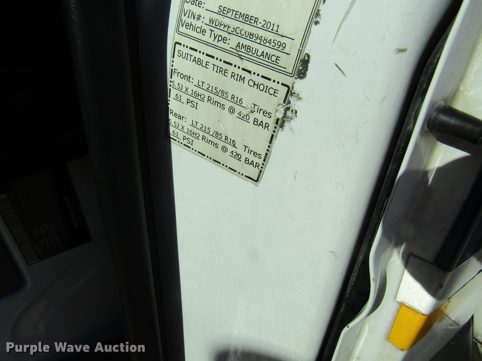 2011 Freightliner Sprinter 3500 ambulance. 278,131 miles on odometer, 3.0L V6 turbo diesel engine, Automatic transmission, Single axle, AC and heat, AM/FM/CD, Power windows, Suspension seat, Emergency lights and srens, Mediy Mini Medic 142 body LED interior lights, (3) oxygen hookups, Vacuum hookups, 215/85R16 tires, GVWR 11,030 lbs, Unit# 27. Missouri title. WDPPF3CC0B9484599. Adair County Ambulance District. 606 W Potter Ave. Kirksville, MO 63501