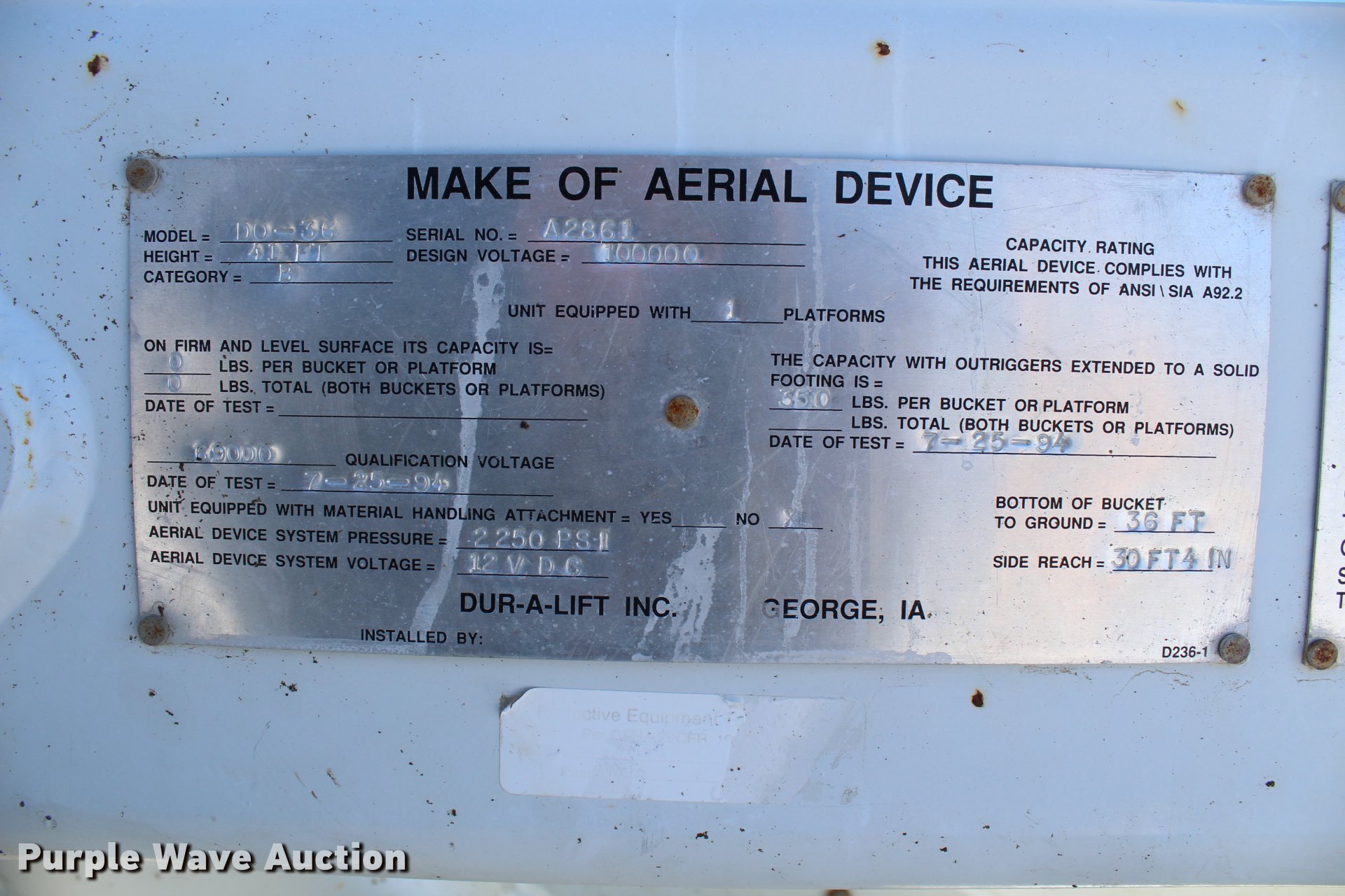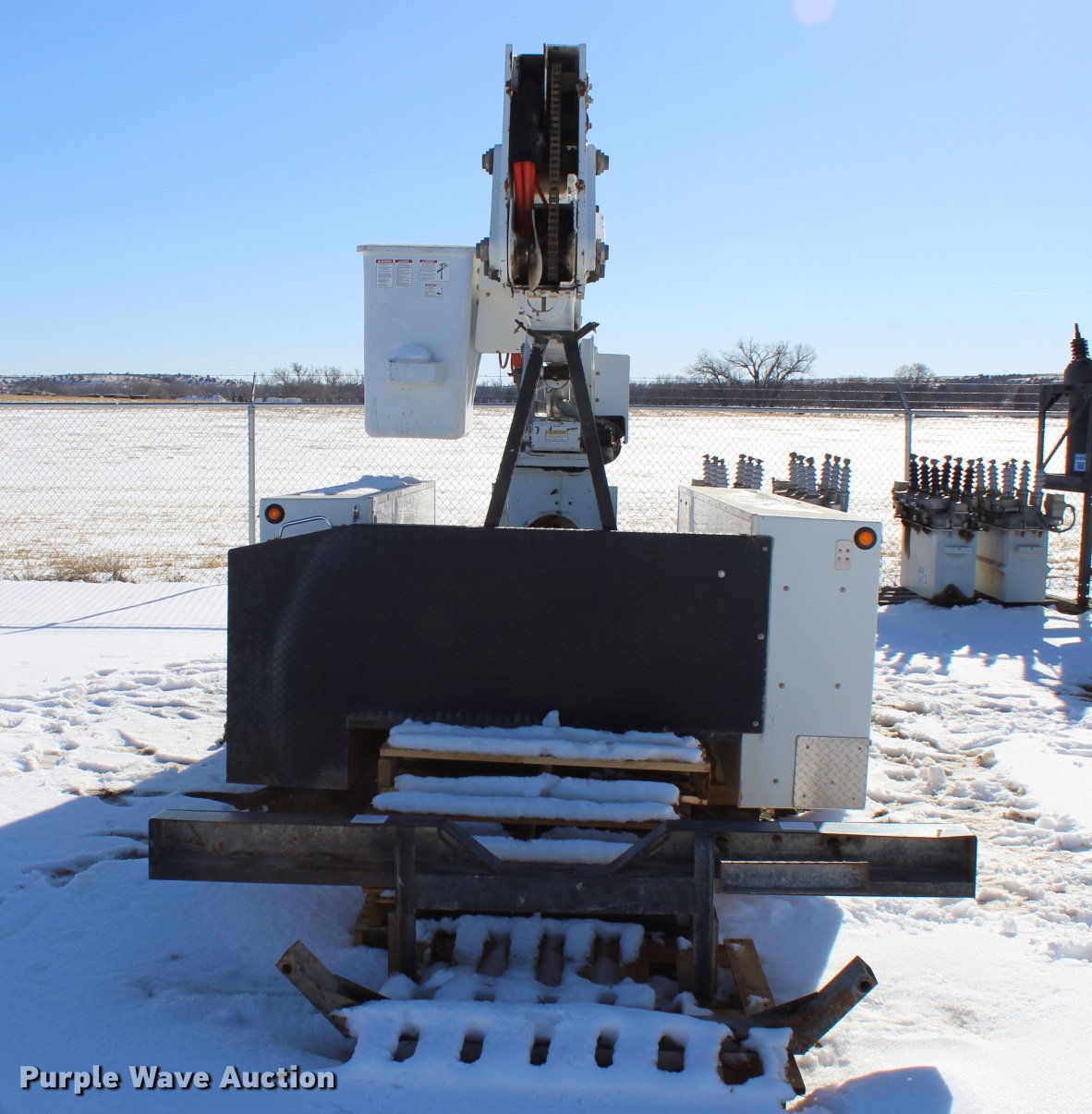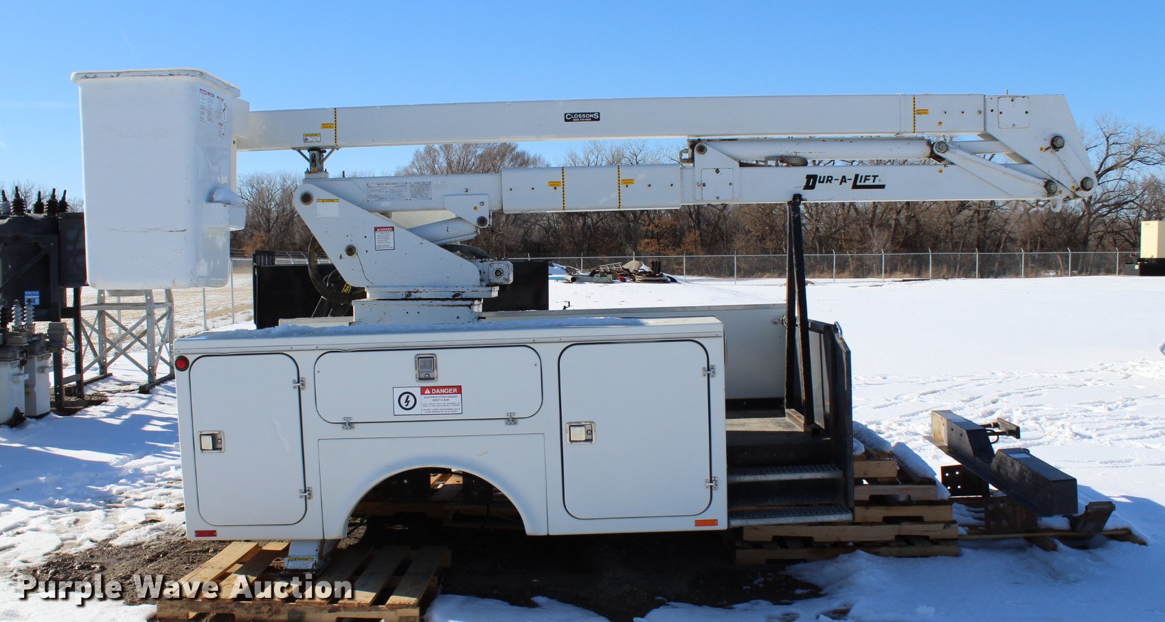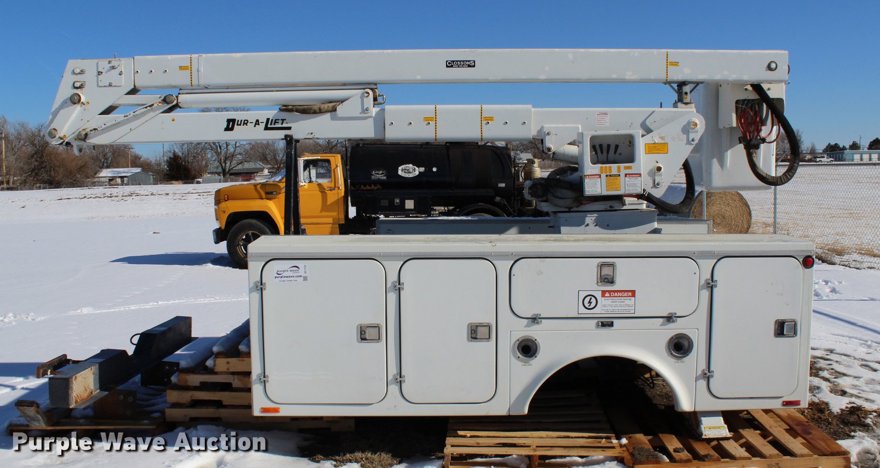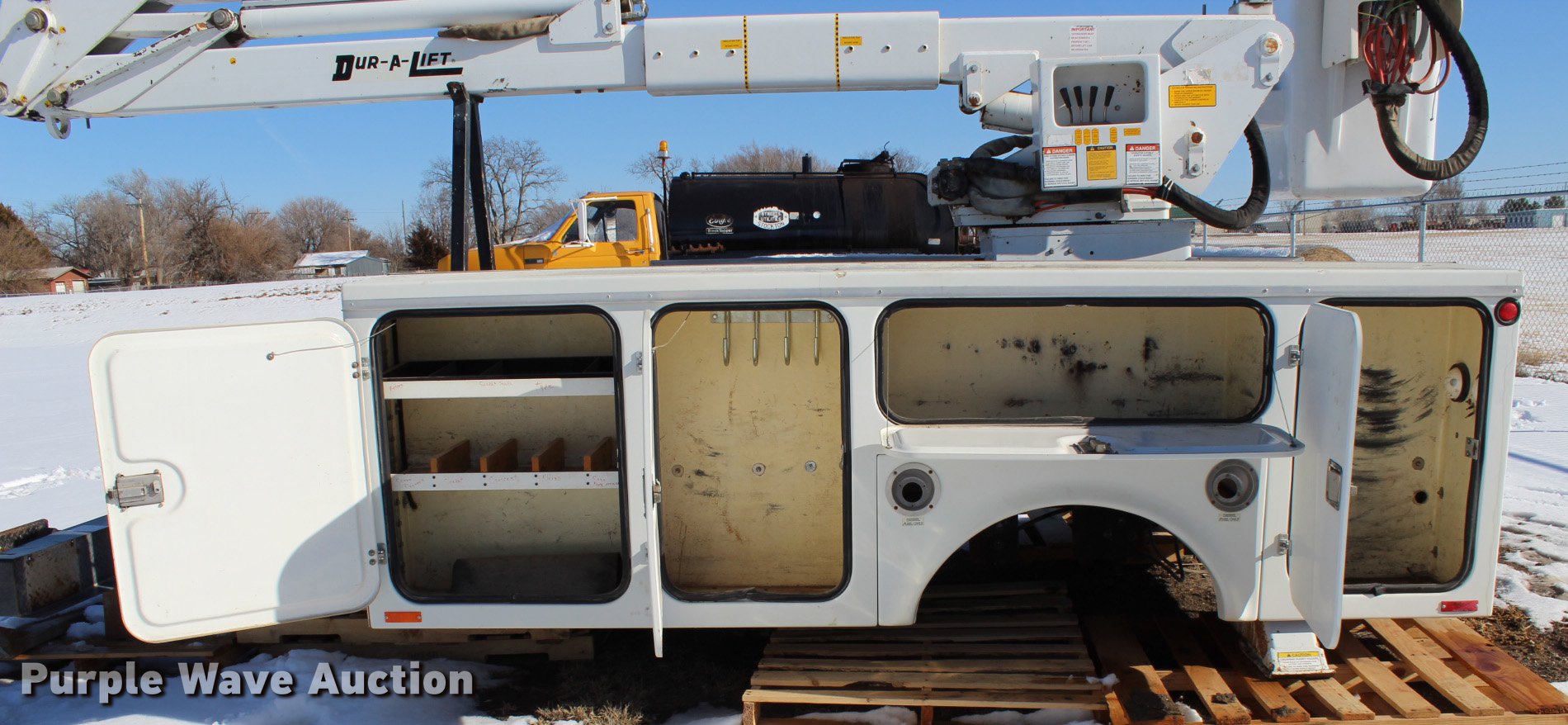 Purple Wave is selling a used Truck Part and Attach. in Kansas. This item is a Fibre Body utility bed with boom with the following: 11'L x 91"W, Shelving, 1994 Dur-A-Lift DO-36 boom, 36' boom length, 350 lbs max lift capacity, Man basket, 41' max lift height, Ground and platform boom controls, Boom rotation, Articulating boom, (2) outriggers, Serial A2861, Serial 6875