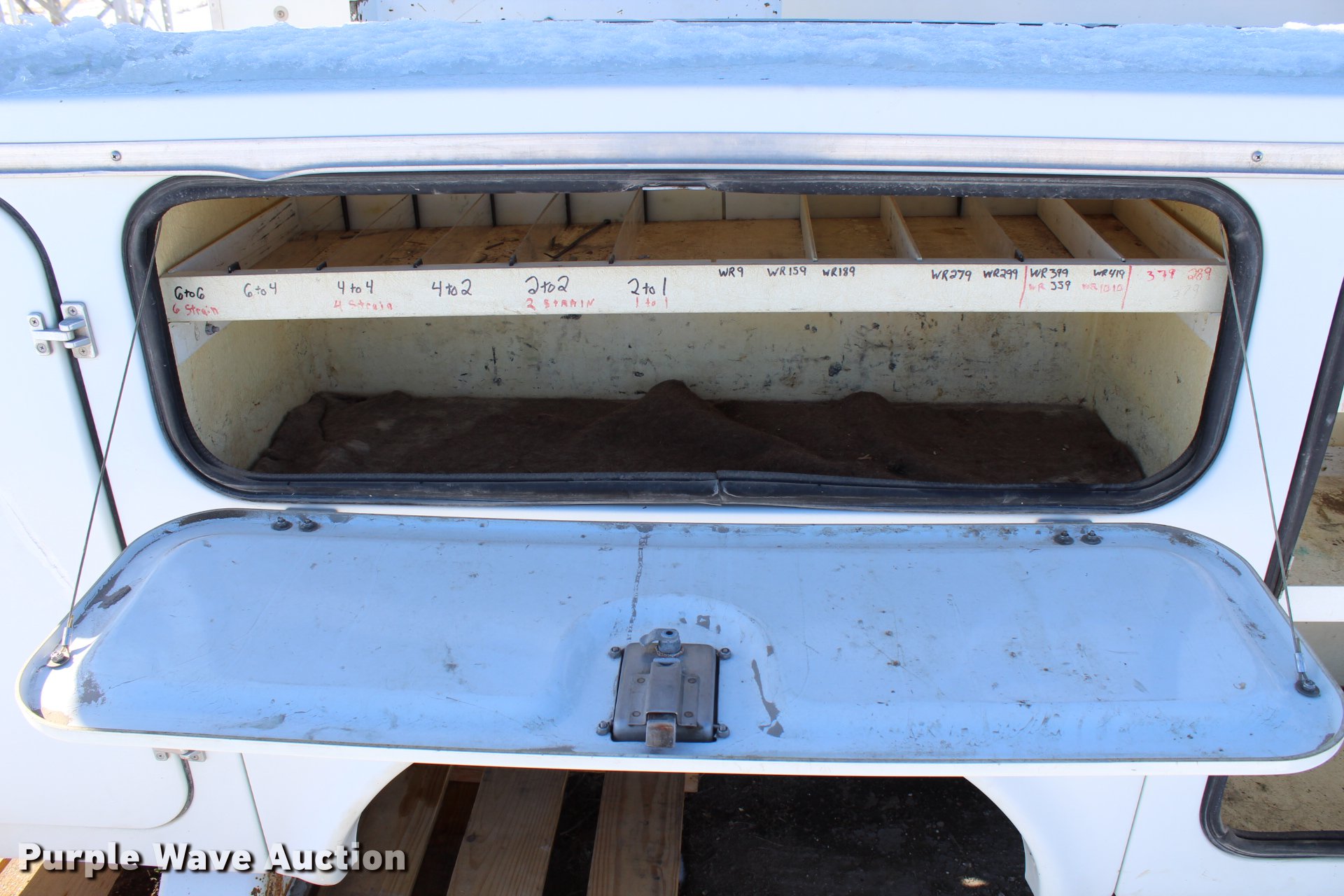 Fibre Body utility bed with boom. 11'L x 91"W Shelving, 1994 Dur-A-Lift DO-36 boom 36' boom length, 350 lbs max lift capacity, Man basket, 41' max lift height, Ground and platform boom controls, Boom rotation, Articulating boom, (2) outriggers, Serial A2861, Serial 6875. 200 S 6th St. Stockton, KS 67669