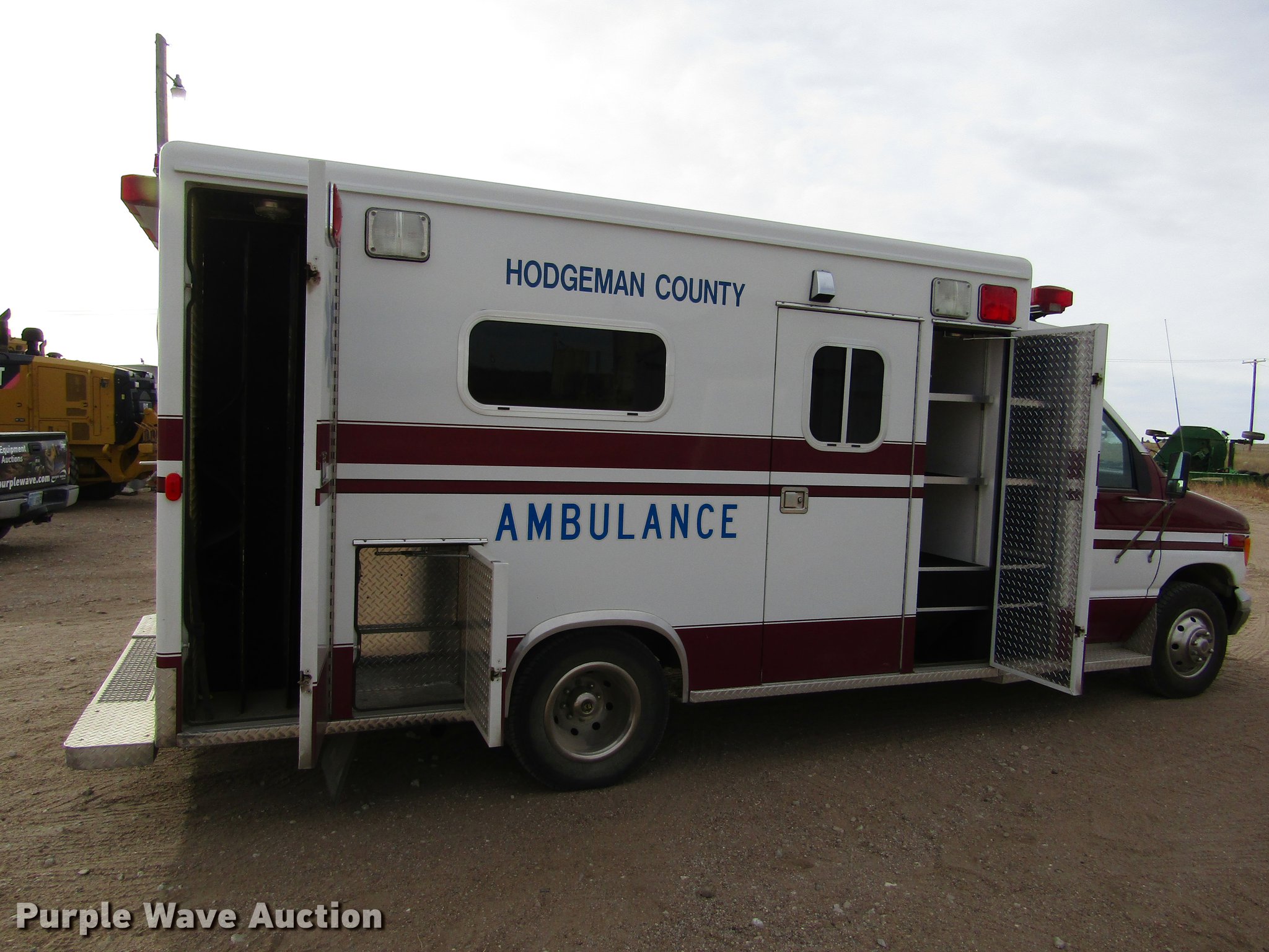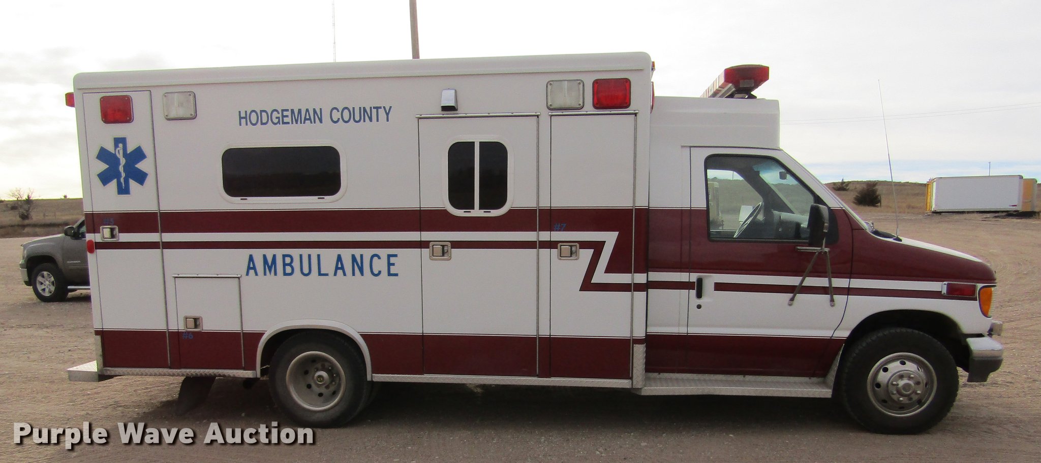 1994 Ford Econoline E350 ambulance. 73,541 miles on odometer, 7.3L V8 OHV 16V diesel engine, Automatic transmission, Single axle, AC and heat, AM/FM, Power windows and locks, Suspension seat, Emergency lights and sirens, Whelen PA/siren controls, McCoy Miller body LED interior lights, (3) oxygen hookups, LT225/75R16 tires, GVWR 11,500 lbs, Radios not included, will be removed prior to auction. Kansas title. 1FDKE30M0RHA38644. Hodgeman County. 500 Main St. Jetmore, KS 67854