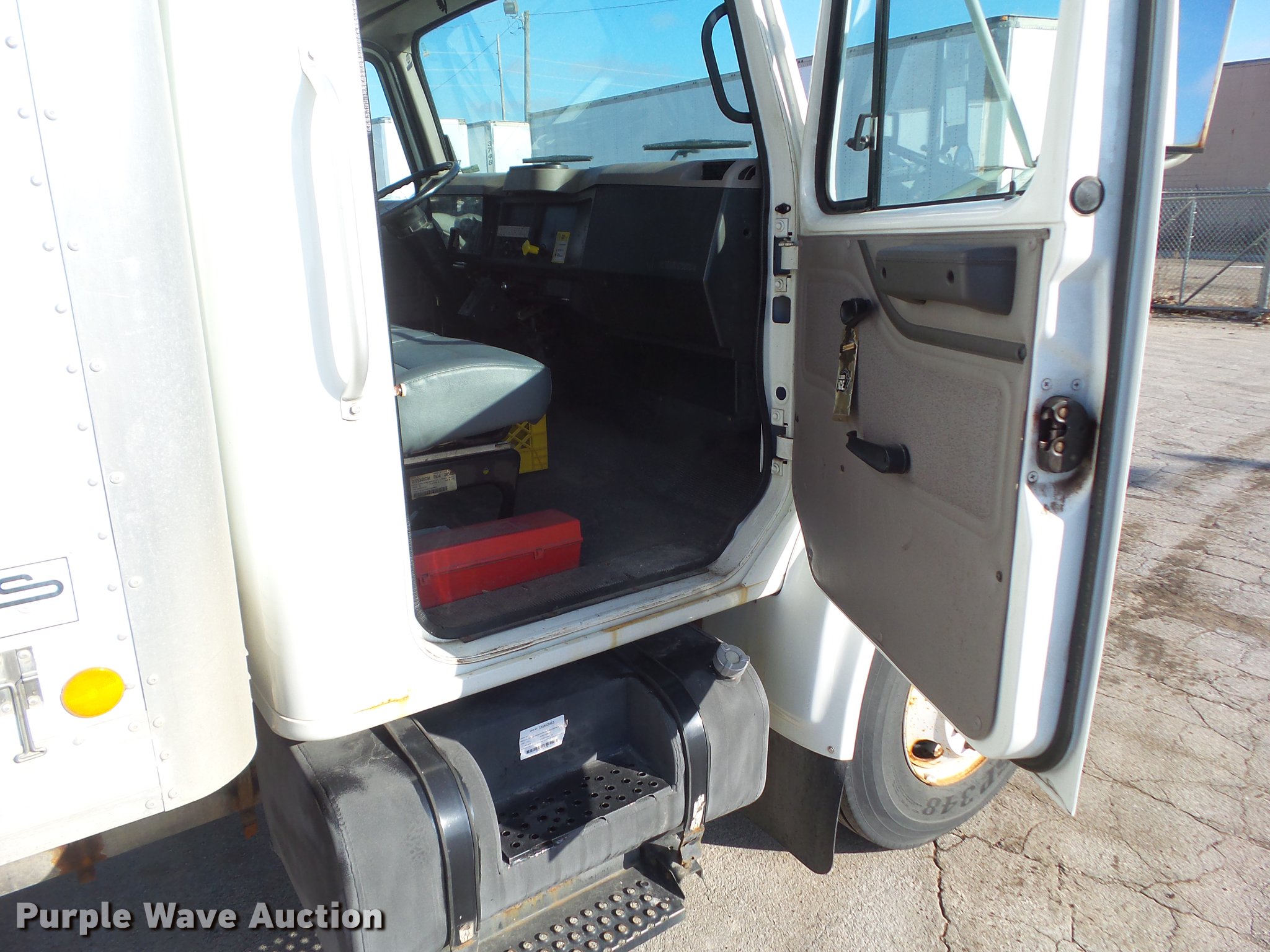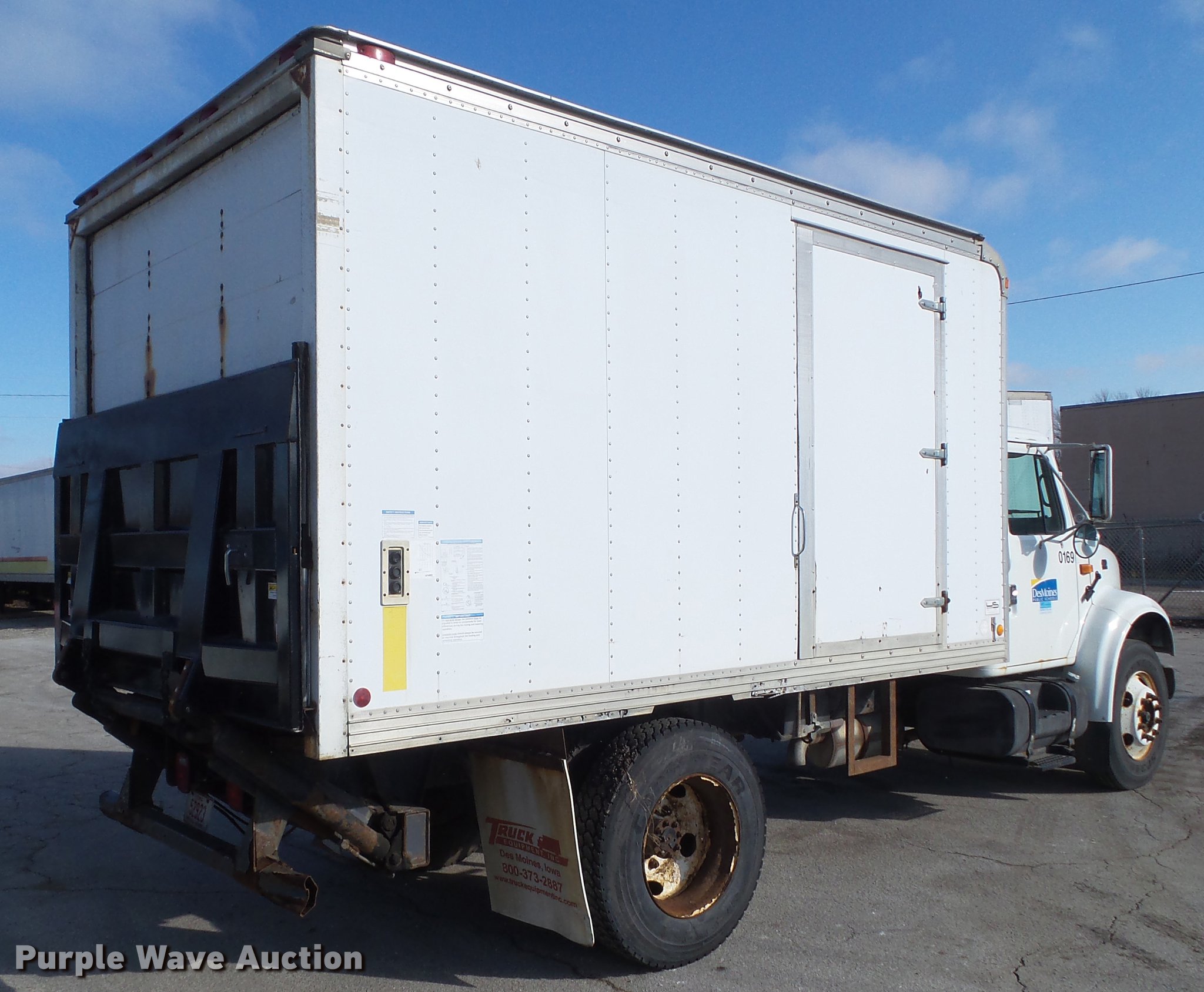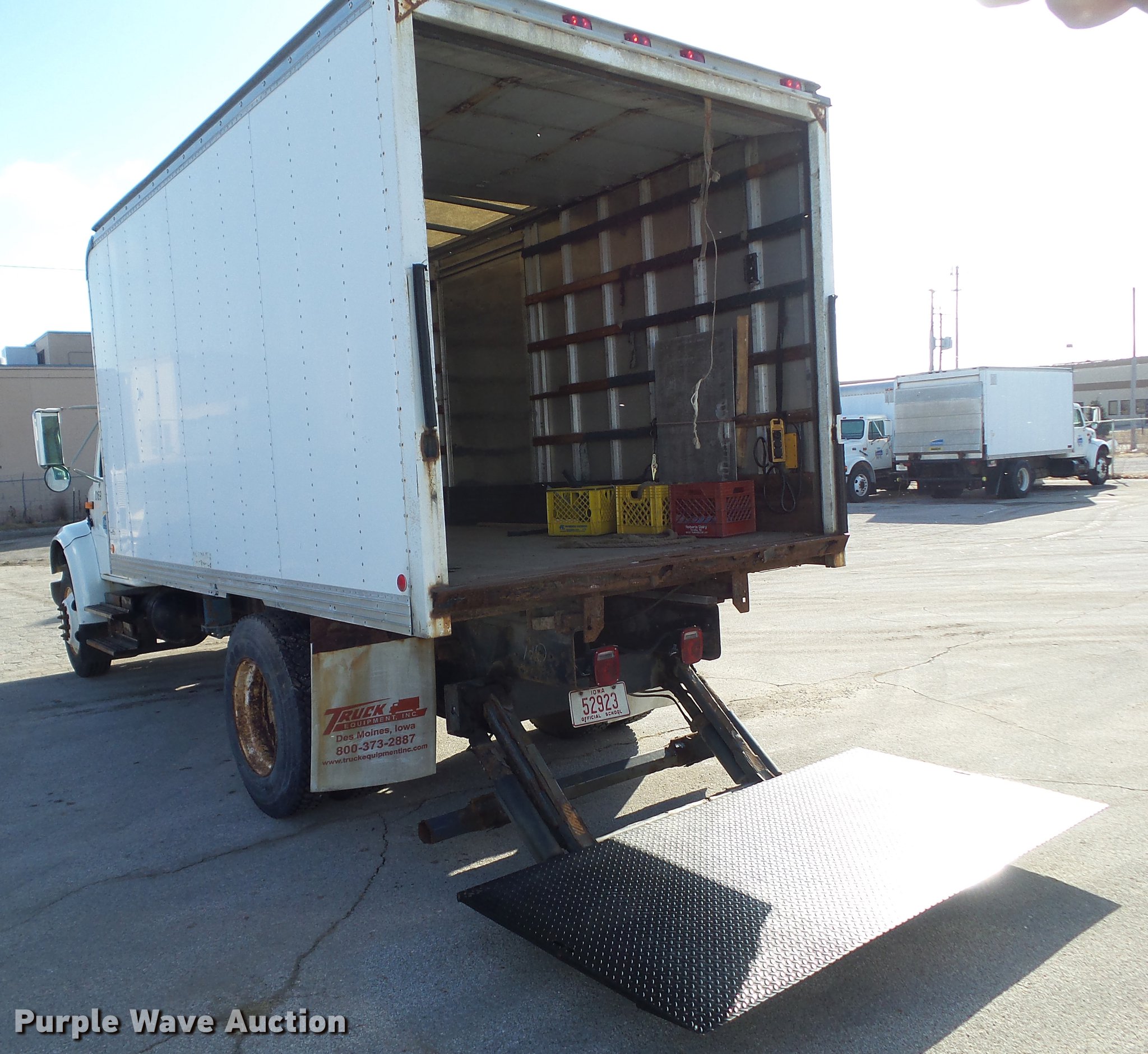 Purple Wave is selling a used Box Truck in Iowa. This item is a 2001 International 4700 box truck with the following: 43,215 miles on odometer, International T444E 7.3L V8 turbo diesel engine, 210 HP, Serial YNVXH0444ANB, Automatic transmission, Single axle, AC and heat, Suspension seat, Block heater, US Truck Body MW-552-3-K box bed, 14'L x 8'W, Wood floor, Rear roll up door, Swinging side door, Waltco end gate lift, Single fuel tank, Spring suspension, Air brakes, 176" wheelbase, 10R22.5 tires, GVWR 23,500 lbs