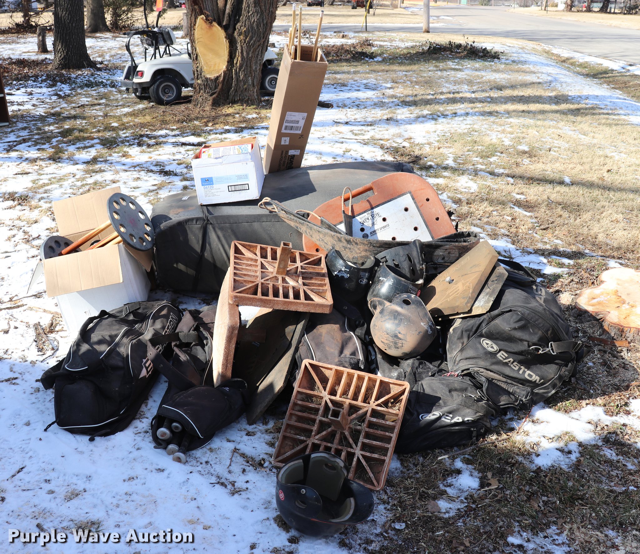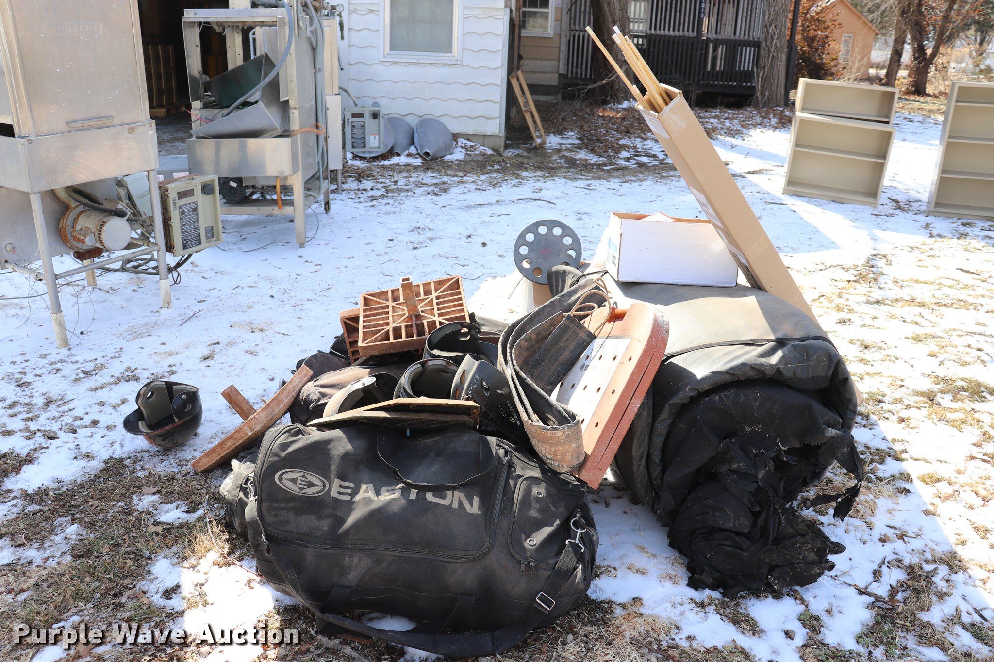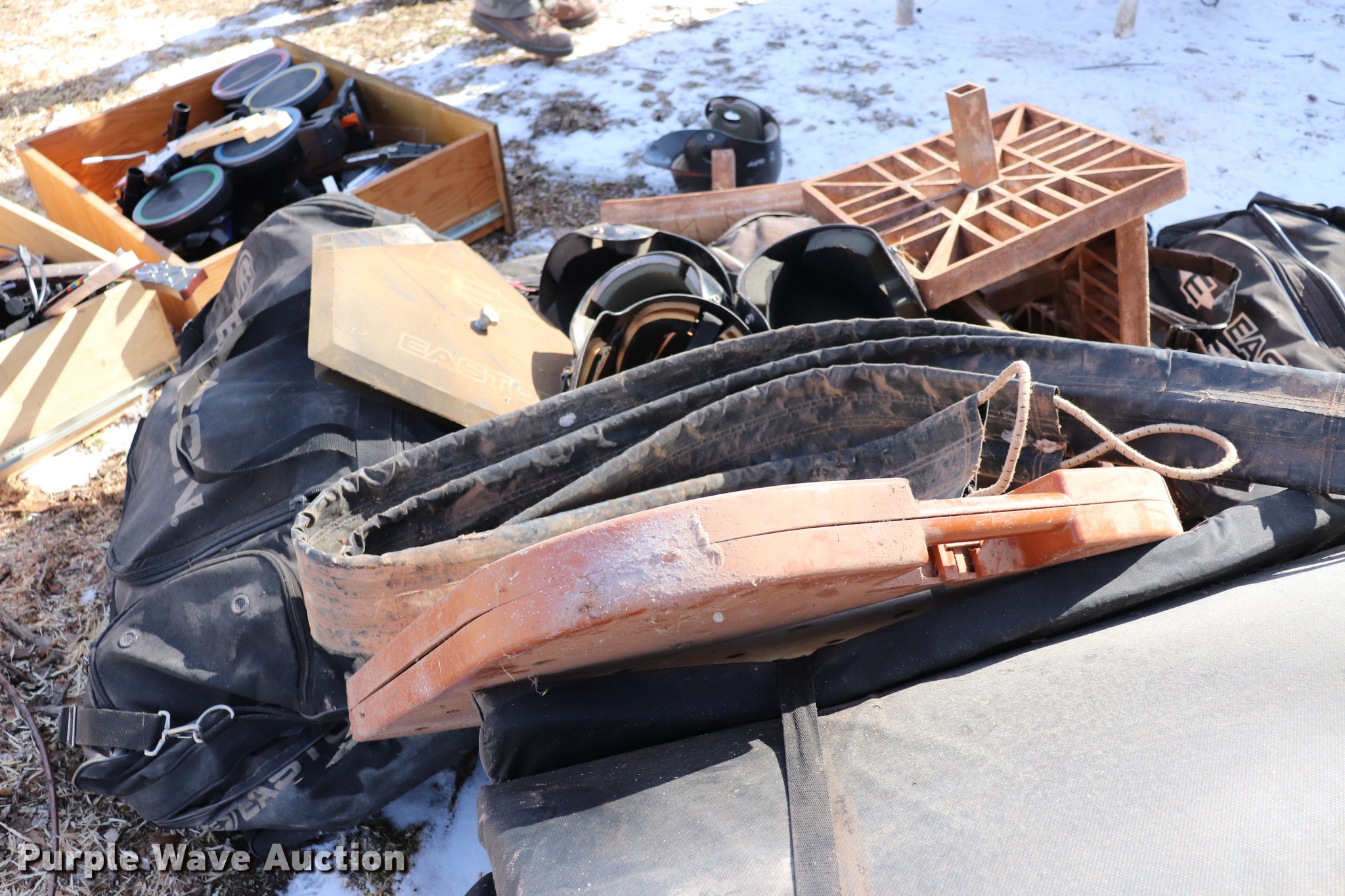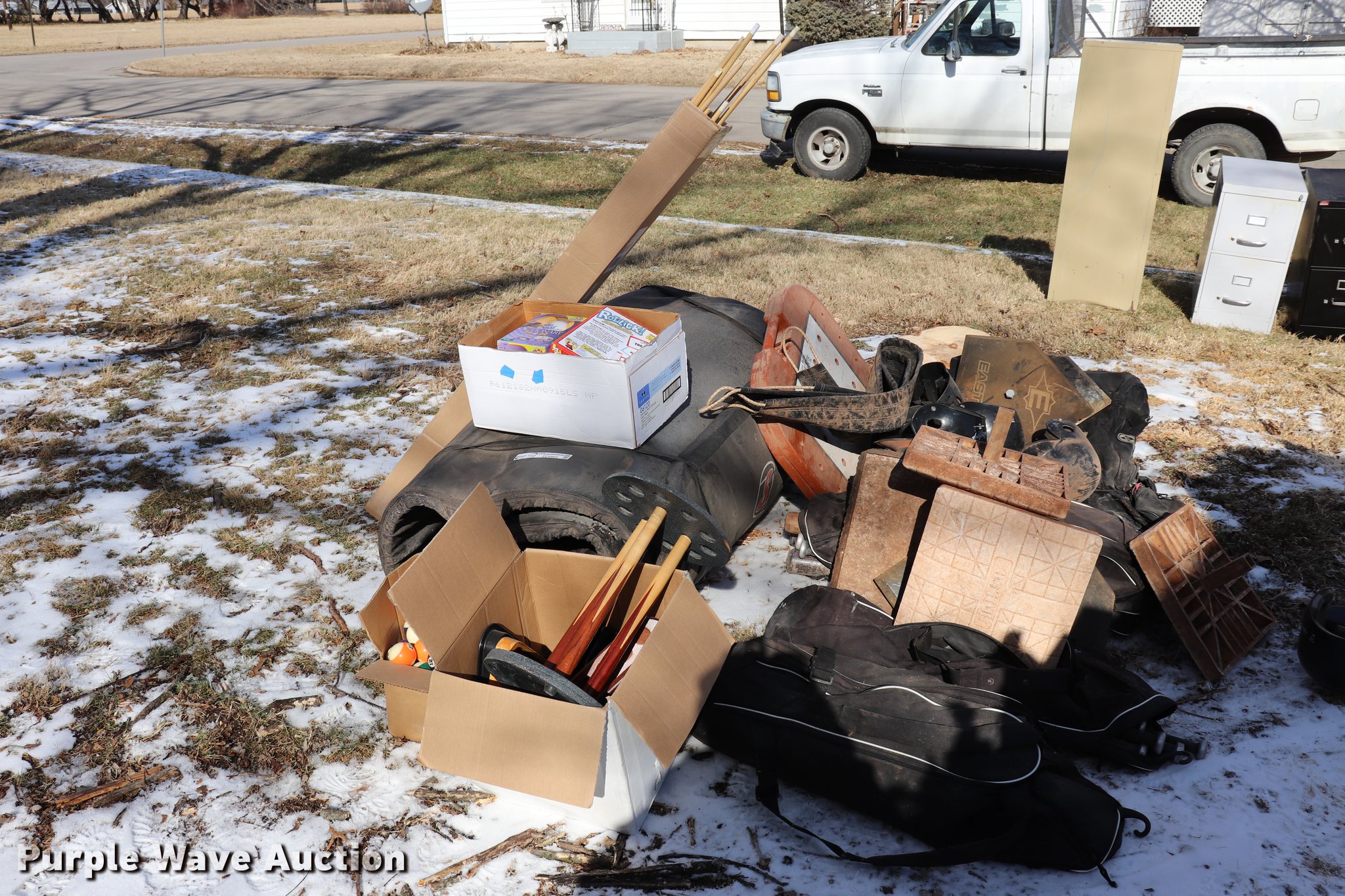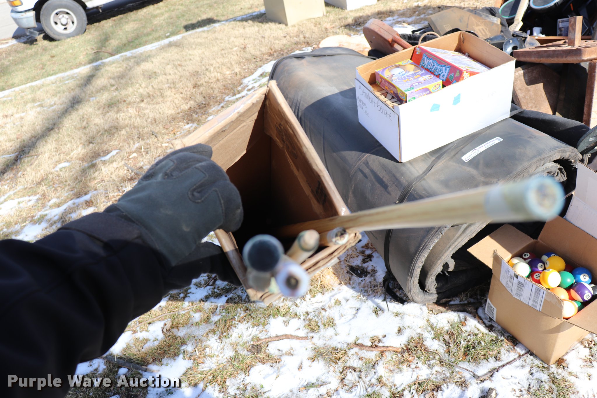 Purple Wave is selling a used Sporting Goods in Kansas. This item is a Sporting goods with the following: Pool cues, Softball equipment, Bases, Bats, Helmets, Bat bags, Mats, Assorted board games, Electronic games, Wrestling mat