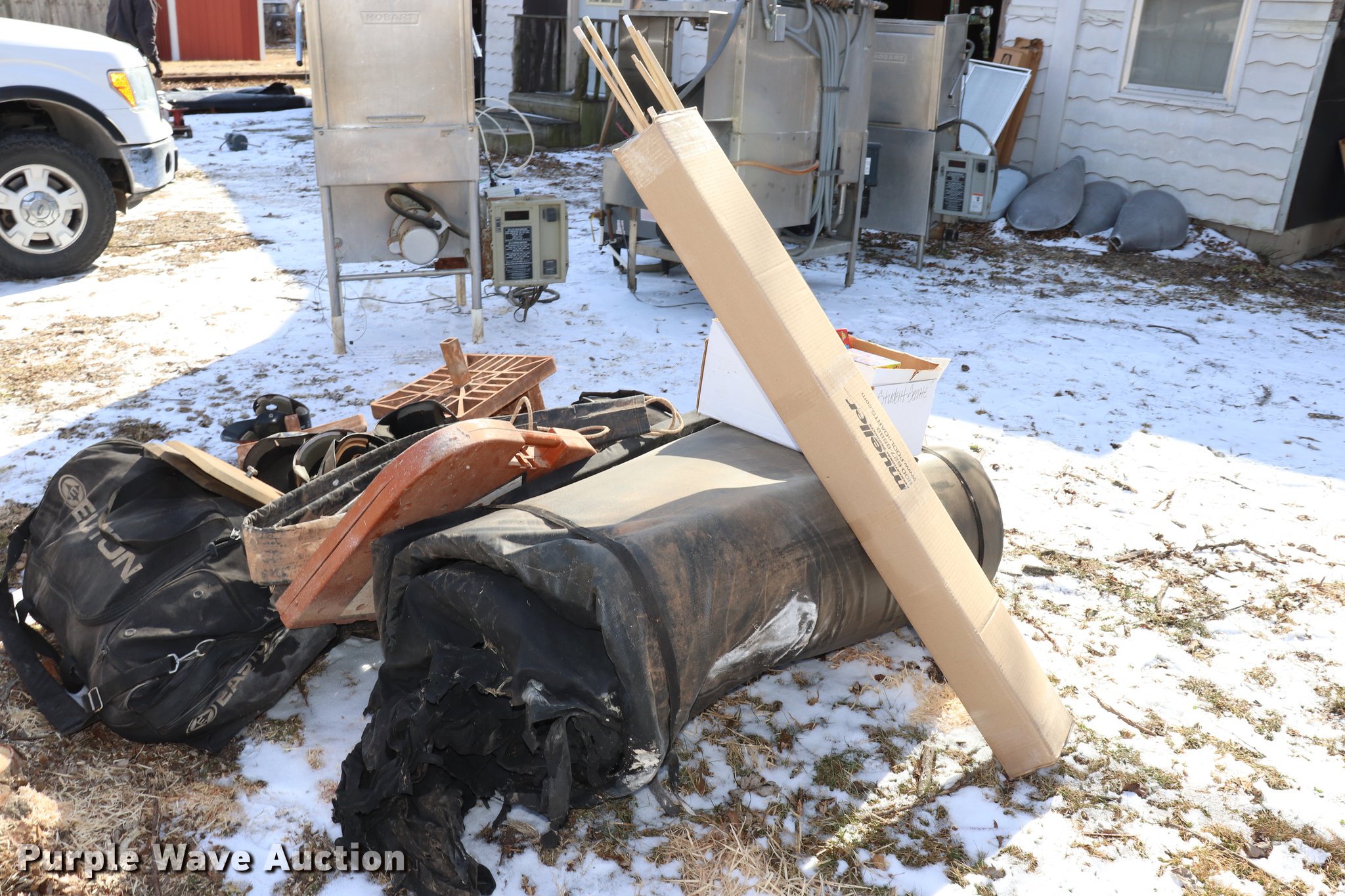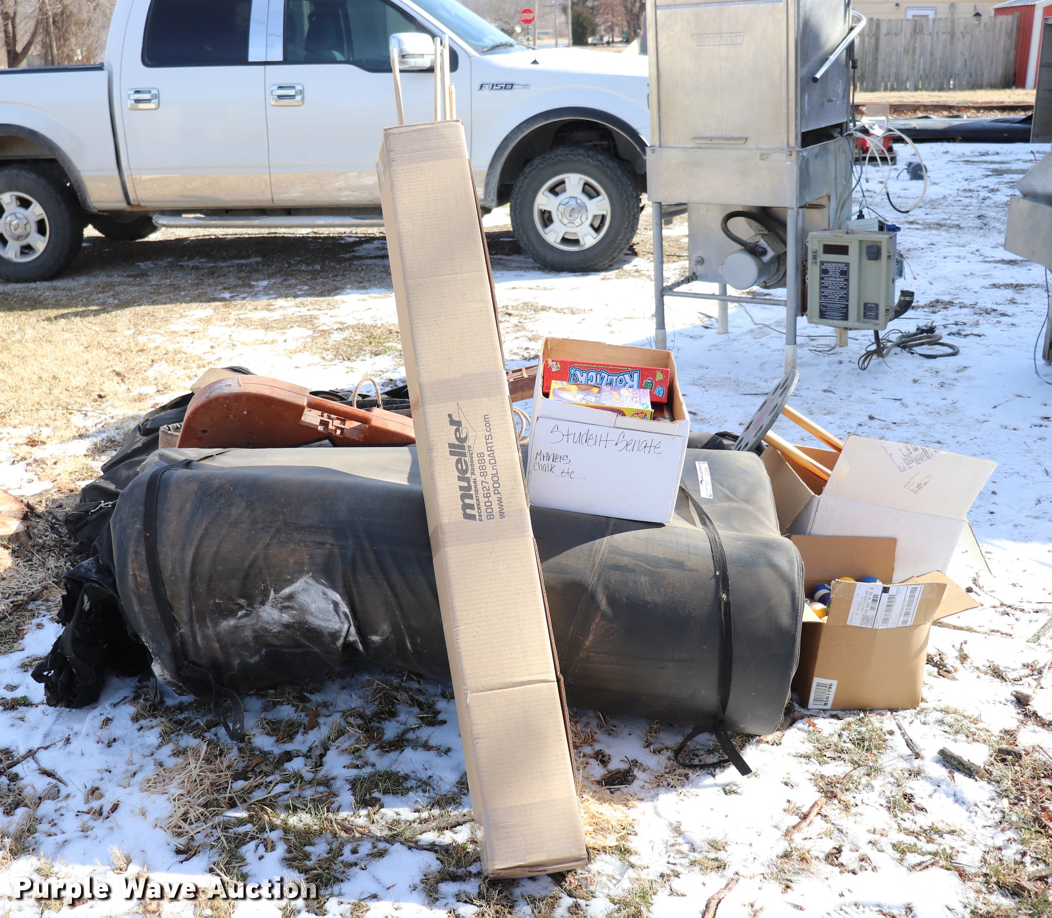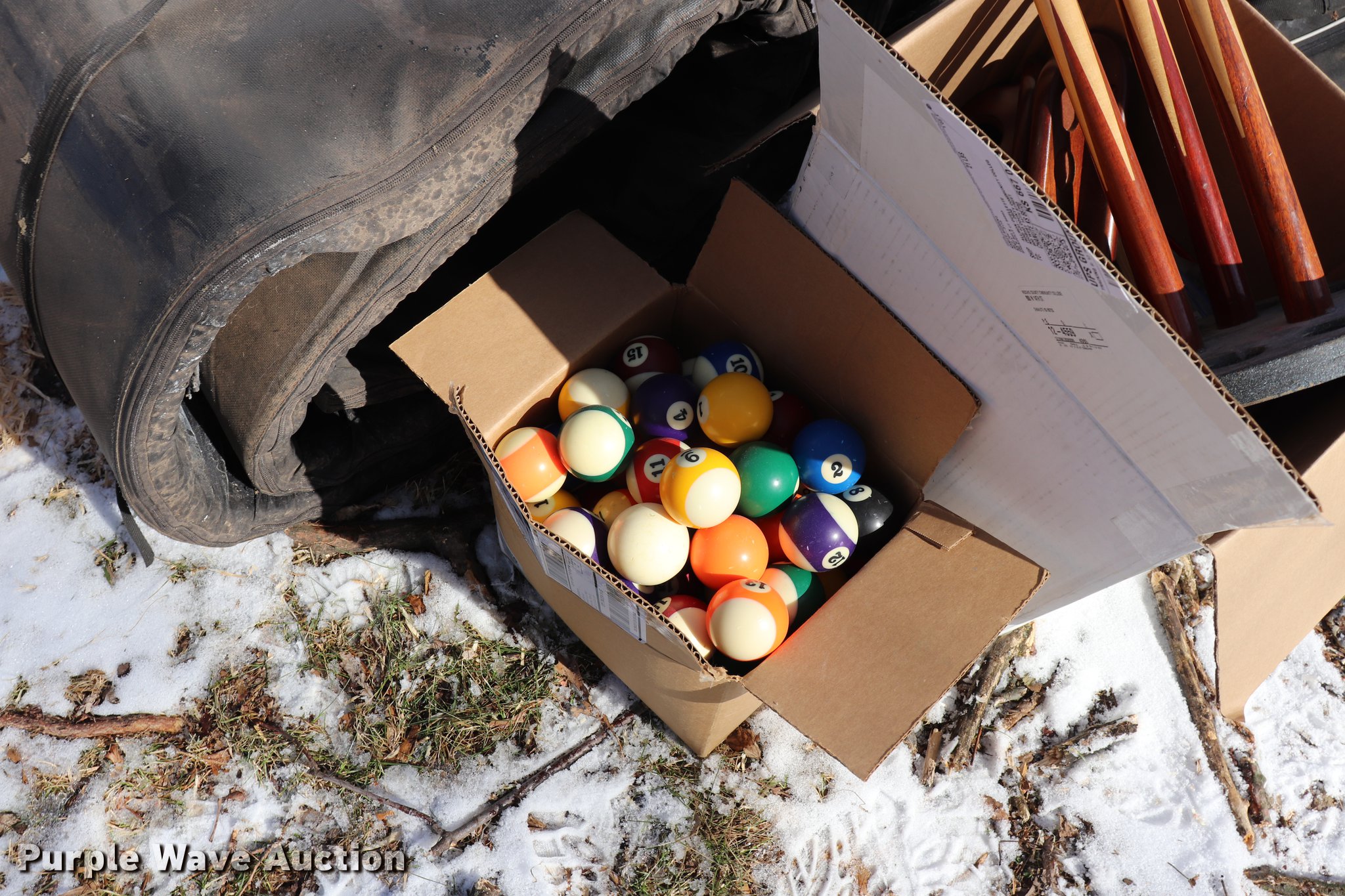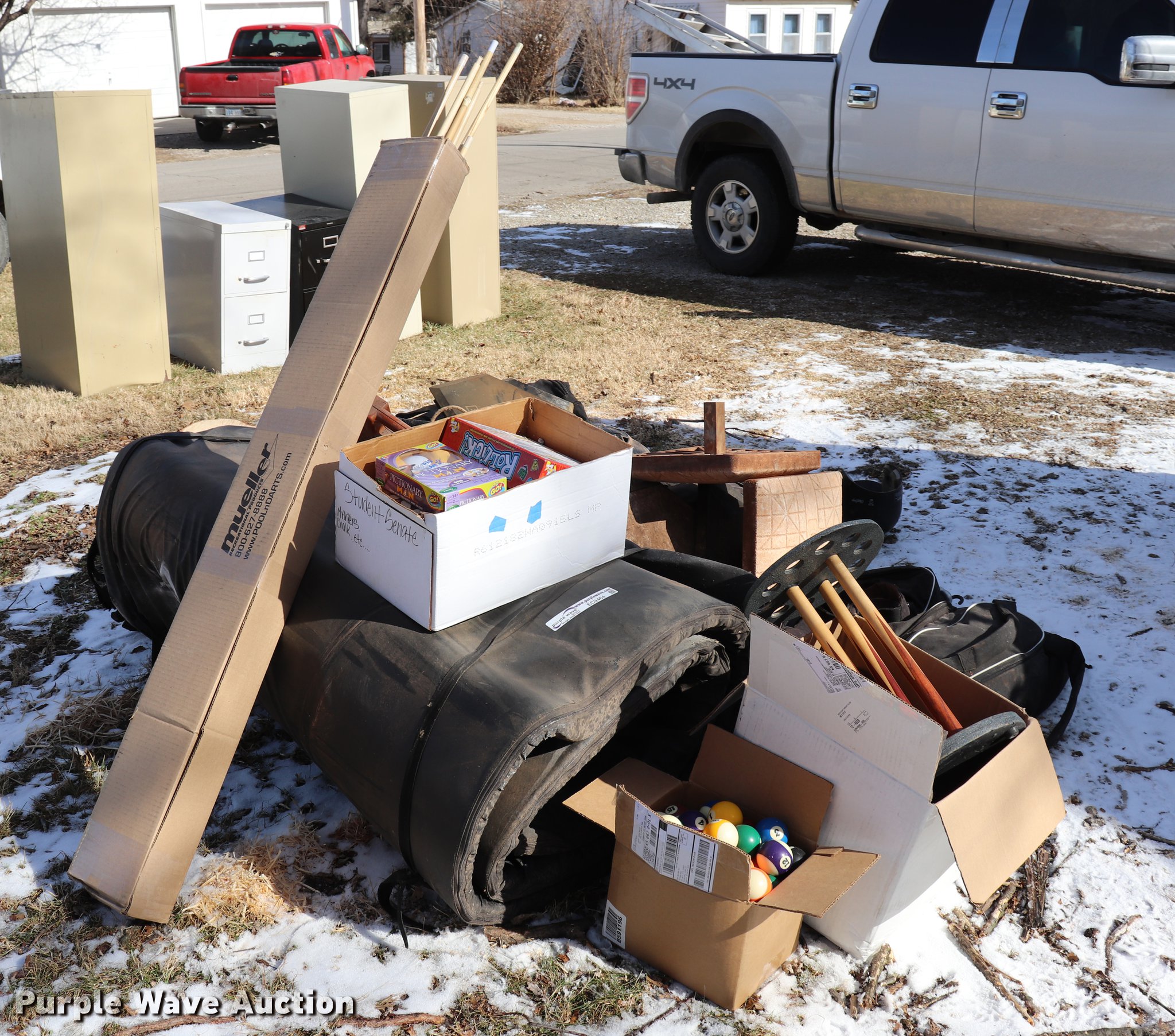 Purple Wave is selling a used Sporting Goods in Kansas. This item is a Sporting goods with the following: Pool cues, Softball equipment, Bases, Bats, Helmets, Bat bags, Mats, Assorted board games, Electronic games, Wrestling mat