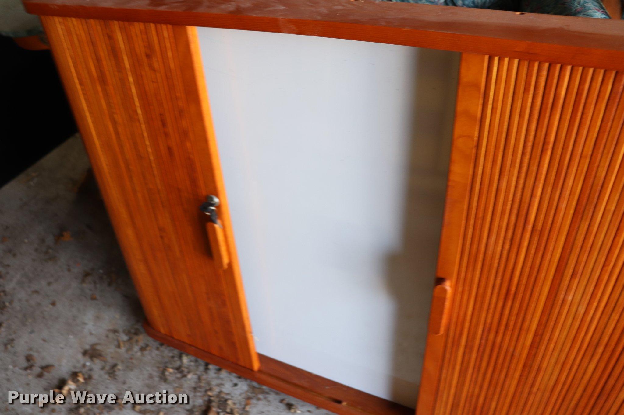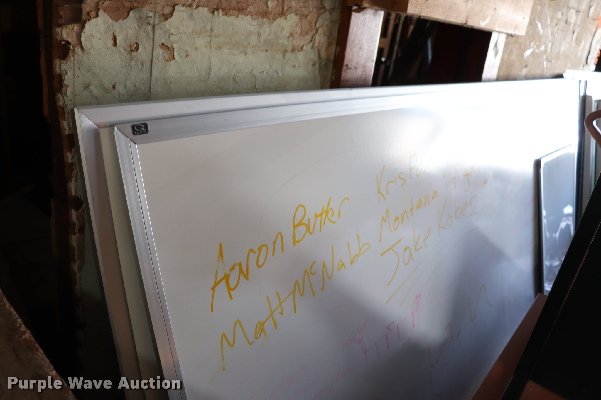 Purple Wave is selling a used Furniture in Kansas. This item is a Furniture with the following: Approx. 8 chairs, Metal corner desk, Four drawers, (2) whiteboards, 4' x 8', Cabinet mounted whiteboard, (3) rolls of vinyl wood flooring