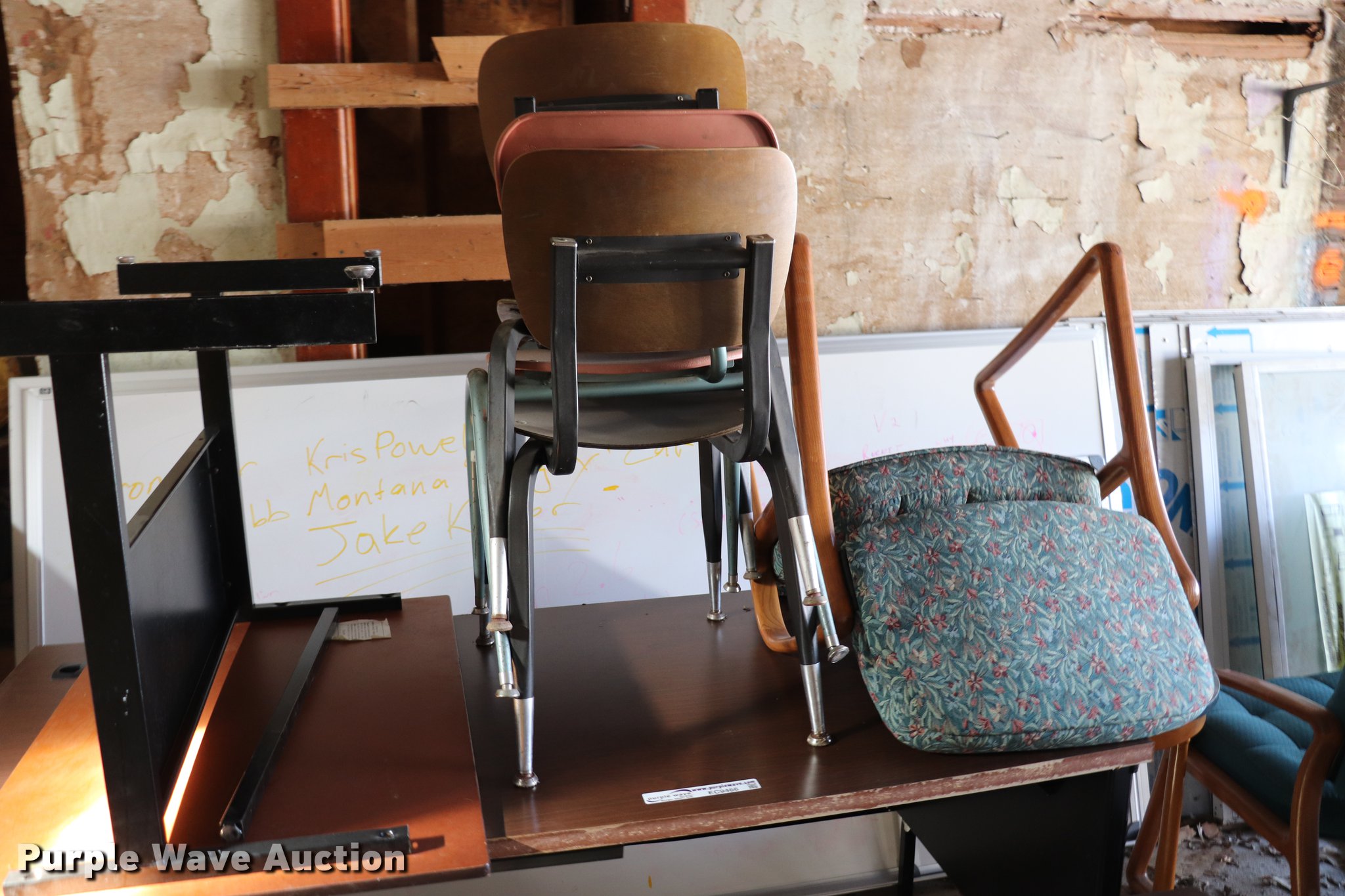 Furniture. Approx. 8 chairs, Metal corner desk Four drawers, (2) whiteboards 4' x 8', Cabinet mounted whiteboard, (3) rolls of vinyl wood flooring. Neosho County Community College. 800 W 14th St. Chanute, KS 66720
