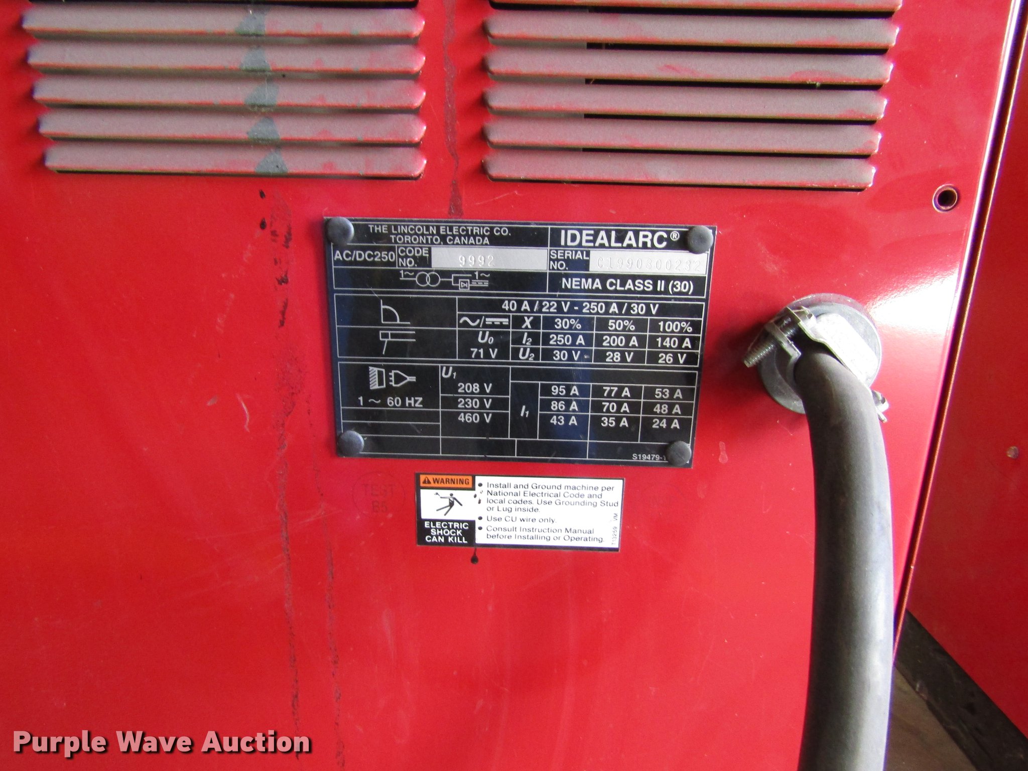 Purple Wave is selling a used Welder (Manual) in Kansas. This item is a Lincoln Idealarc 250 welder with the following: 230V, Serial C1990300232