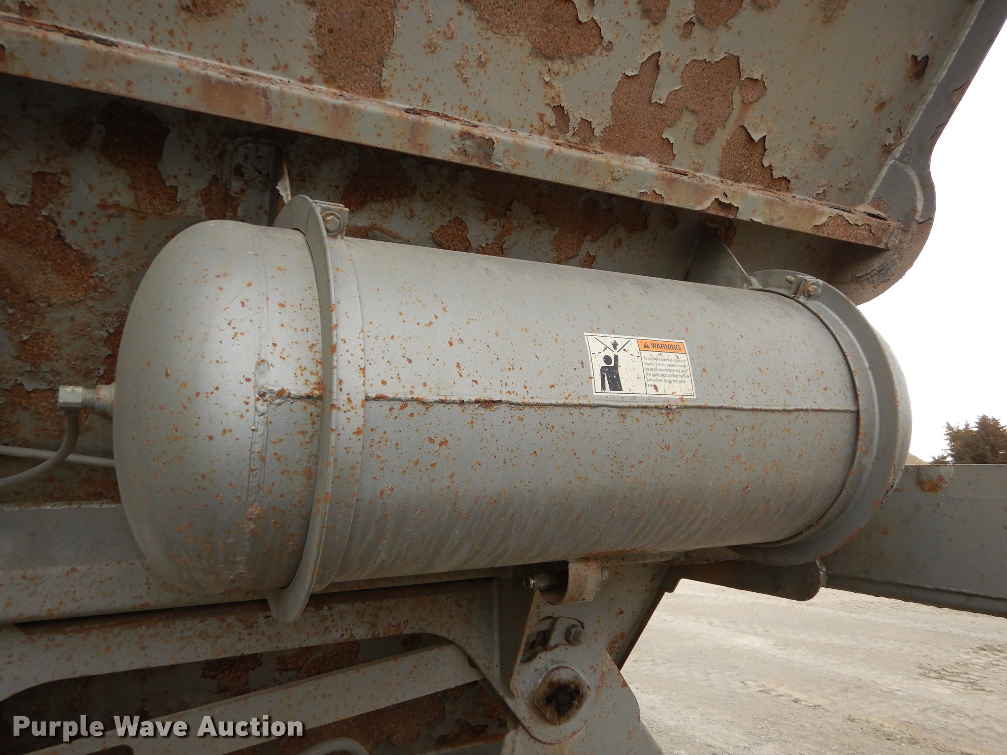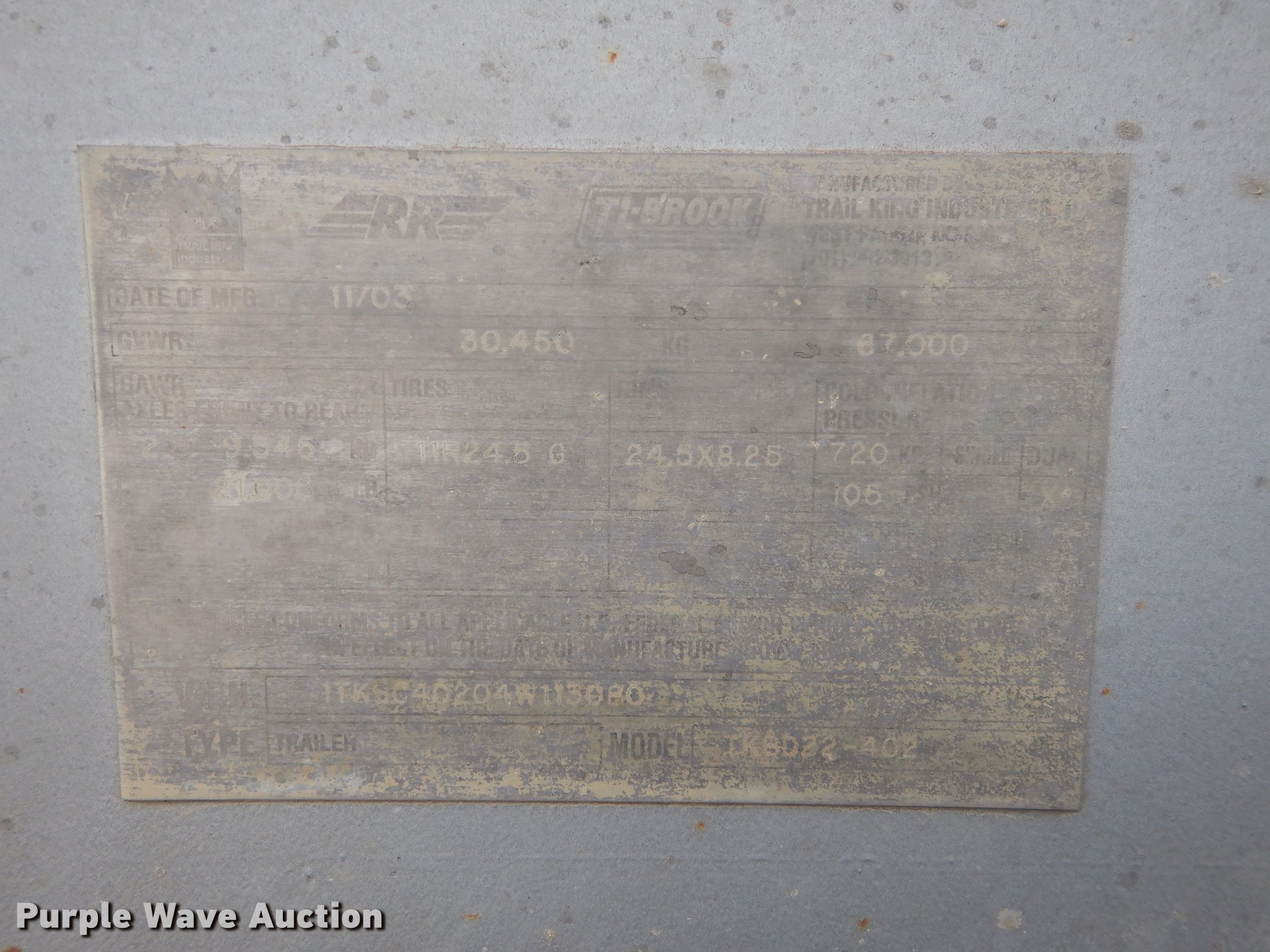 Purple Wave is selling a used Bottom Dump Trailer in Kansas. This item is a 2004 Trail King TKBD22-402 bottom dump trailer with the following: 22 cu. yd. capacity, Aero roll tarp, Rear push bar, Pivoting front hitch, Trailer wiring, Spring suspension, Air brakes, Tandem axle, 295/75R22.5 tires, GVWR 67,000 lbs, Unit# 10-7