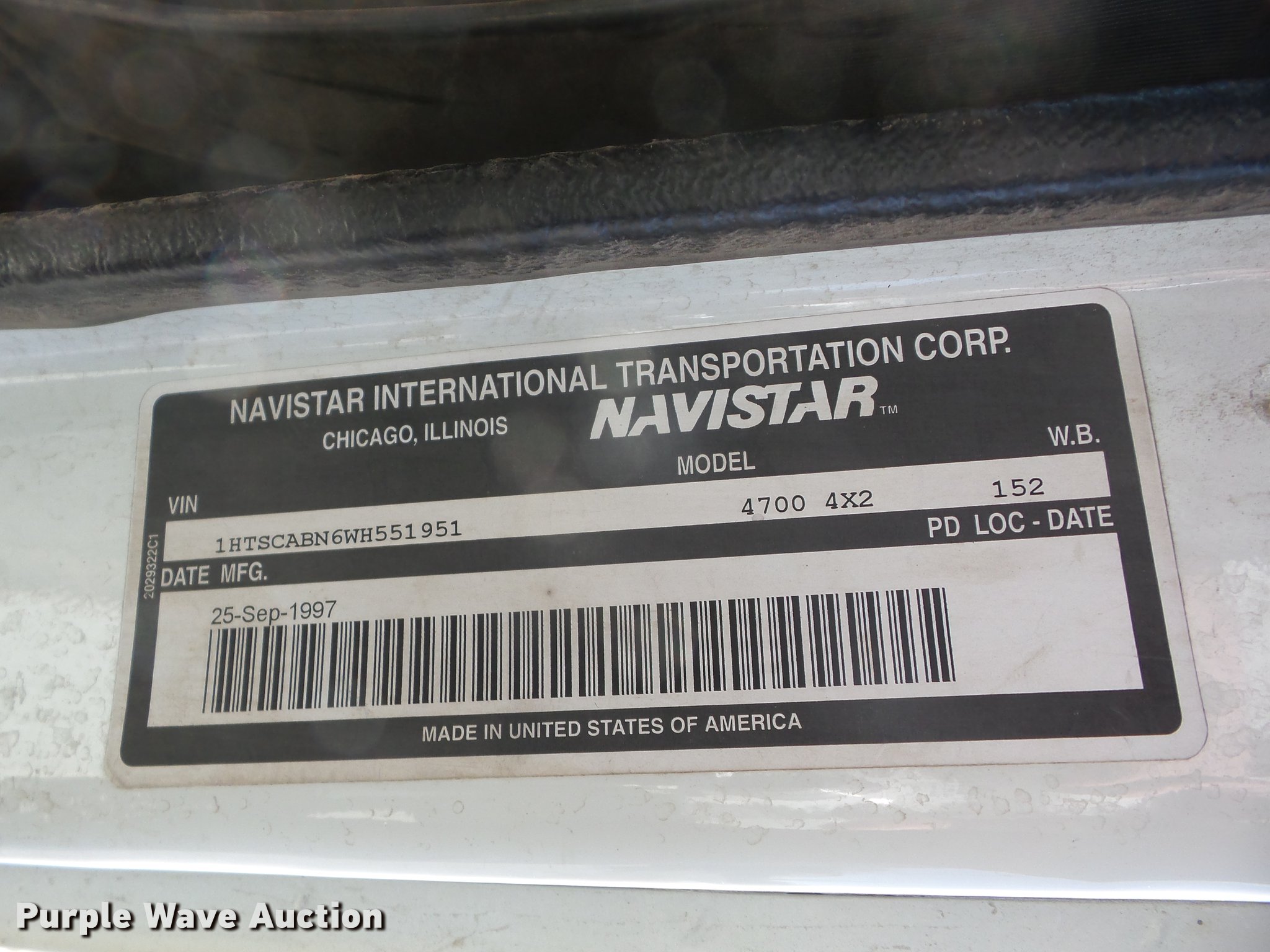 Purple Wave is selling a used Street Sweeper Truck in Missouri. This item is a 1998 International 4700 street sweeper truck with the following: 30,458 miles on odometer, 6,811 hours on meter, International T444E 7.3L V8 turbo diesel engine, Automatic transmission, AC and heat, Cruise, Dual operators stations, Live PTO, 1997 Schwarze A7000 street sweeper, John Deere four cylinder engine, 8.4 cu. ft. hopper, 11.5' sweep, Dual lift cylinders, Serial 97A70000122, Air brakes, 11R22.5 tires, GVWR 27,000 lbs, FAWR 8,000 lbs, RAWR 19,000 lbs, Water sprayer is weak