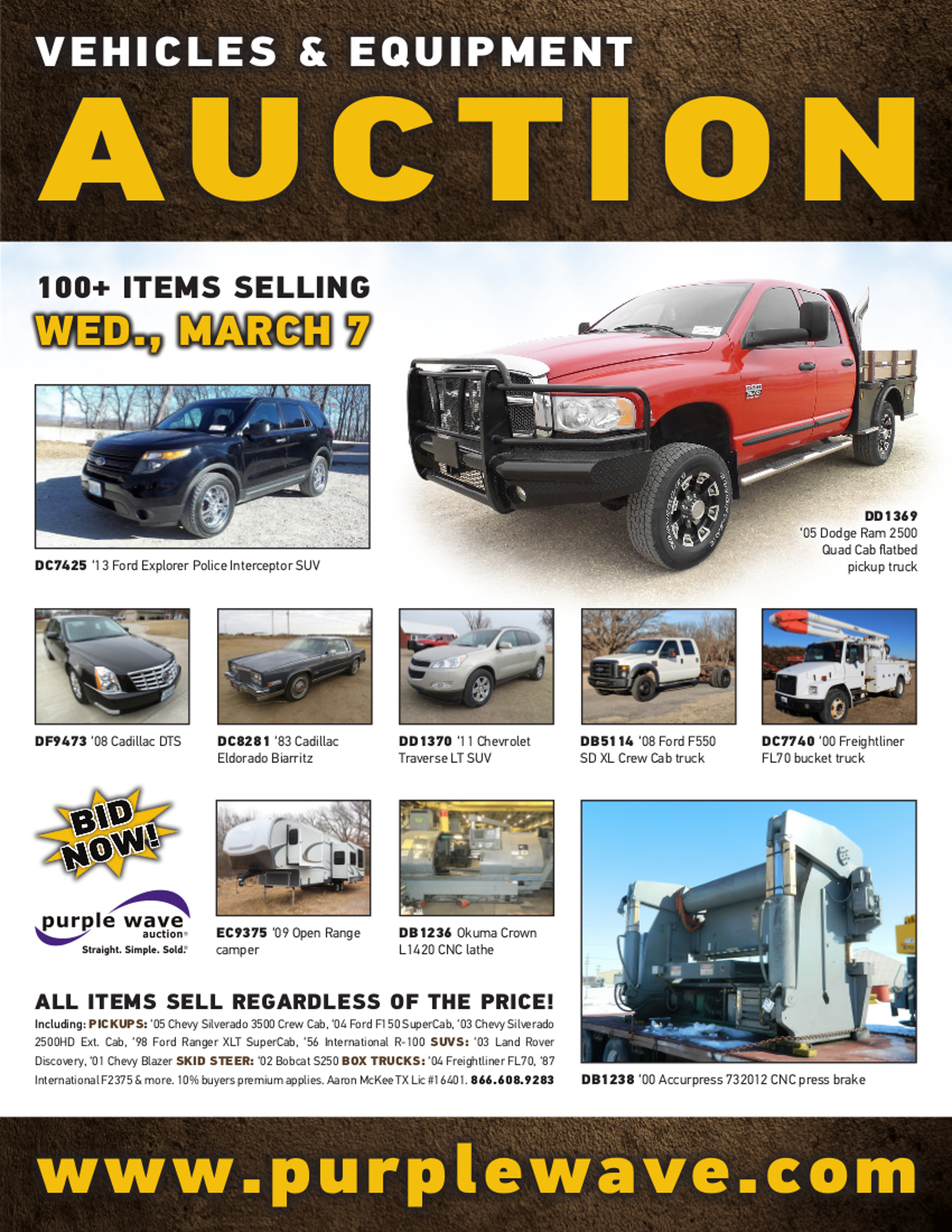 This auction is conducted by Purple Wave, Inc., whose home office is 825 Levee Drive, Manhattan, Kansas. Aaron McKee, Texas auctioneer license # 16401, operates Purple Wave, Inc. Complaints against us may be directed to the Texas Department of Licensing and Regulation, P.O. Box 12157, Austin, Texas 78711, (512) 463-6599. For additional required information, see the attached document.