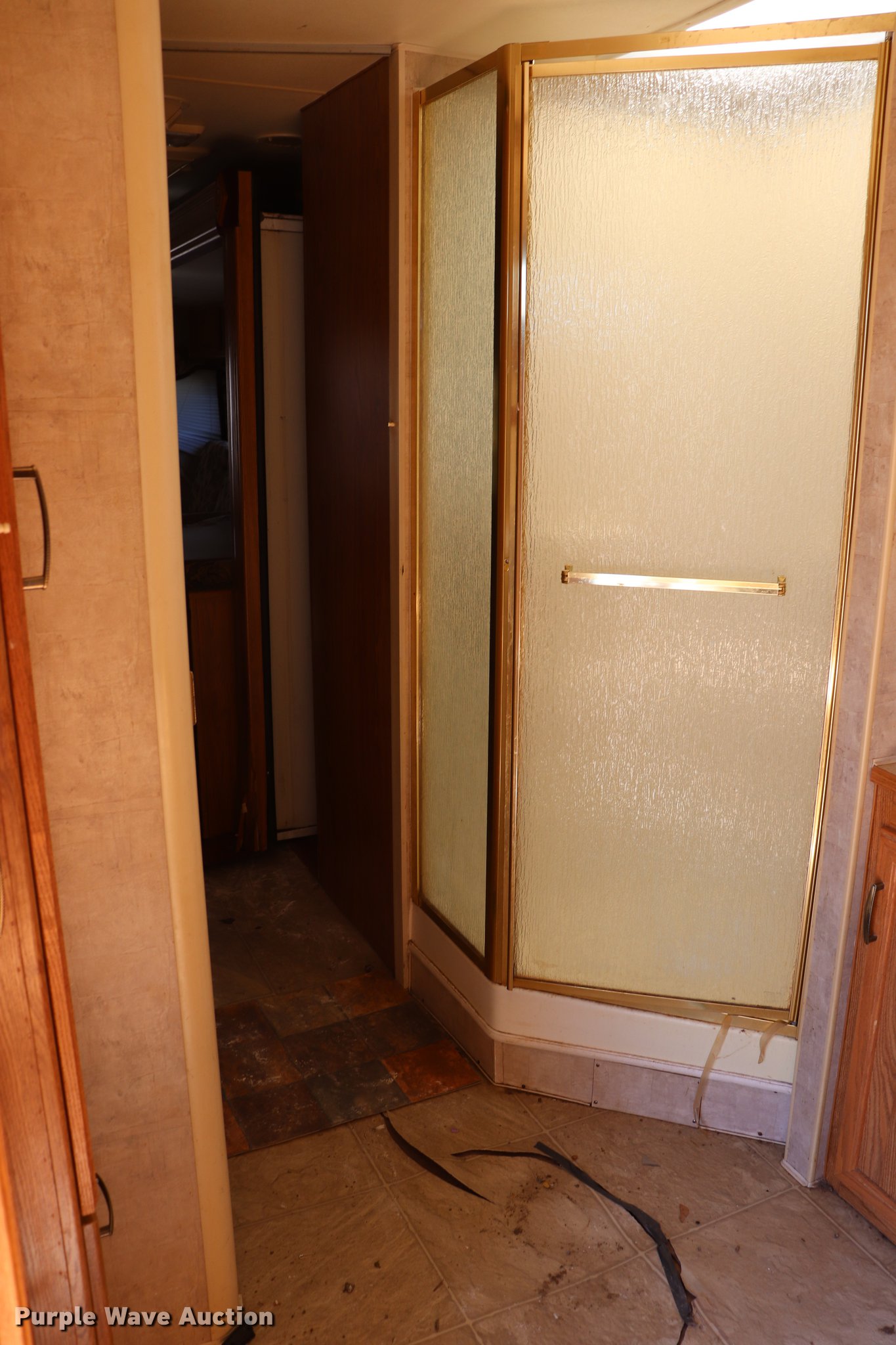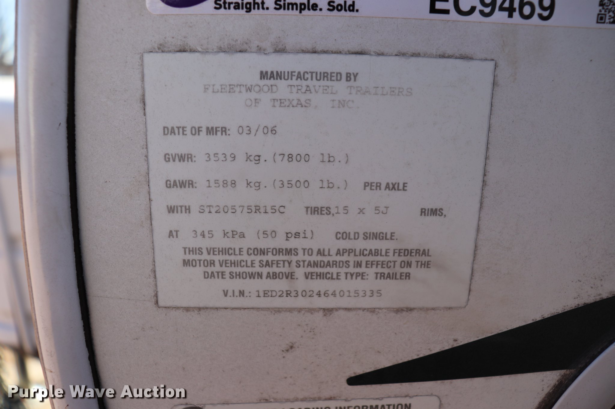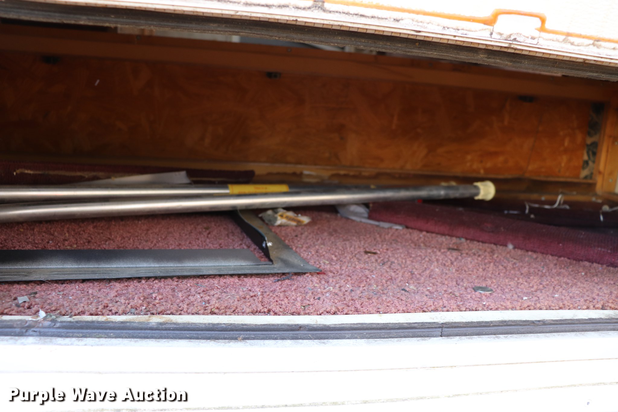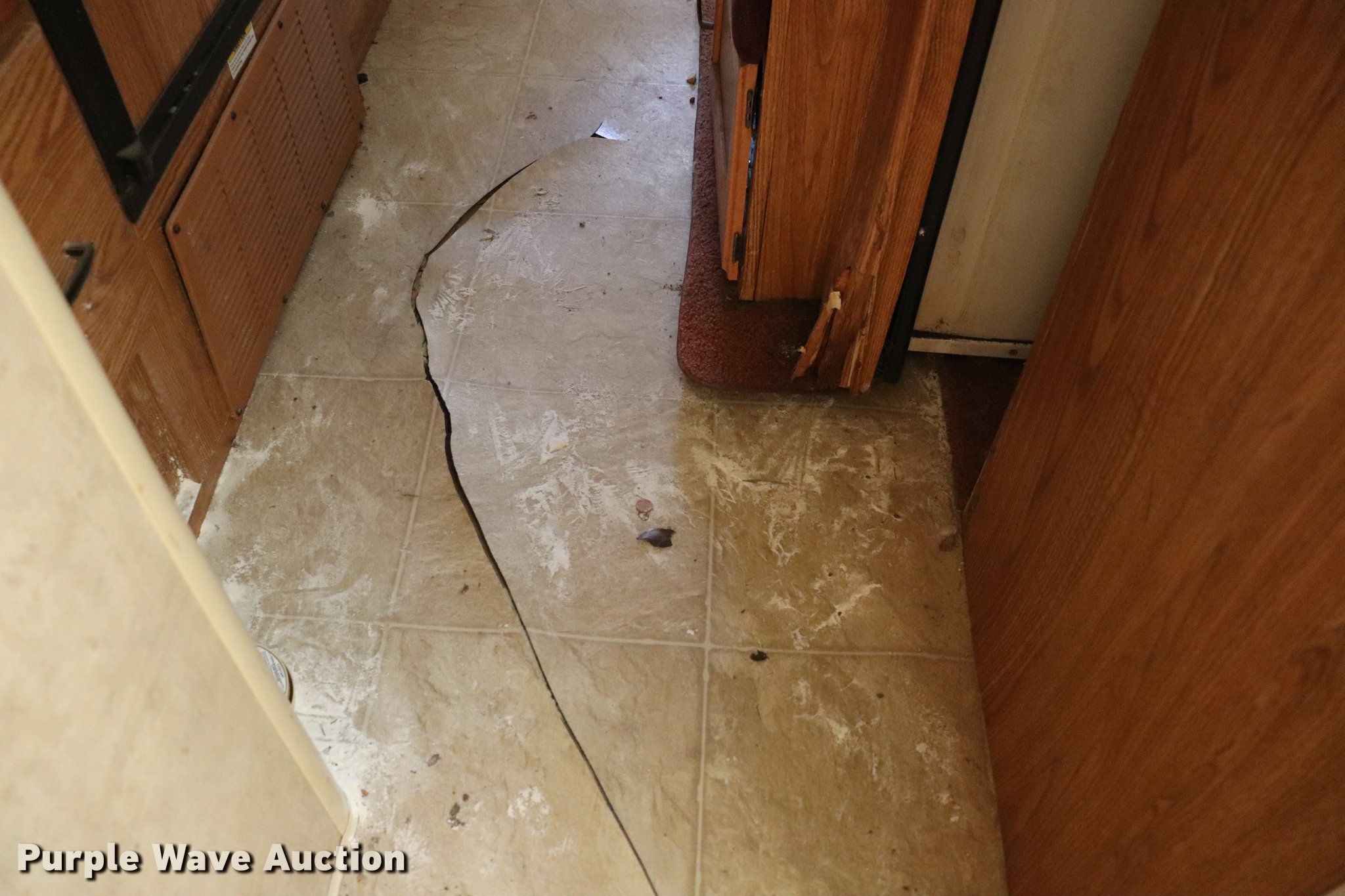 Purple Wave is selling a used RV in Oklahoma. This item is a 2006 Fleetwood Wilderness Yukon camper with the following: 30'L, Kitchen, Sink, Refrigerator/freezer, Oven, Gas stove top, Table, Bathroom, Bedroom, Sound system, Central AC and heat, Dual entry doors, Storage compartments, Single electric slide-out, Storage compartments, Single leg electric landing gear, 2 5/16" ball hitxh, Spring suspension, Electric brakes, 205/75R15 tires, Floor soft, No bed, No awning, Rear glass cracked, Tires need replaced, Cabinet hinges brocken