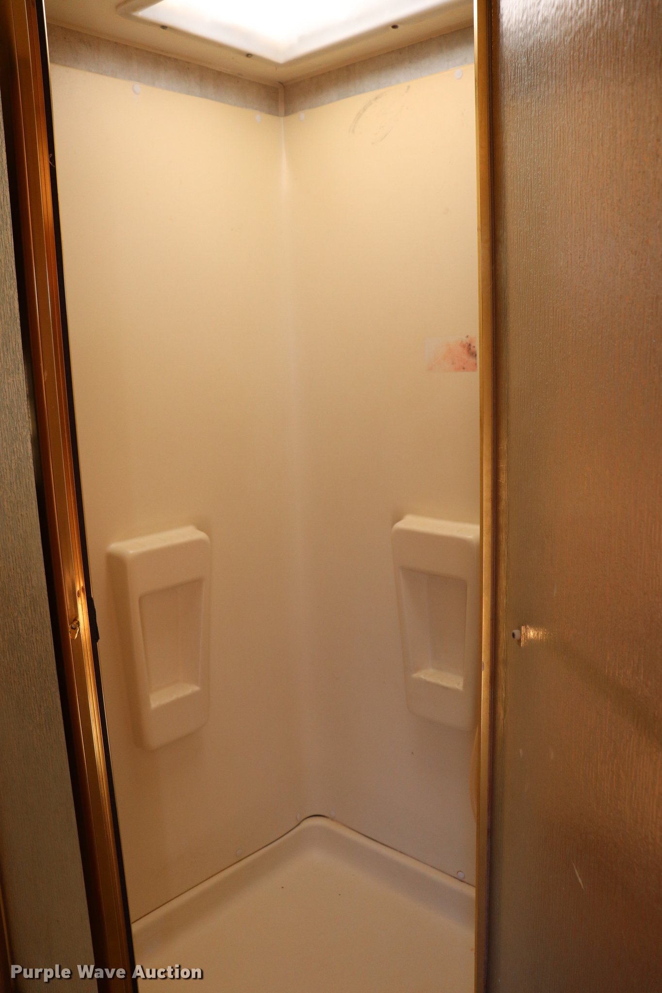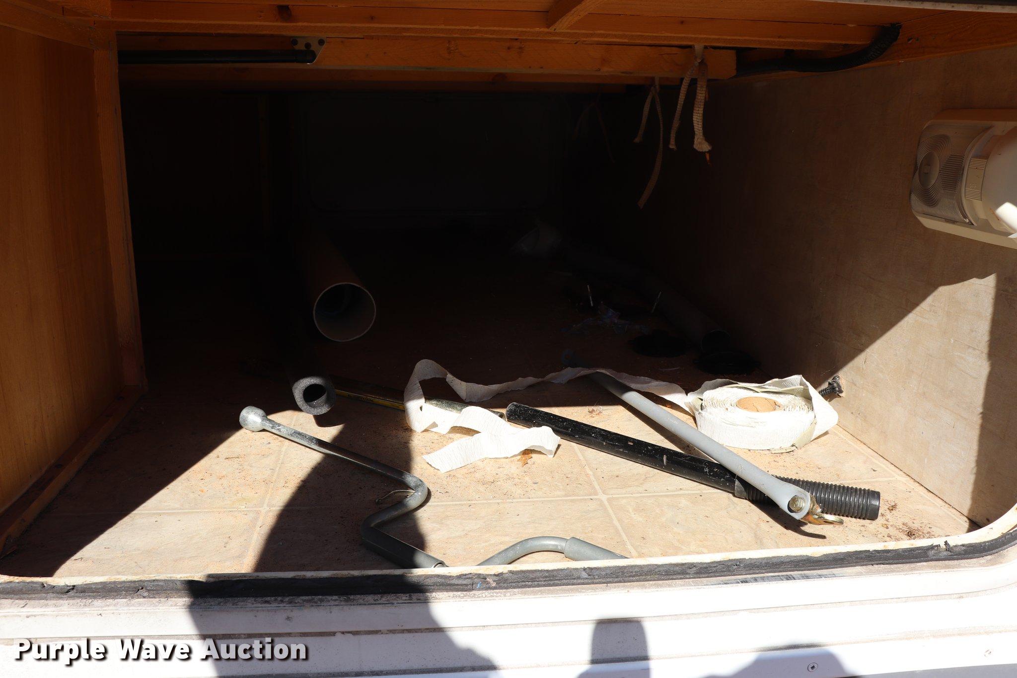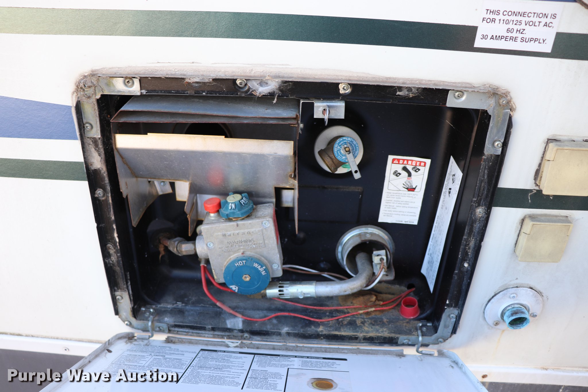 Purple Wave is selling a used RV in Oklahoma. This item is a 2006 Fleetwood Wilderness Yukon camper with the following: 30'L, Kitchen, Sink, Refrigerator/freezer, Oven, Gas stove top, Table, Bathroom, Bedroom, Sound system, Central AC and heat, Dual entry doors, Storage compartments, Single electric slide-out, Storage compartments, Single leg electric landing gear, 2 5/16" ball hitxh, Spring suspension, Electric brakes, 205/75R15 tires, Floor soft, No bed, No awning, Rear glass cracked, Tires need replaced, Cabinet hinges brocken