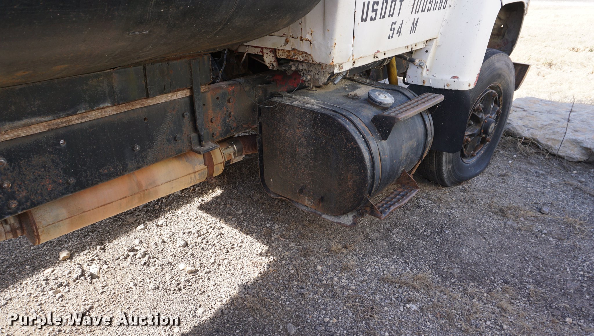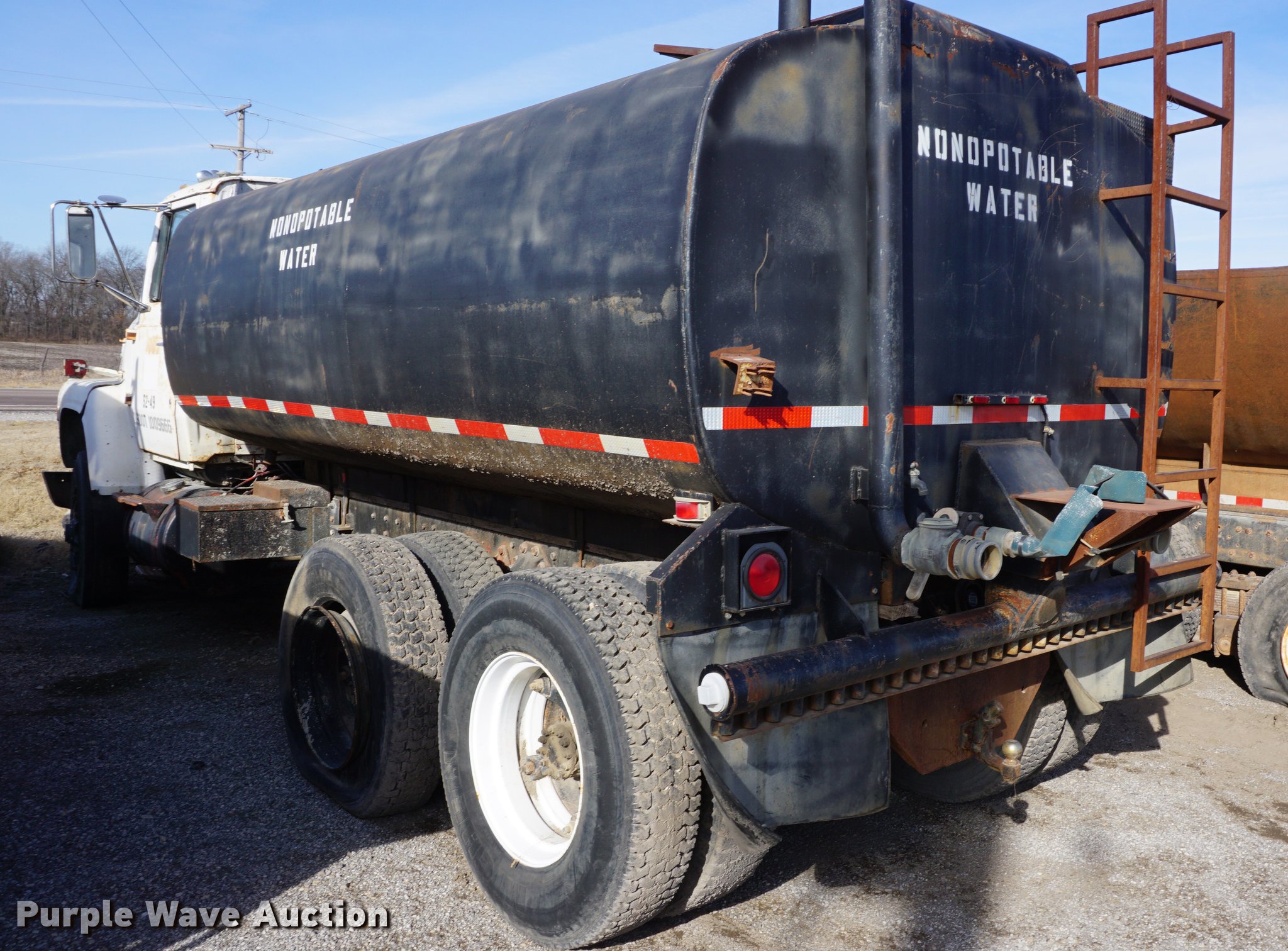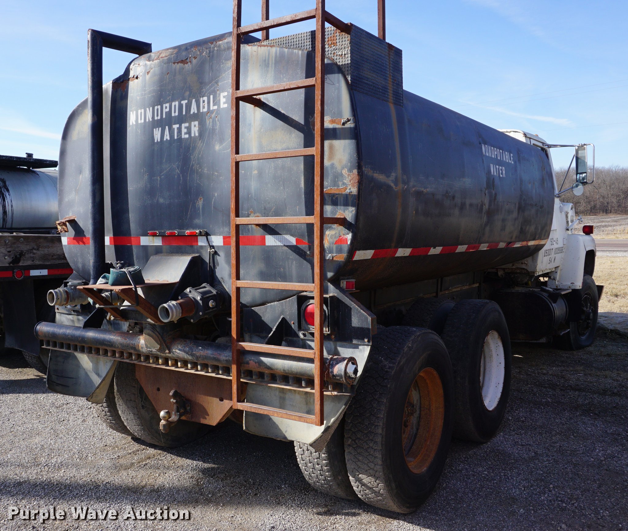 Purple Wave is selling a used Tank Truck or Water Truck in Kansas. This item is a 1973 Ford 9000 water truck with the following: 431,449 miles on odometer, Cummins NH230 diesel engine, Five speed manual transmission, Tandem axle, Heat, PTO, 13'4"L x 91"W tank bed, 3,000 gallon capacity, Rear spray bar, 3" rear outlet, Top fill, Dual fuel tanks, Pintle hitch, Spring over walking beam suspension, Air brakes, 11R22.5 tires, Water tank leaks, Bell housing broken, Dead battery, Non-operational unit, Unit# 52-49