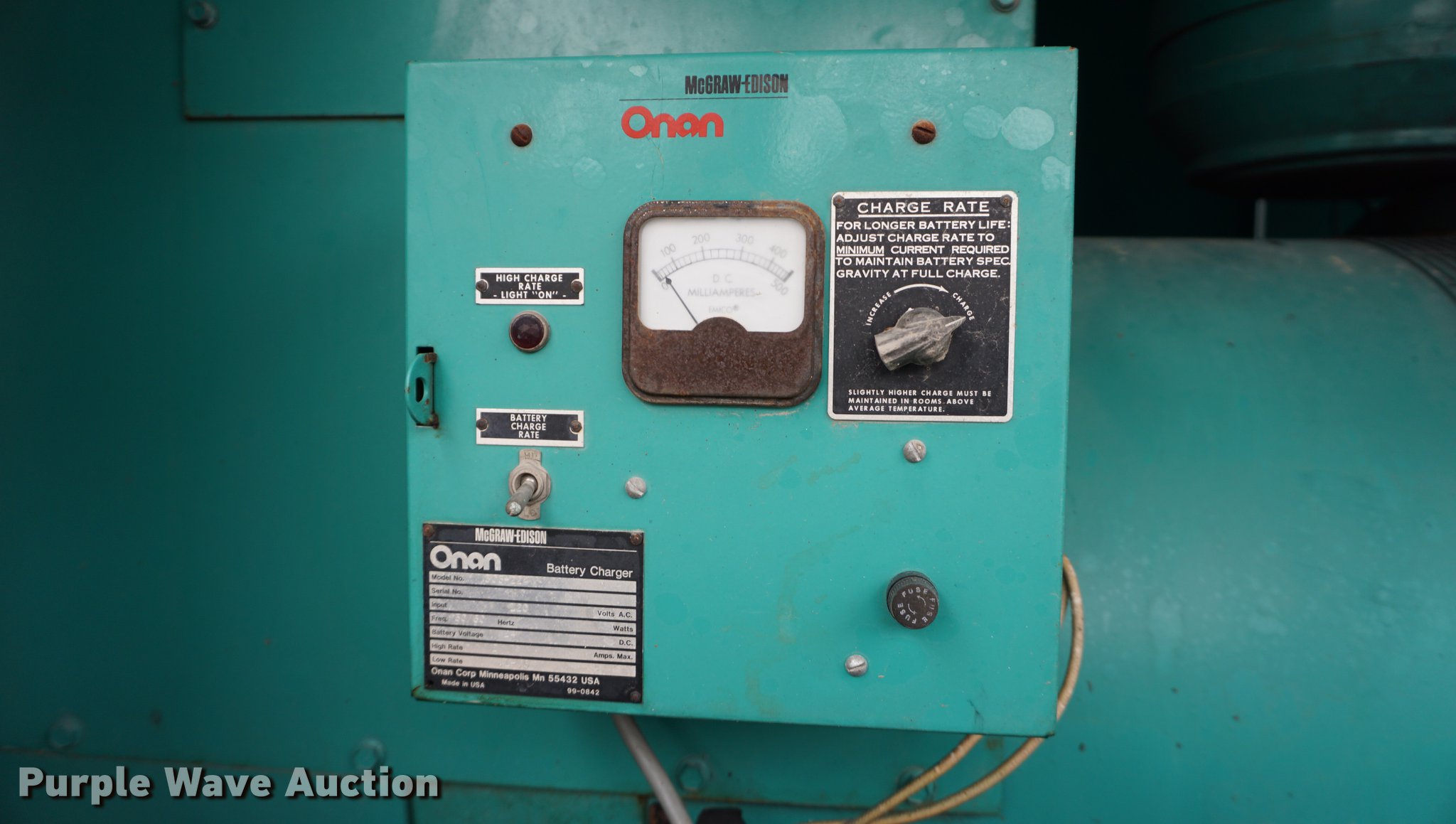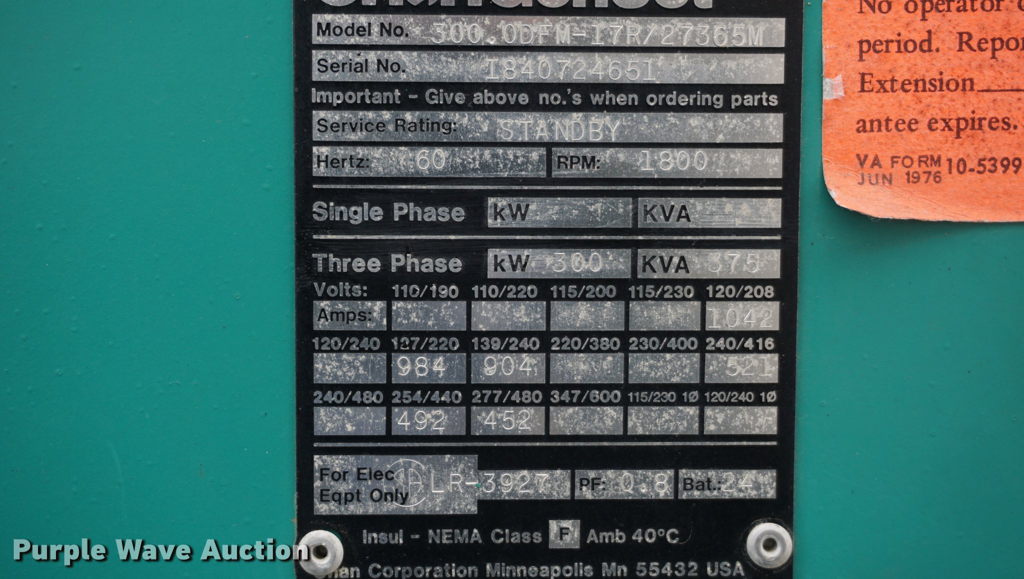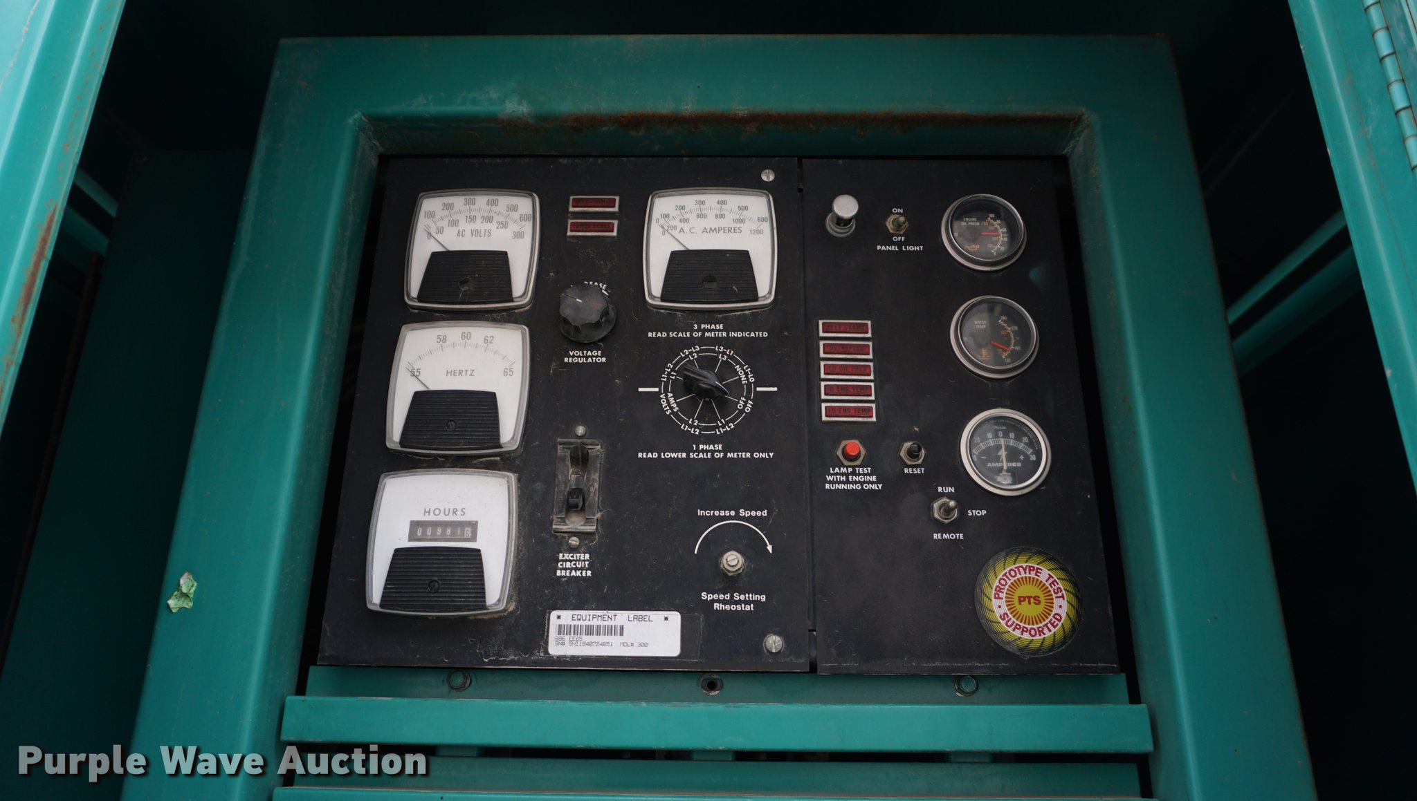 Purple Wave is selling a used Generator Set in Kansas. This item is a Onan 300 generator with the following: 981 hours on meter, Cummins NTTA-855-C six cylinder twin turbo diesel engine, 420 HP, Onan 300.00FM generator, Control panel, Electric start, 375 kVA, 300 kW, Fuel tank, Pintle hitch, 8-14.5 tires, Generator control governor needs replaced, Serial 82-6193-1