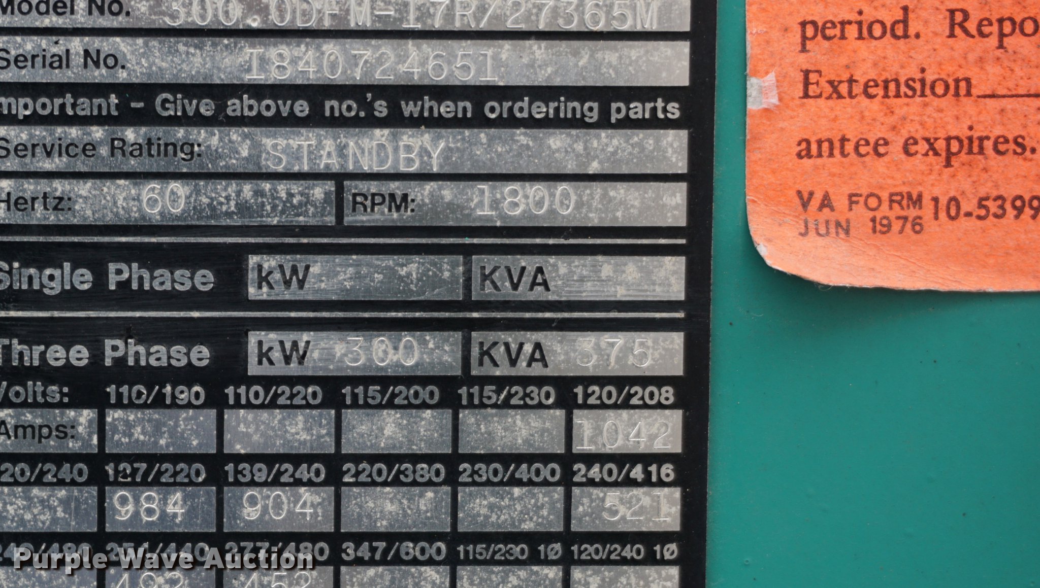 Onan 300 generator. 981 hours on meter, Cummins NTTA-855-C six cylinder twin turbo diesel engine 420 HP, Onan 300.00FM generator Control panel, Electric start, 375 kVA, 300 kW, Fuel tank, Pintle hitch, 8-14.5 tires, Generator control governor needs replaced, Serial 82-6193-1. Transfer of ownership documentation will be a bill of sale. Olathe, KS 66062
