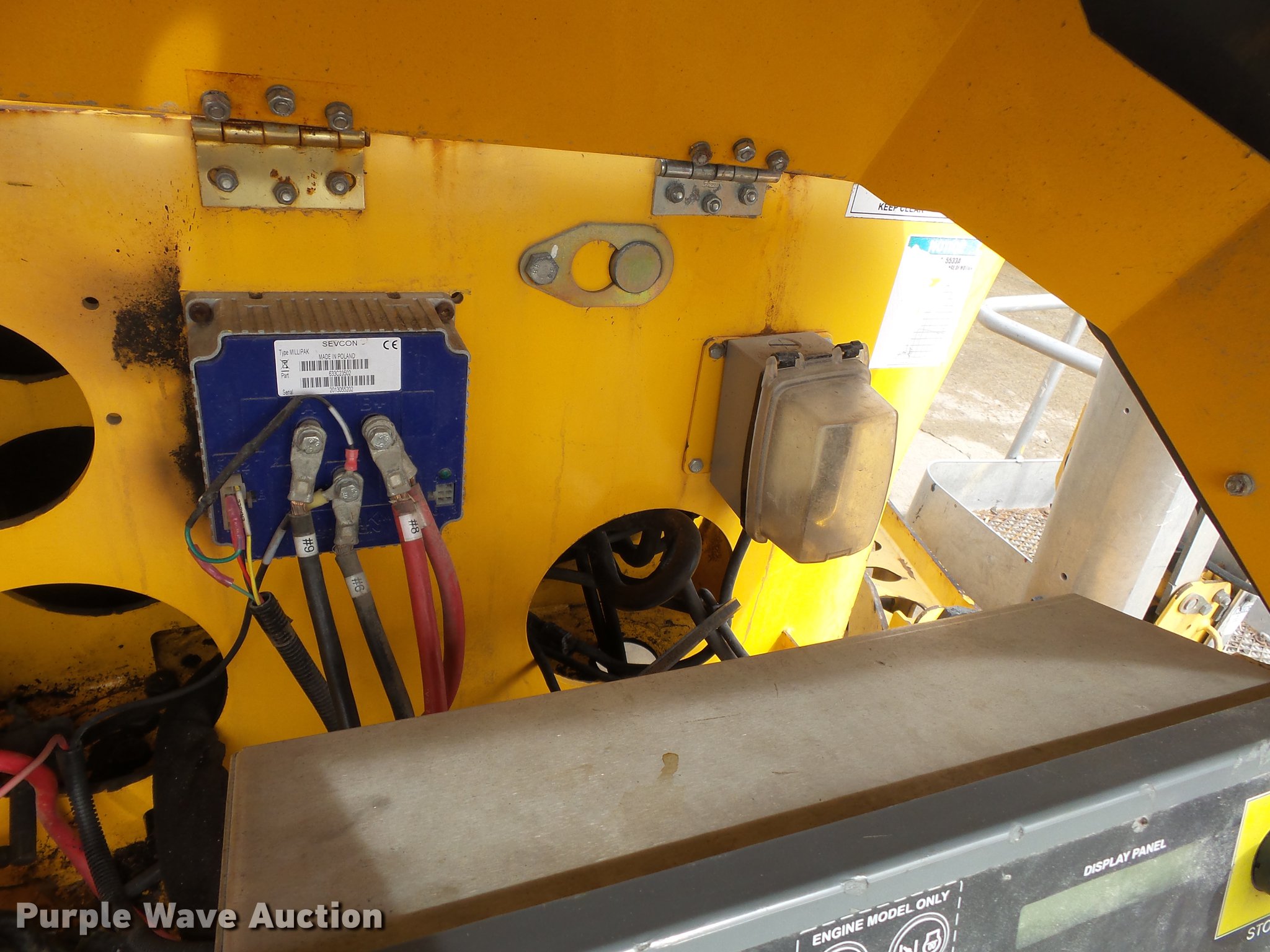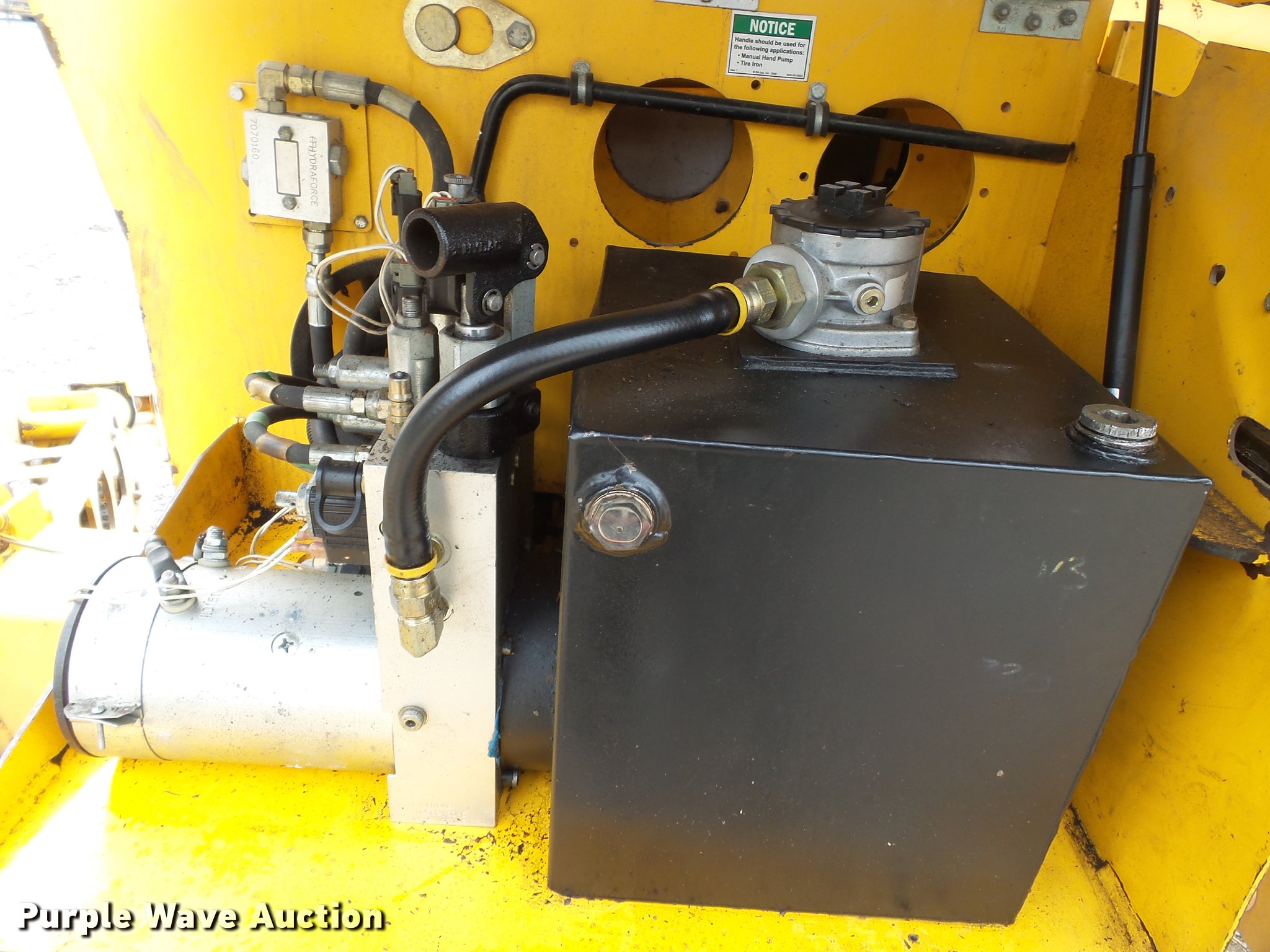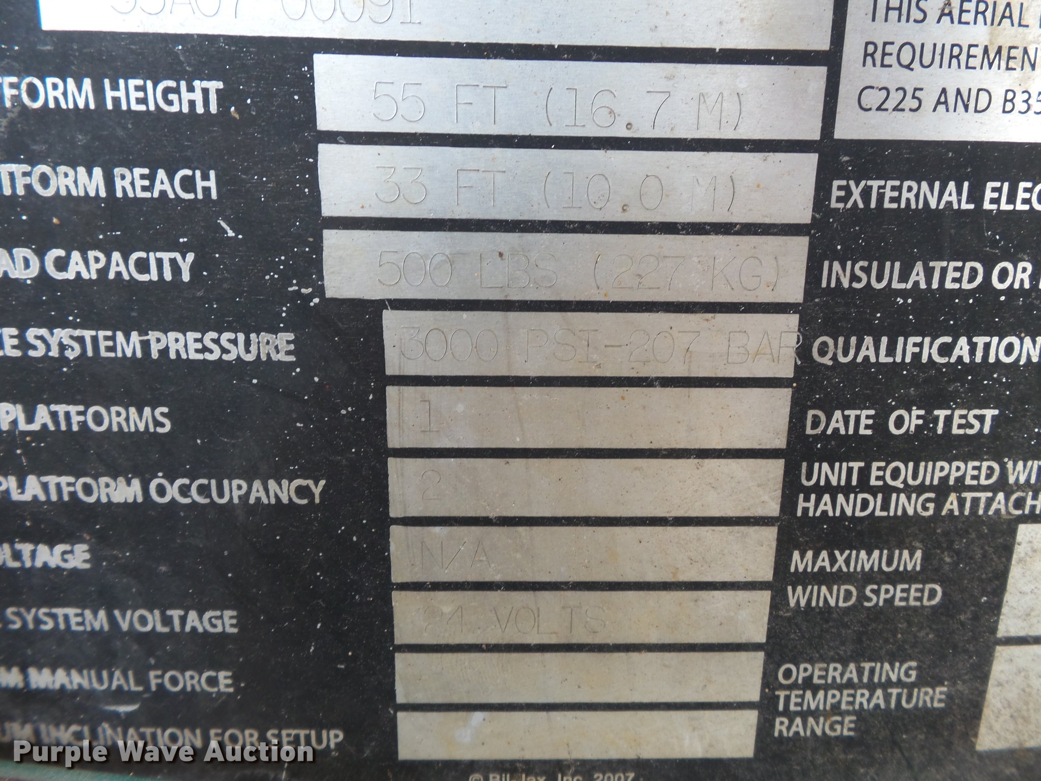 Purple Wave is selling a used Boom Lift in Illinois. This item is a 2007 Bil-jax 5533A boom lift with the following: 1,596 hours on meter, Hour meter replaced at 5,340 hours, 24V electric operation, 500 lbs max lift capacity, 33' max reach length, 55' max lift height, 48"L x 28"W platform, AC power outlet, Powered platform extensions, Hydraulic leveling, Hydraulic outriggers, On-board charger, 2" ball hitch, P225/75R15 pneumatic tires, Owner's manual, Serial 55A07-0091, Unit# 1