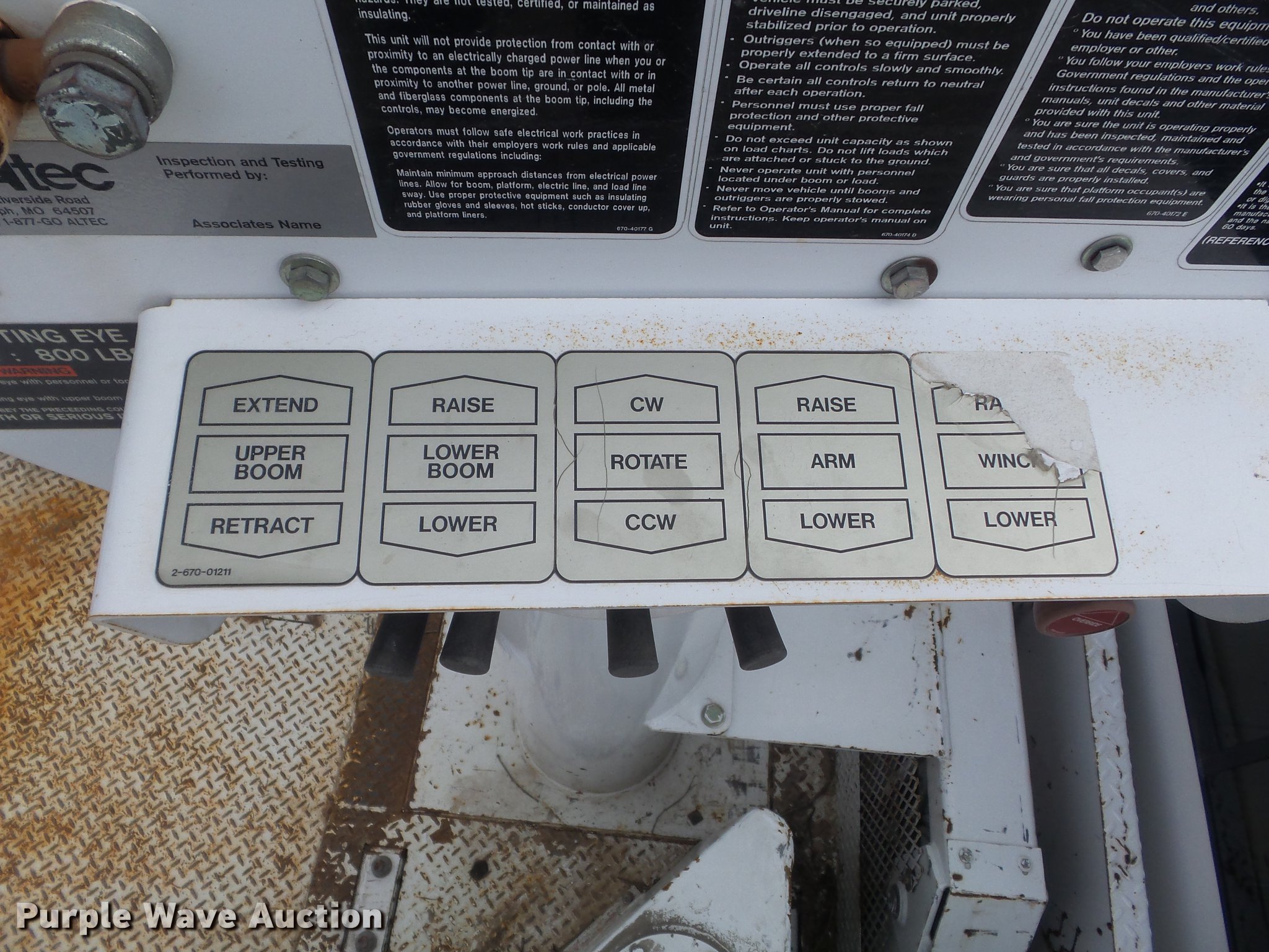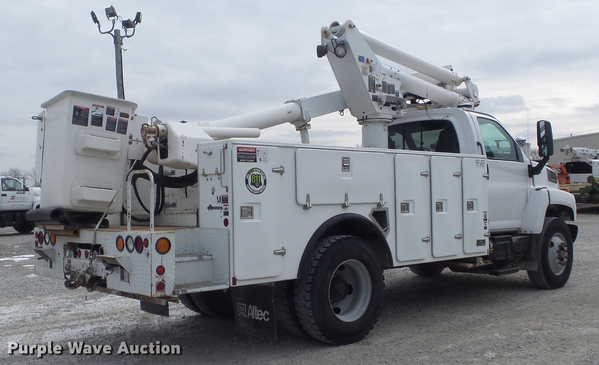 Purple Wave is selling a used Bucket Truck in Illinois. This item is a 2005 GMC C7500 bucket truck with the following: 243,997 miles on odometer, 11,160 hours on meter, 1,918 PTO hours on meter, Caterpillar C7 7.2L L6 turbo diesel engine, 250 HP, Serial KAL80947, Allison automatic transmission, Single axle, Heat, Tilt, AM/FM, Power mirrors, Brake controller, Block heater, Single exhaust stack, PTO, Altec/Astoria service bed, 15'4"L, Shelving, Work lights, Power inverter, Serial 37-3157244, 2005 Altec TA45M boom, 350 lbs max lift capacity, Man basket, 40'9" max lift height, Ground and platform controls, Boom rotation, Articulating insulated telescopic boom, Rope material handler, (2) outriggers, Serial 1204CL0839, Dual fuel tanks, Pintle hitch, Trailer wiring, Air suspension, Air brakes, 169" wheelbase, 11R22.5 tires, GVWR 33,000 lbs, Service engine light on, Rollover Damage, Boom rotation inoperable, Bed damage, Cracked windshield, Unit# 52