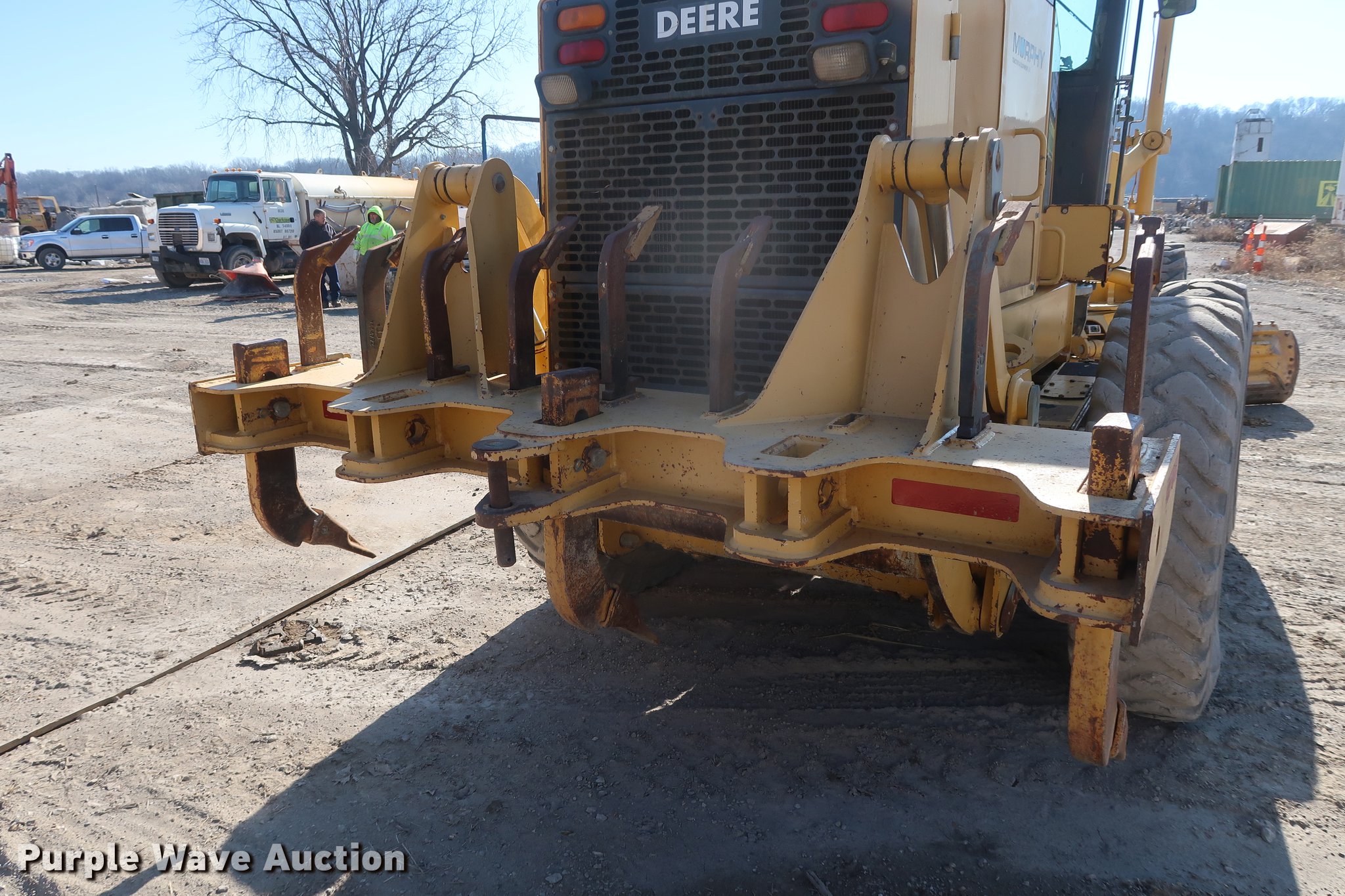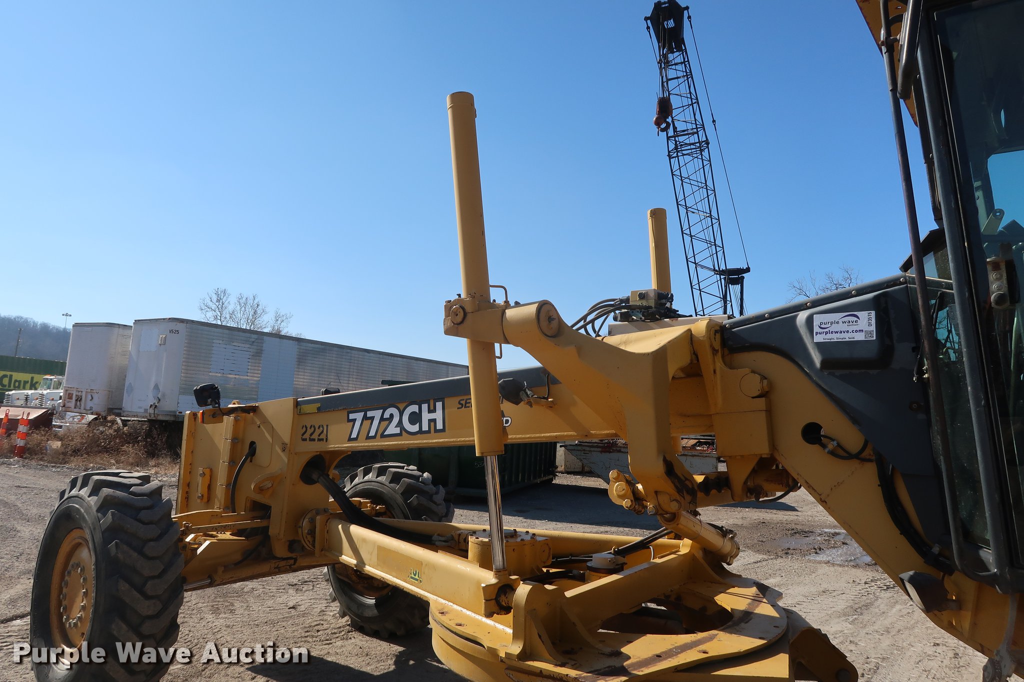 Purple Wave is selling a used Motor Grader in Missouri. This item is a 2004 John Deere 772CH motor grader with the following: 7,967 hours on meter, John Deere 6081HDW10 8.1L six cylinder diesel engine, 162 HP, Serial AG6081H164556, Powershift transmission, 8F-8R gears, Six wheel drive, Differential lock, EROPS, AC and heat, Suspension seat, Nine control valves, Backup alarm, Front and rear work lights, Ether start aid, 14'W moldboard, Tip control, Side shift, Circle slip clutch, Rear ripper, (3) shanks, (8) teeth, 14.00-24TG tires, Wired for Topcon GPS, Serial DW772GH591628, Unit# 2221