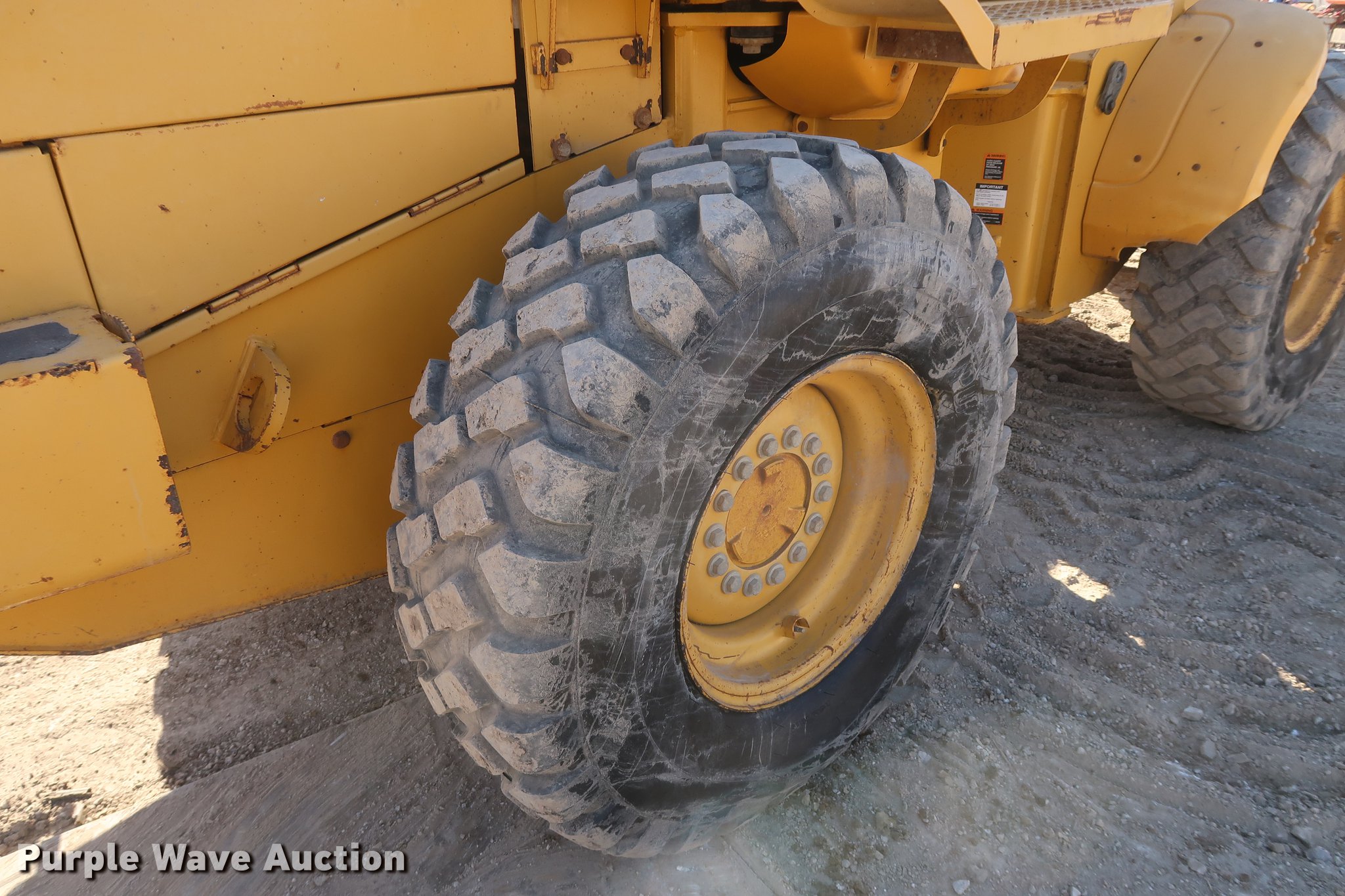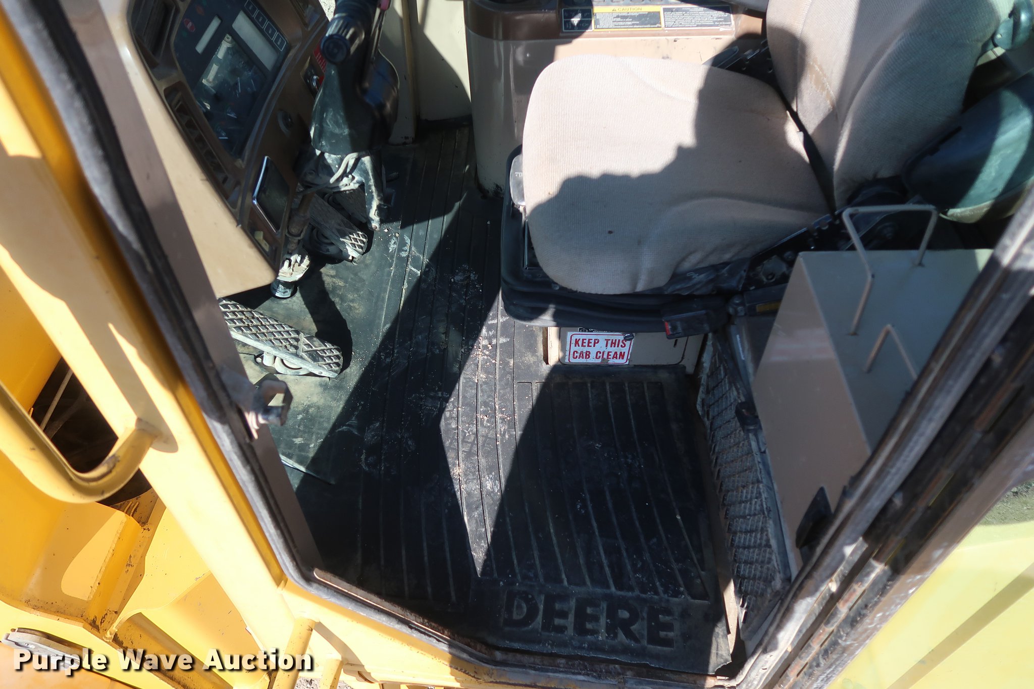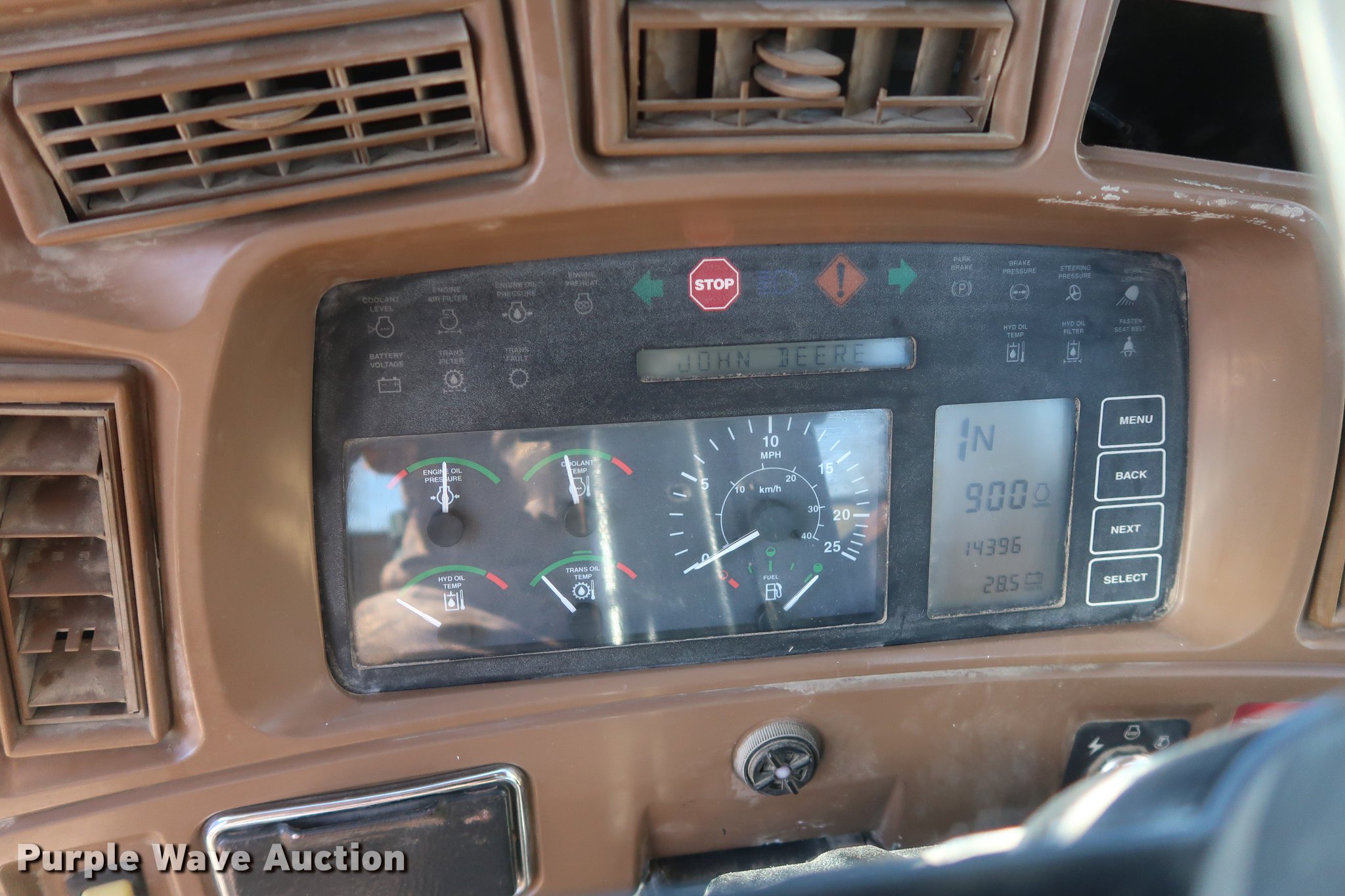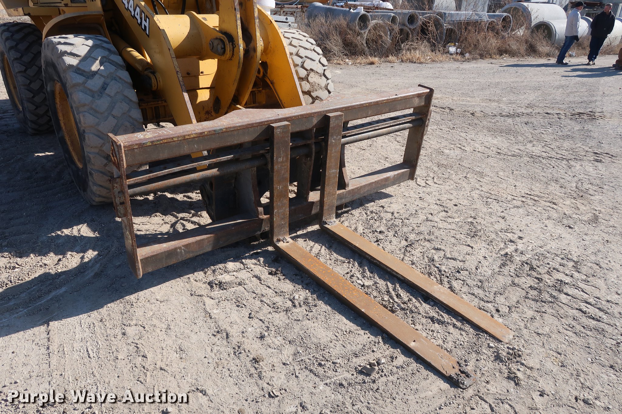 Purple Wave is selling a used Wheel Loader in Missouri. This item is a 2000 John Deere 444H wheel loader with the following: 14,396 hours on meter, John Deere 4045 4.5L four cylinder turbo diesel engine, 114 HP, Powershift transmission, 4F-4R gears, Front and rear differential lock, Front and rear limited slip, Enclosed cab, Heat, AM/FM, Suspension seat, Joystick bucket controls, Front and rear work lights, Ether start, JRB 444H 95"W general purpose bucket, Bolt-on cutting edge, 2.50 cu. yd. capacity, JRB hydraulic quick coupler, Dymax pallet forks, 5'L x 8' max width, 17.5R22.5 tires, Serial DW444HX576161, Unit# 1428