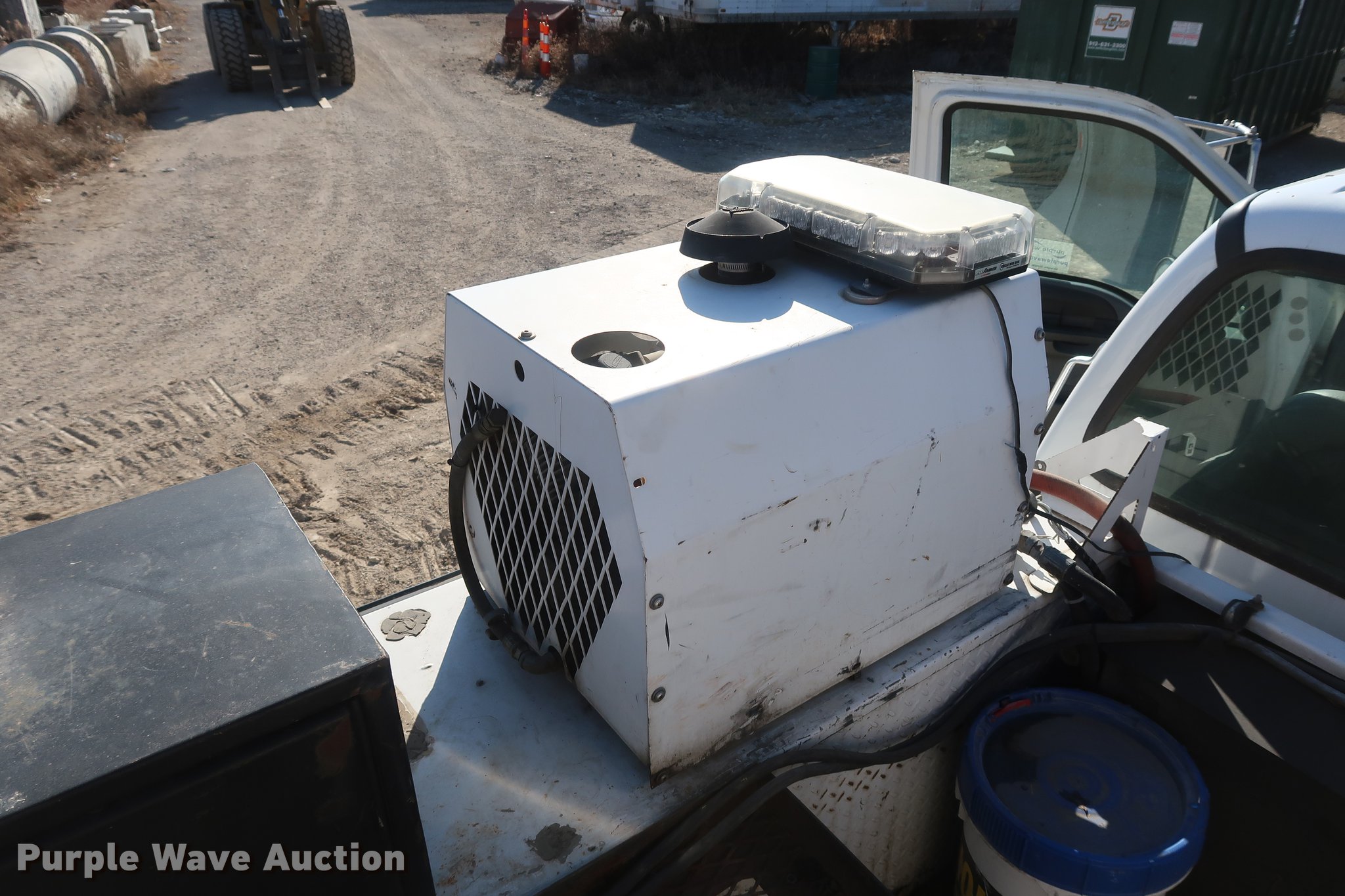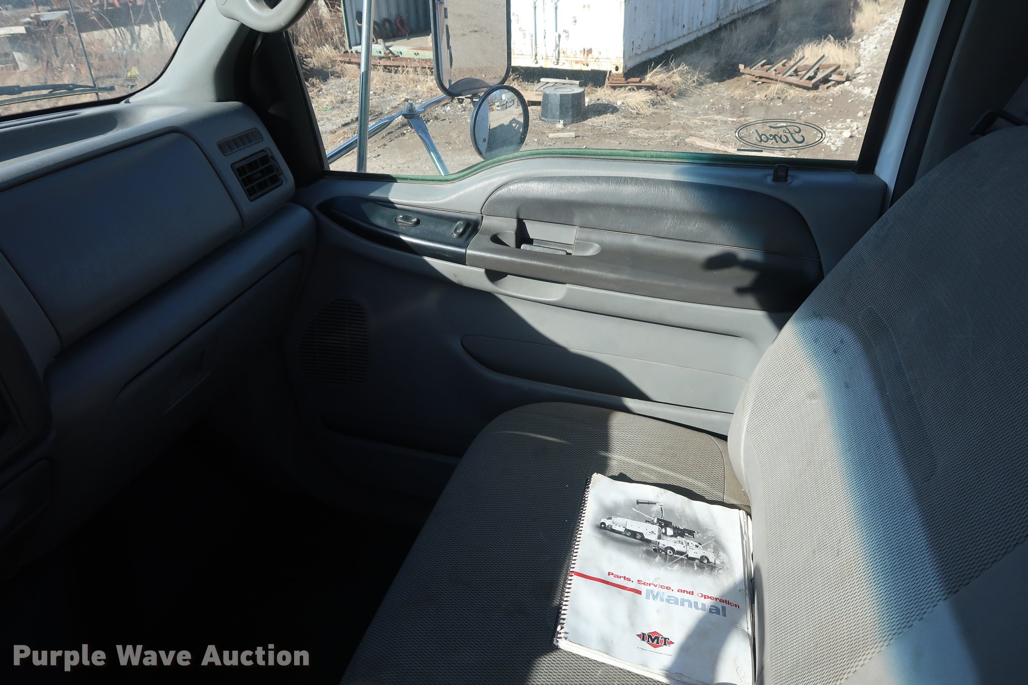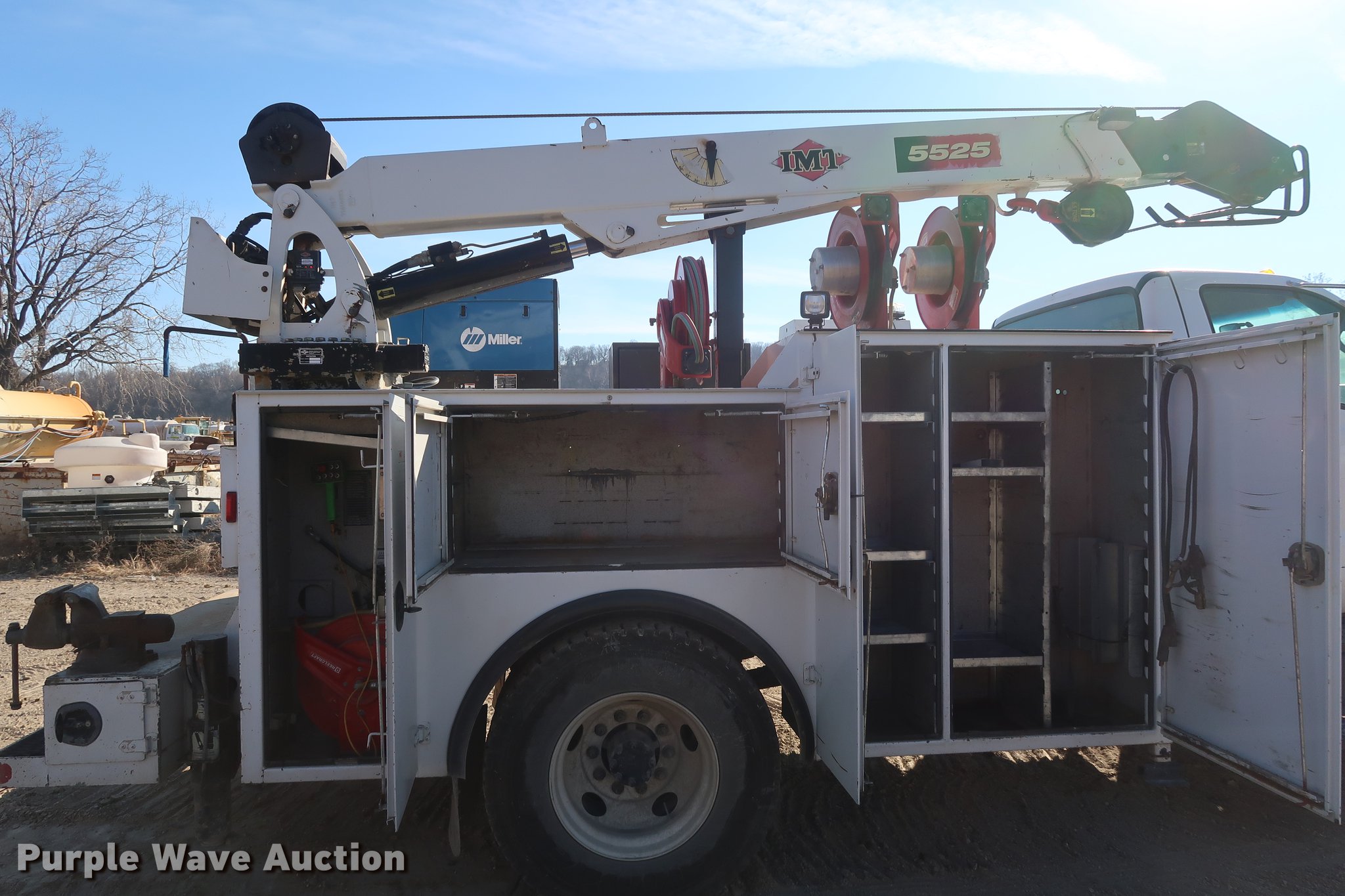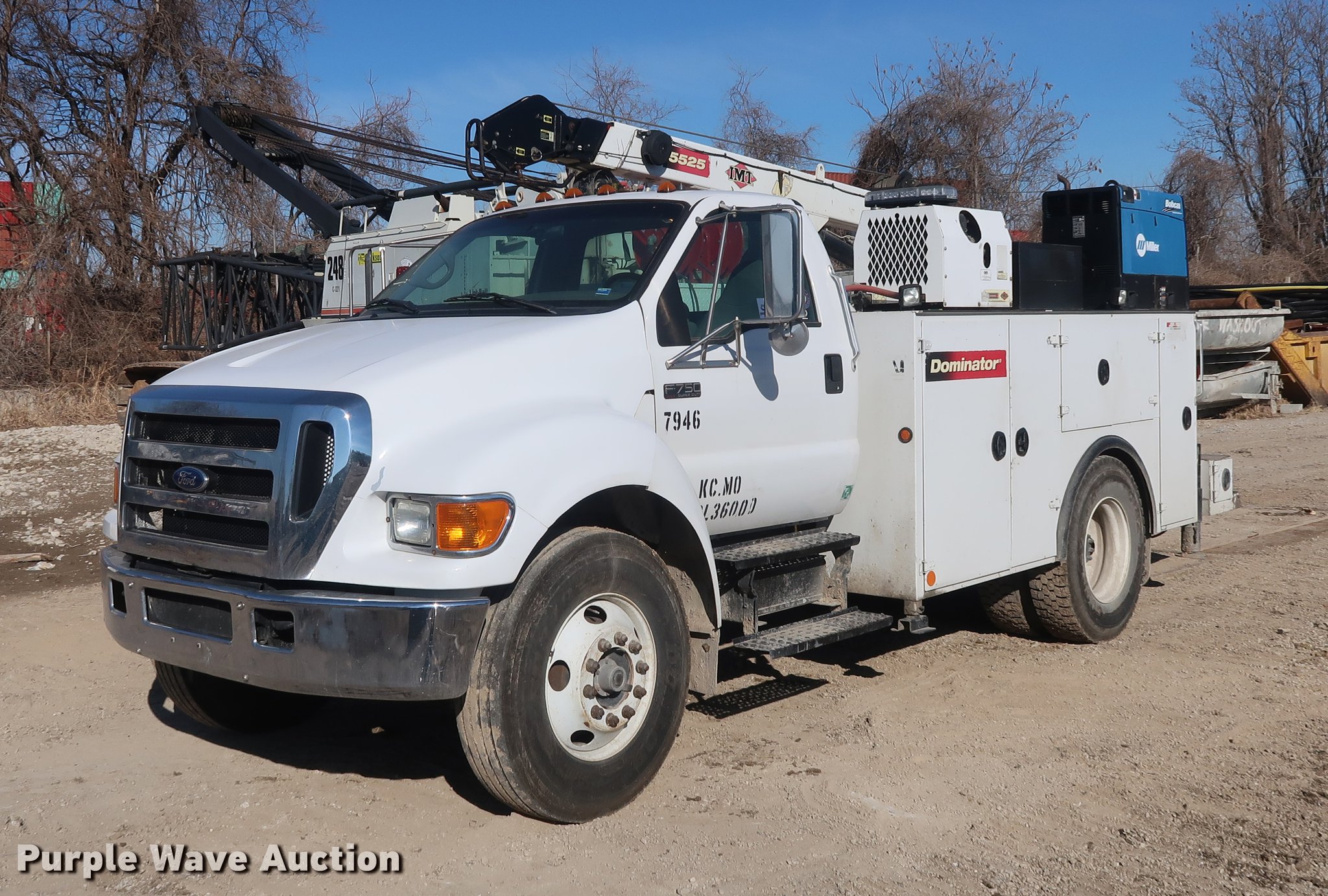 Purple Wave is selling a used Service Truck in Missouri. This item is a 2007 Ford F750 Super Duty XLT service truck with crane with the following: 223,043 miles on odometer, Cummins ISB 5.9L L6 turbo diesel engine, Six speed manual transmission, Single axle, AC and heat, Cruise, AM/FM/CD, Wet kit, Beacon light, Front tow hooks, Iowa Mold Tooling D0M252-J531218 service bed, 11'L, Shelving, Slide-out drawers, Compartment lights, Enclosed body, Mounted vise, Torch bottle rack, Work lights, Serial D0M252071192, Miller Bobcat 250 AC/DC welder/generator, 1,635 hours on meter, Diesel engine, 240V outlet, (2) 120V outlets, Leads, Serial MD090828R, IMT air compressor, 2,831 hours on meter, Hose reel, Hydraulic fluid reservoir, IMT 5525 crane, 59 hours on meter, 10,500 lbs maximum lift capacity, 12'4" boom length, Remote control, (2) hydraulic outriggers, (2) manual outriggers, Single fuel tank, 242" wheelbase, Spring suspension, Air brakes, 11R22.5 tires, GVWR 33,000 lbs, Unit# 7946