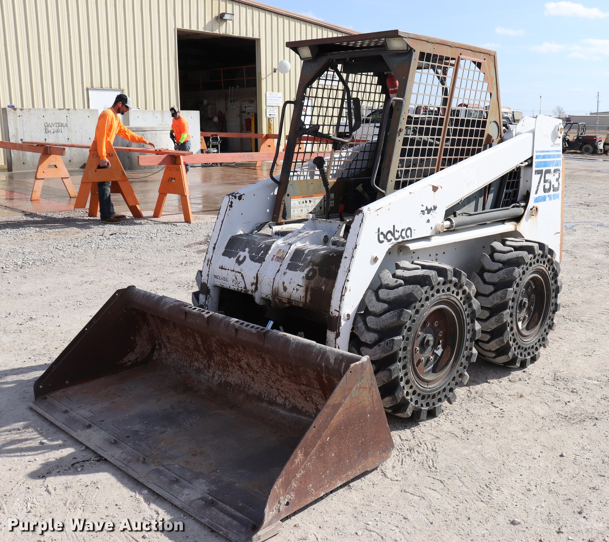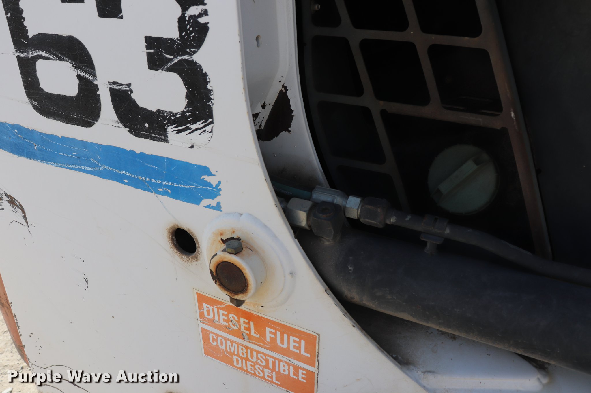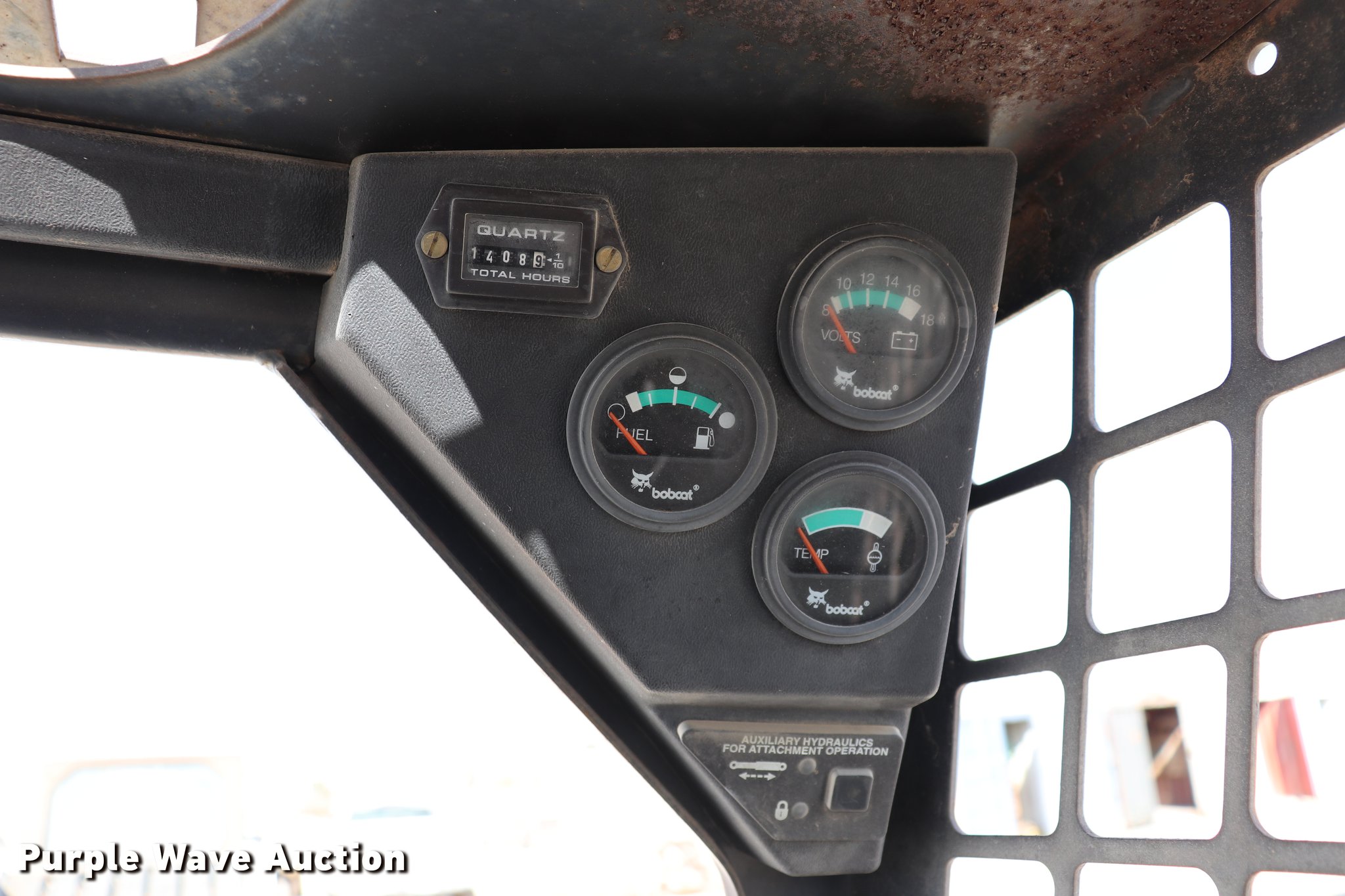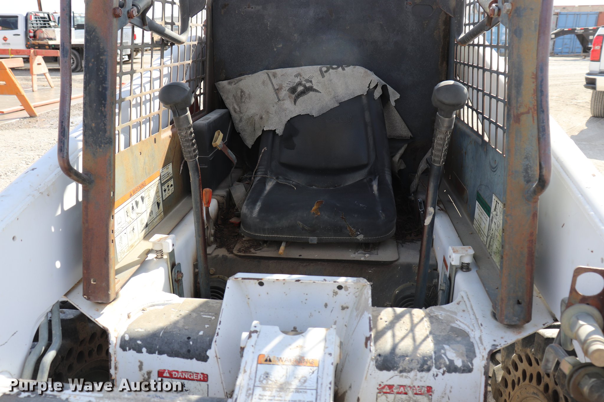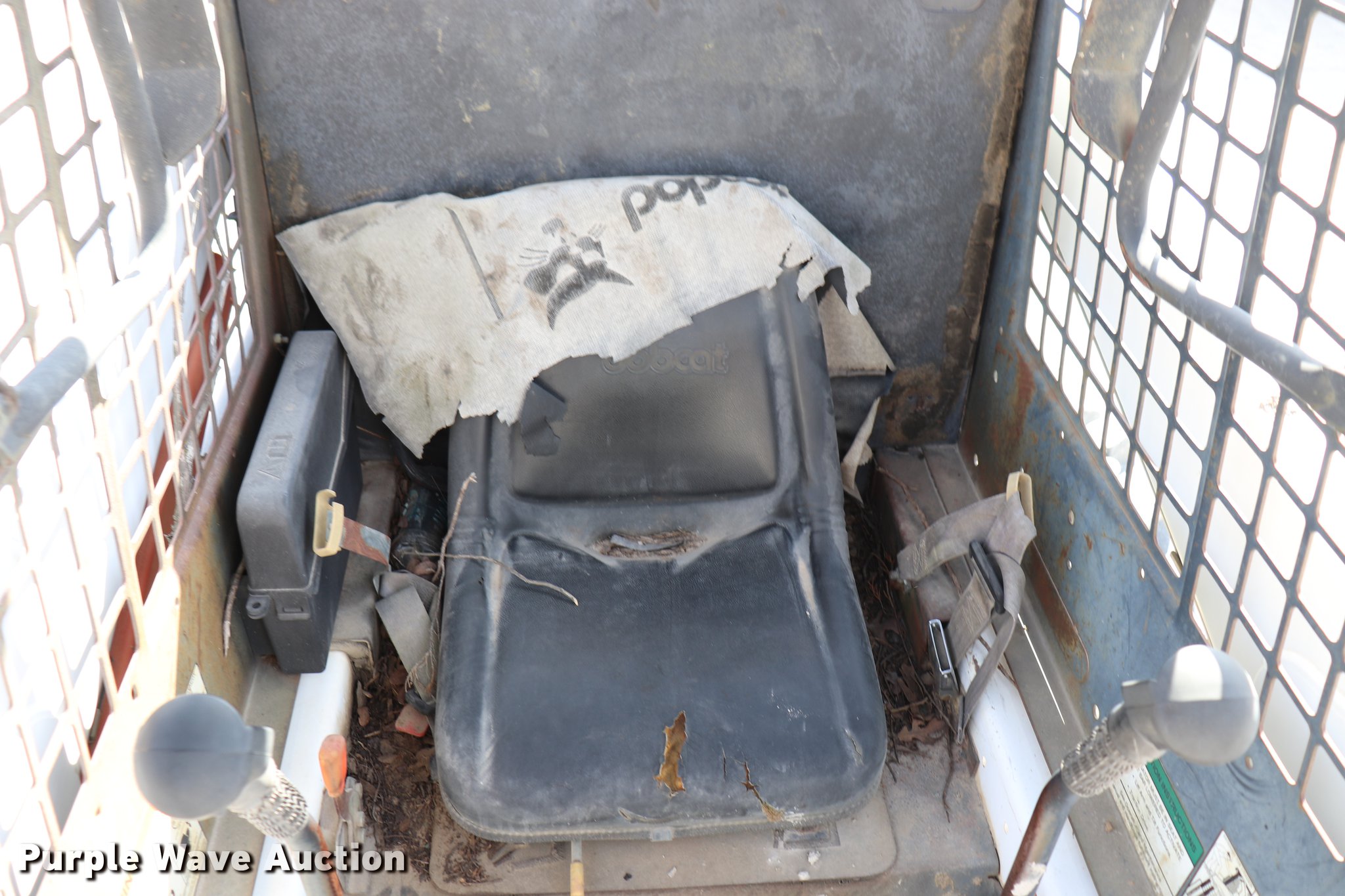Purple Wave is selling a used Skid Steer Loader in Oklahoma. This item is a 1998 Bobcat 763 skid steer with the following: 1,408 hours on meter, Kubota four cylinder diesel engine, Hydrostatic transmission, Enclosed cab, Hand and foot controls, Spring suspension seat, Front work lights, 67"W bucket, Bolt-on cutting edge, Manual quick coupler, Auxiliary hydraulics, 33 x 12-16 solid tires, Cylinder leak, Bucket on unit not included, Serial 512230602