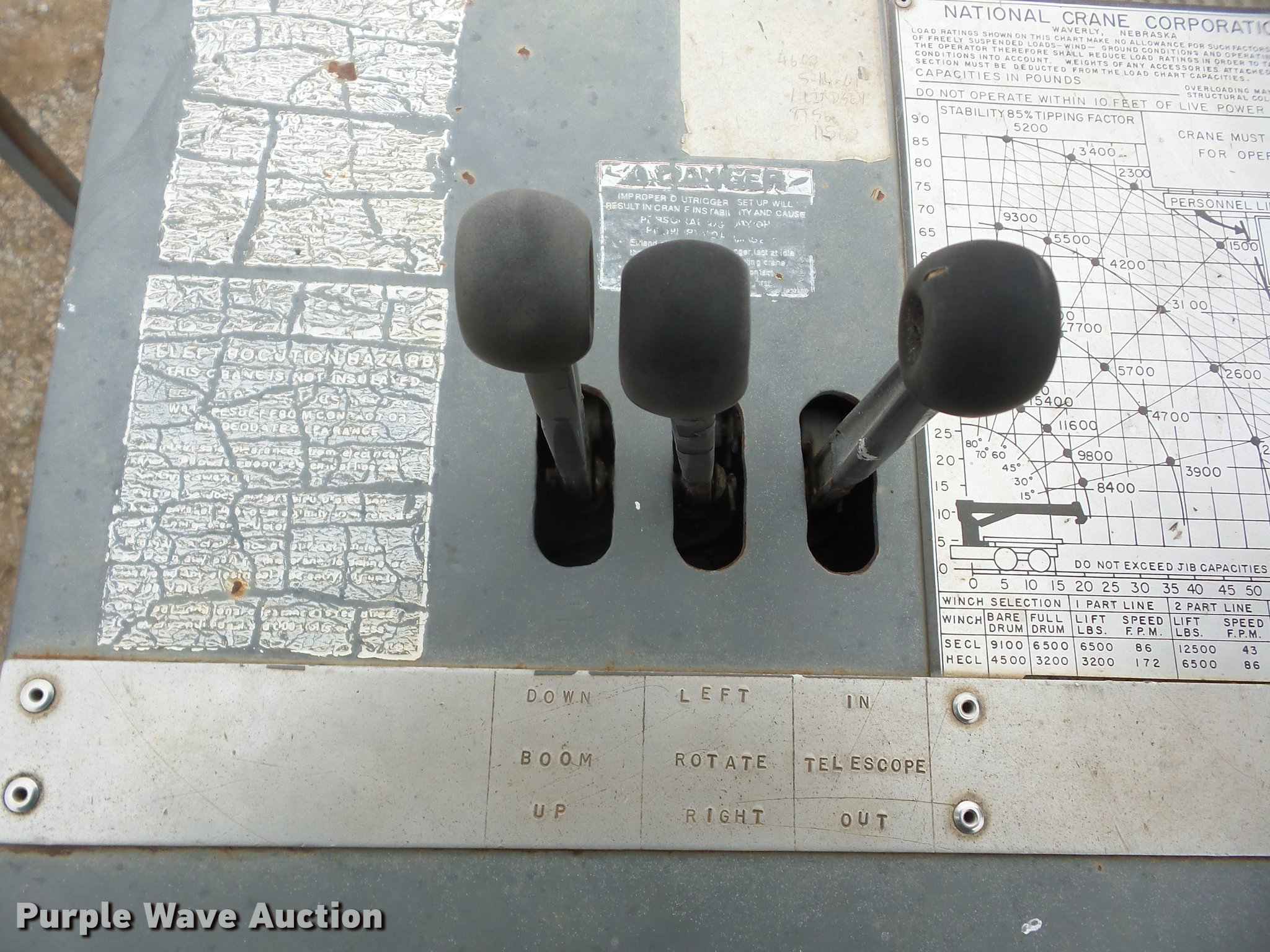 Purple Wave is selling a used Crane Truck in Oklahoma. This item is a 1978 International F2574 crane truck with the following: 125,529 miles on odometer, 8,767 hours on meter, Detroit Diesel six cylinder diesel engine, Eaton Fuller 13 speed manual transmission, Tandem axle, Power divider, Heat, Air suspension seat, PTO, National Crane 8T-56 crane, Telescopic boom, 19' jib, 24,500 lbs max lift capacity, Winch, Single sheave crane block, (4) stabilizers, Spring suspension, Air brakes, 385/65R22.5 front tires, 11R22.5 rear tires, Left rear outrigger oil leak