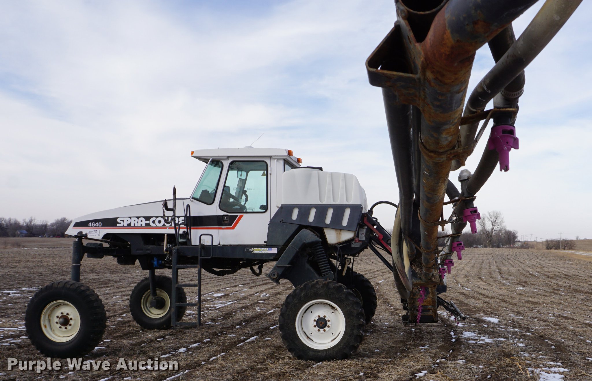Purple Wave is selling a used Applicator Self Propelled in Kansas. This item is a 1998 SpraCoupe 4640 self-propelled sprayer with the following: 2,227 engine hours on meter, Perkins four cylinder turbo diesel engine, 108 HP, Automatic transmission, 400 gallon poly solution tank, 45 gallon rinse tank, 35 gallon foam marker tank, 60'W boom, Three boom sections, Break-away boom, Hydraulic boom fold, Hydraulic height control, 20" nozzle spacing, Single nozzle bodies, AC and heat, AM/FM, Suspension seat, Front work lights, Outback STX GPS monitor, Raven spray controls, Auto steer, Rear hydraulic axle width adjust, 11.00-20 front tires, 320/85R24 rear tires, Serial 210011053