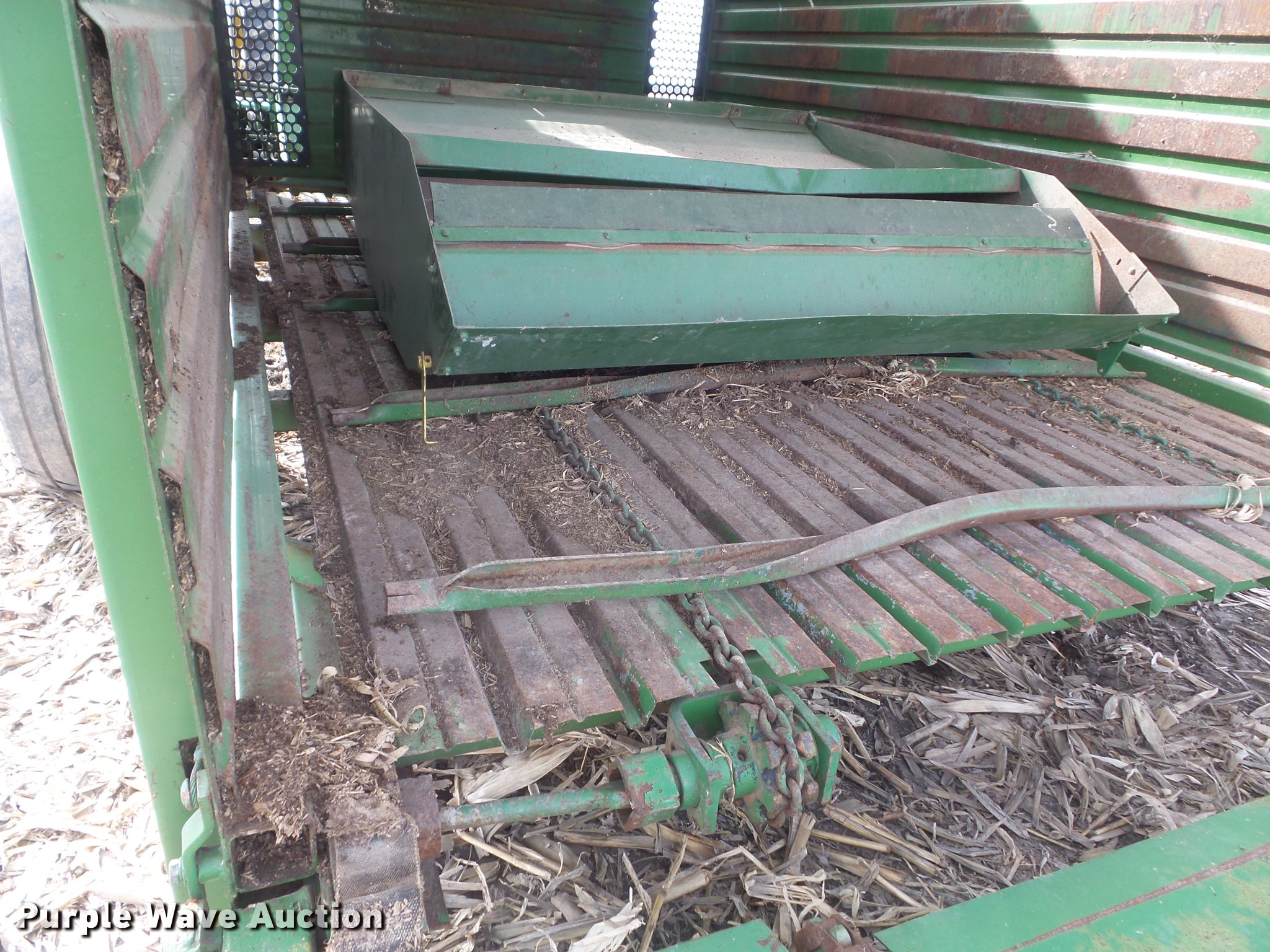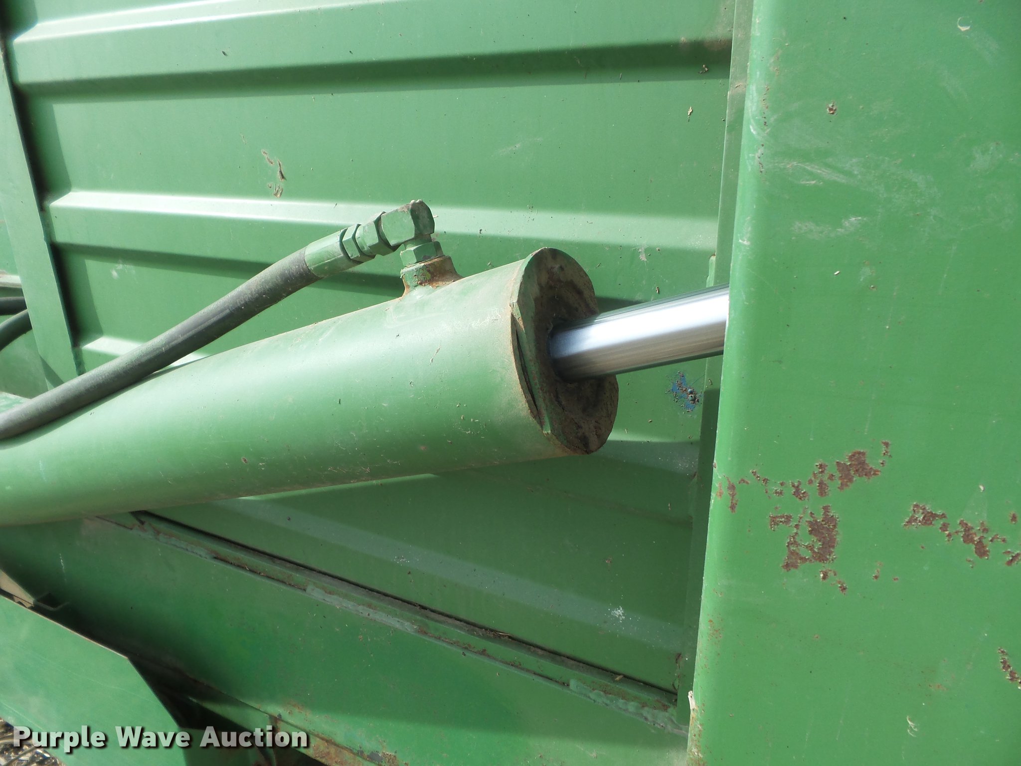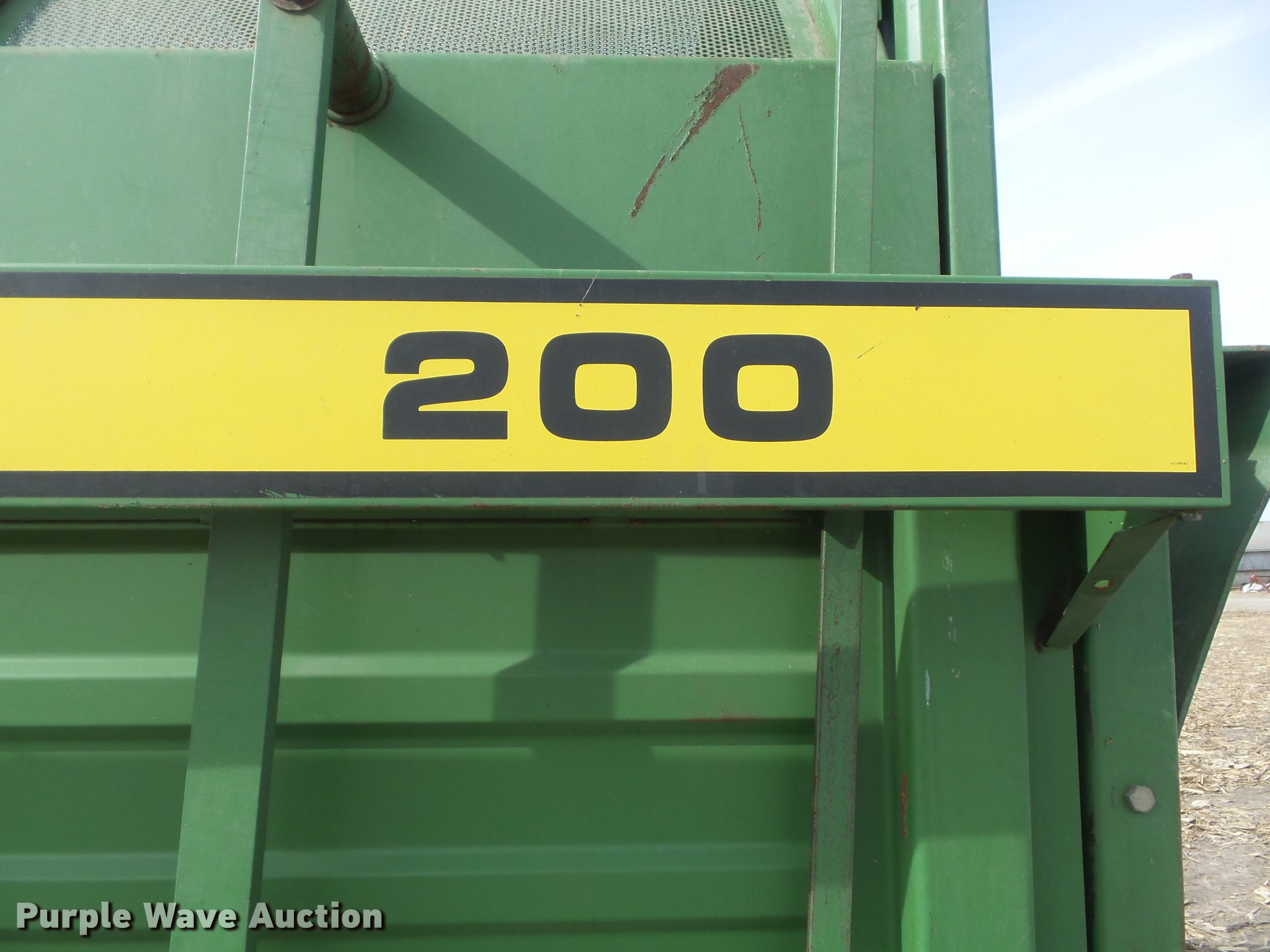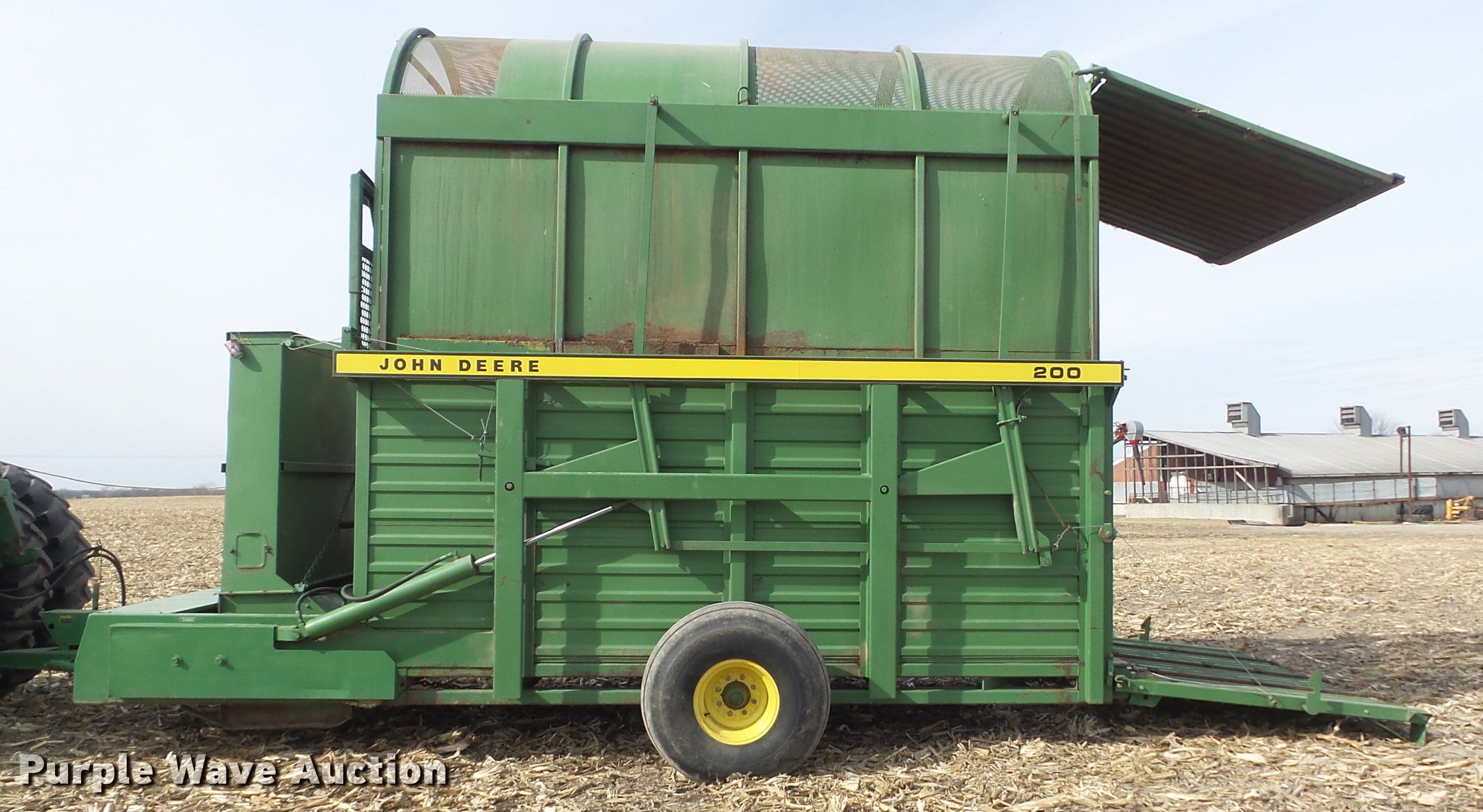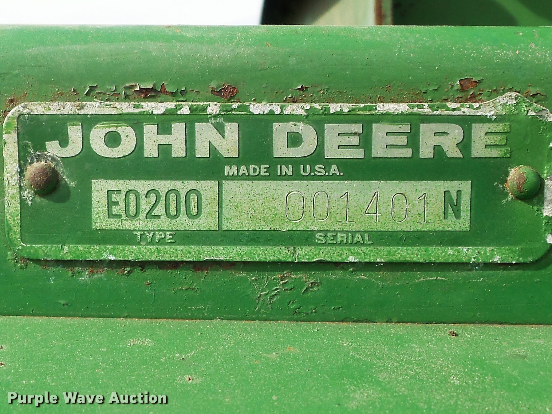 Purple Wave is selling a used Hay Handling in Illinois. This item is a John Deere E0200 bale stacker with the following: 24'L, 144" O.D. tire width, Approx. 8,000 lbs max capacity, Grandy Forage additive applicator, 1000 PTO, Pin hitch, Tandem axle, 16.5L-16.1 tires, Exhaust chute has been removed for storage, included in bed, Tractor not included, Serial 001401
