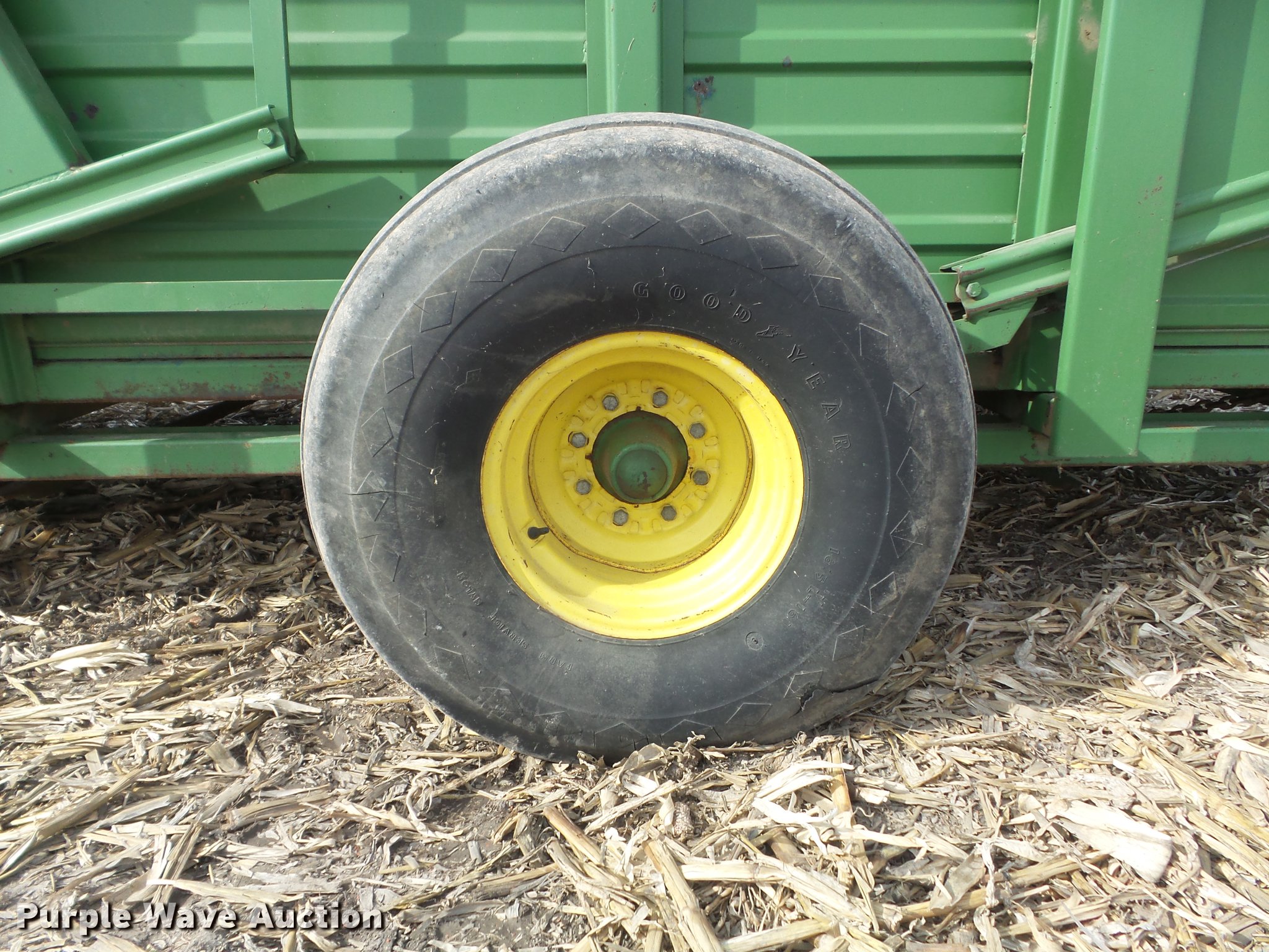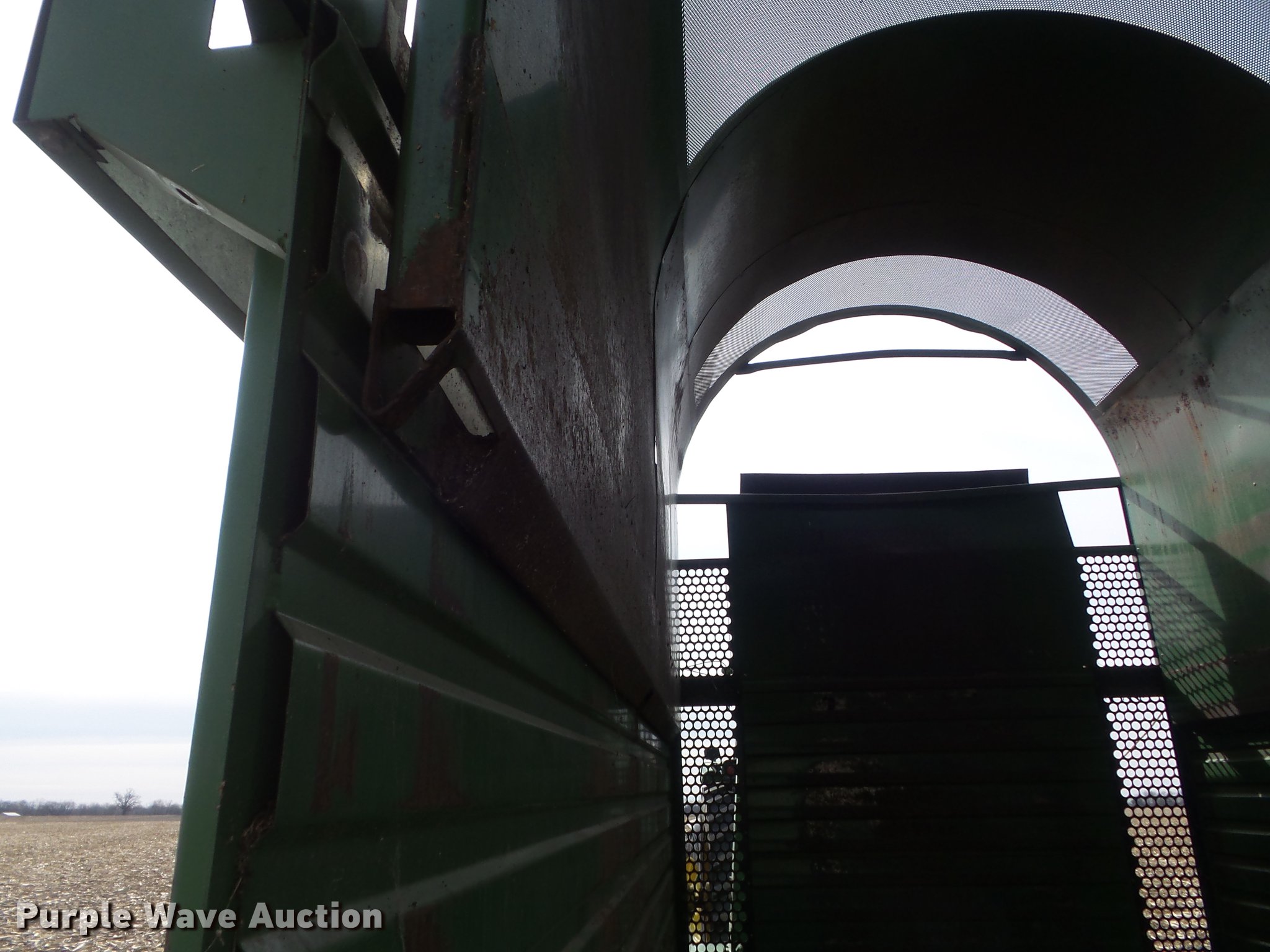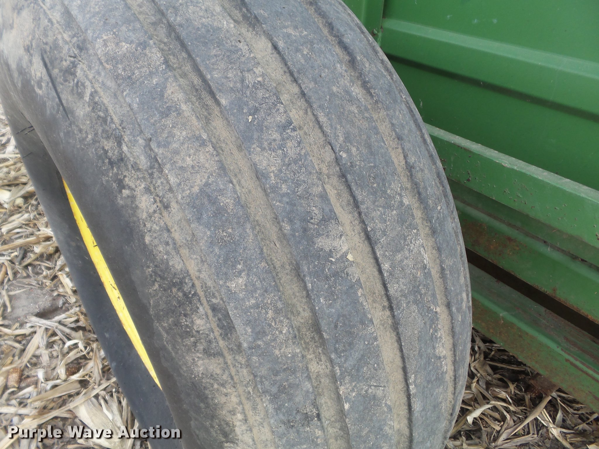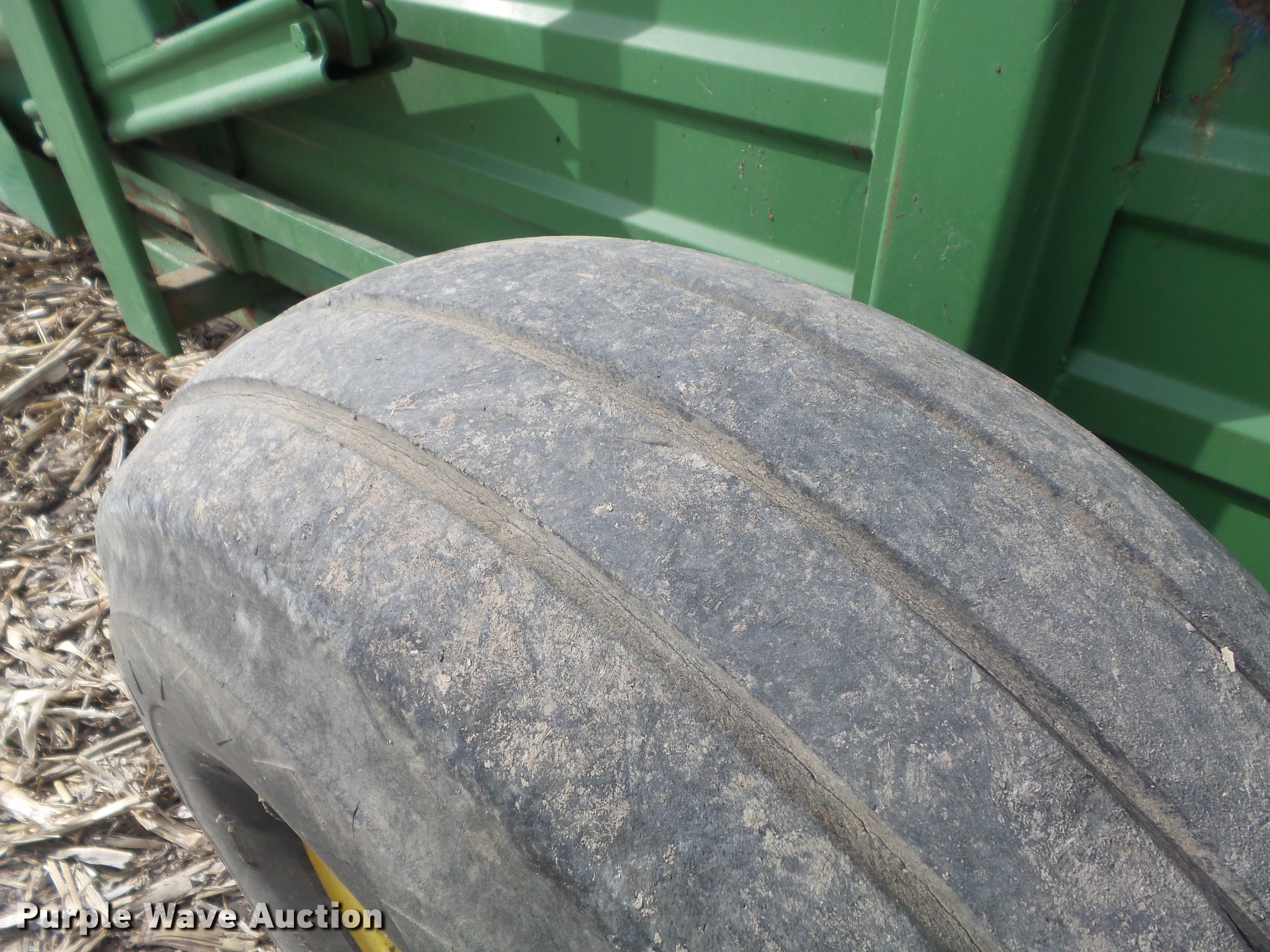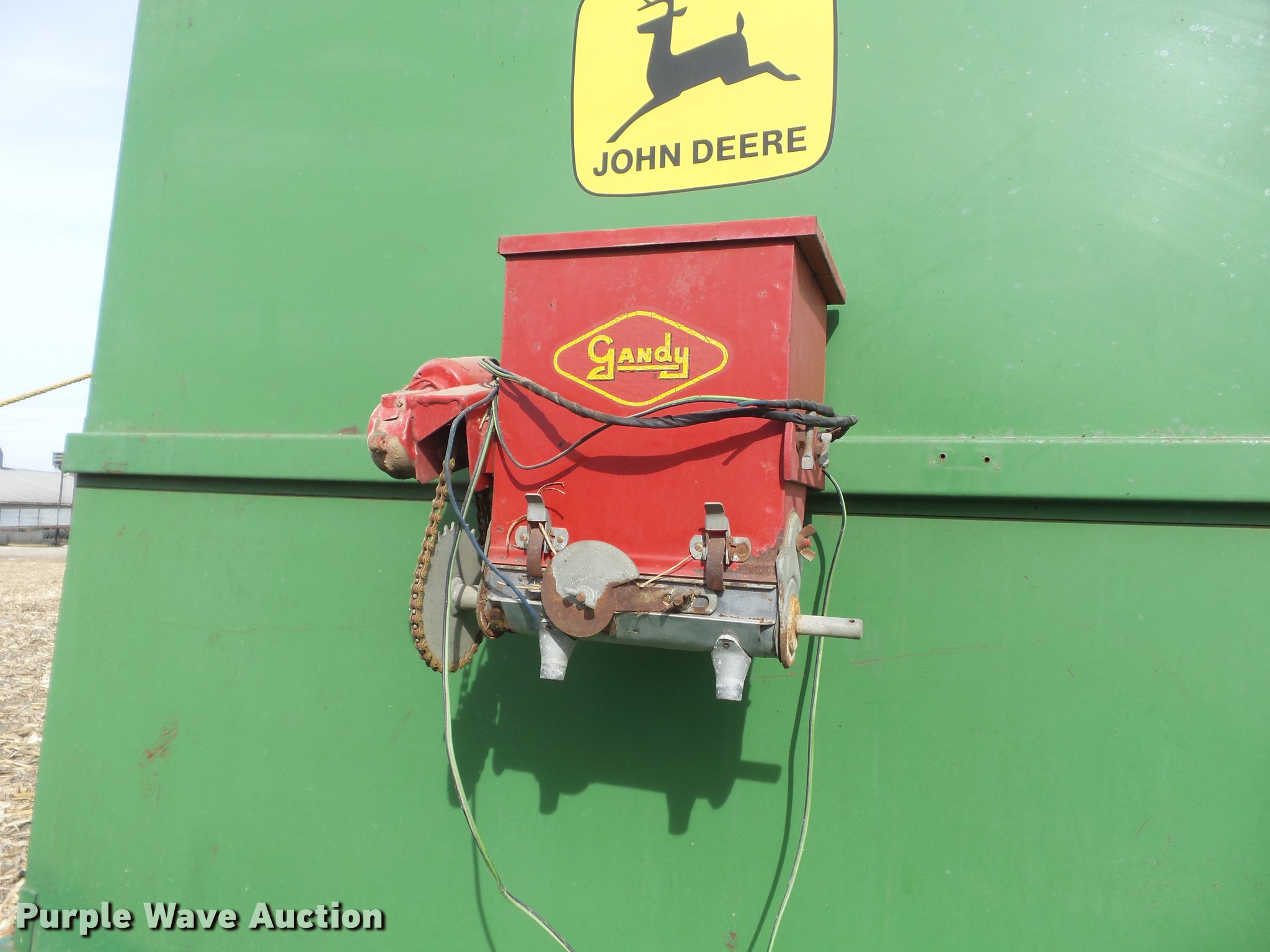 Purple Wave is selling a used Hay Handling in Illinois. This item is a John Deere E0200 bale stacker with the following: 24'L, 144" O.D. tire width, Approx. 8,000 lbs max capacity, Grandy Forage additive applicator, 1000 PTO, Pin hitch, Tandem axle, 16.5L-16.1 tires, Exhaust chute has been removed for storage, included in bed, Tractor not included, Serial 001401