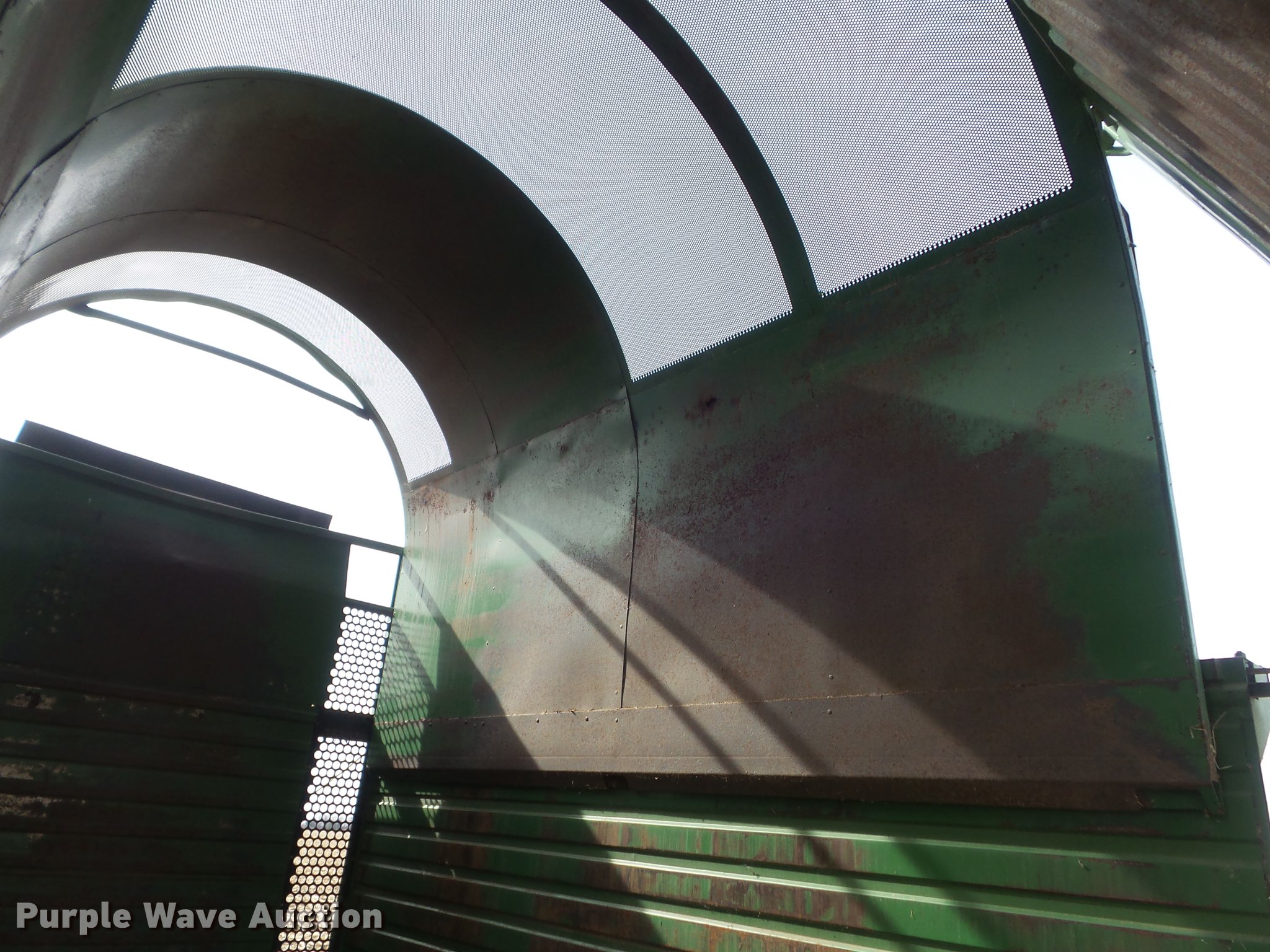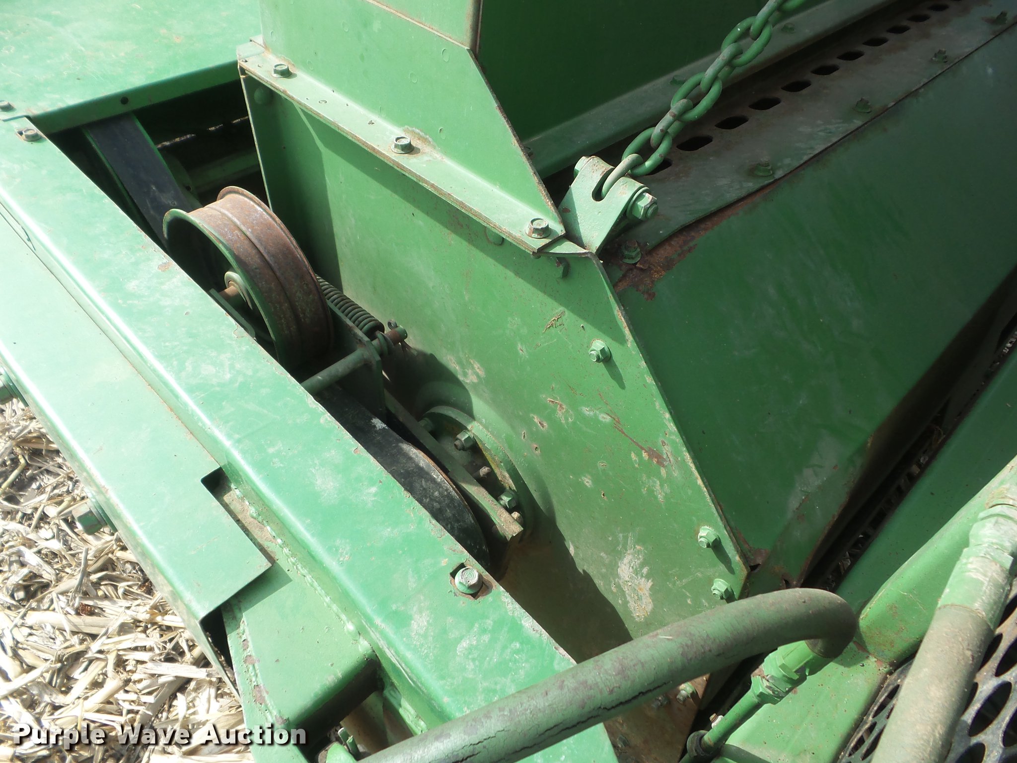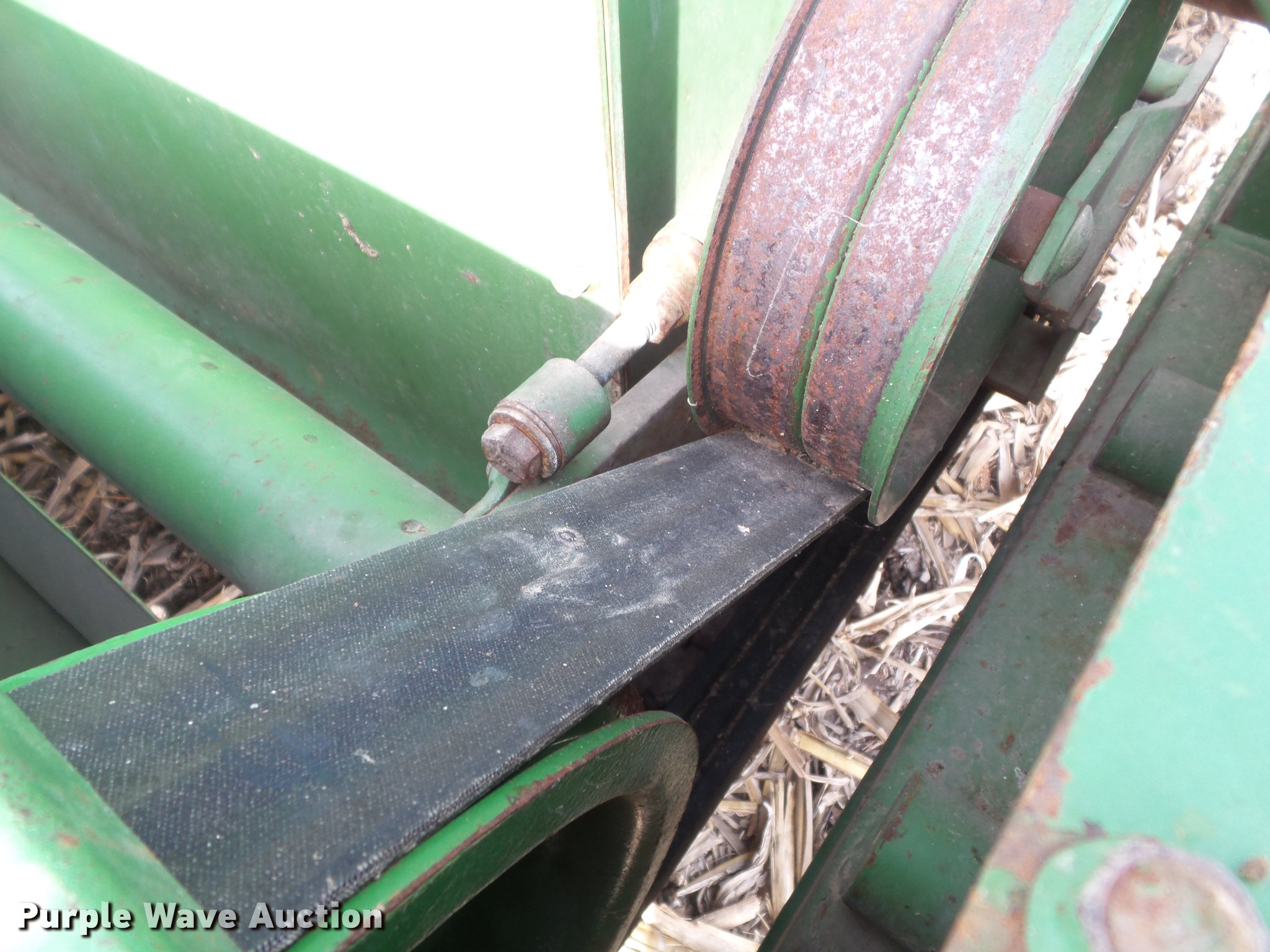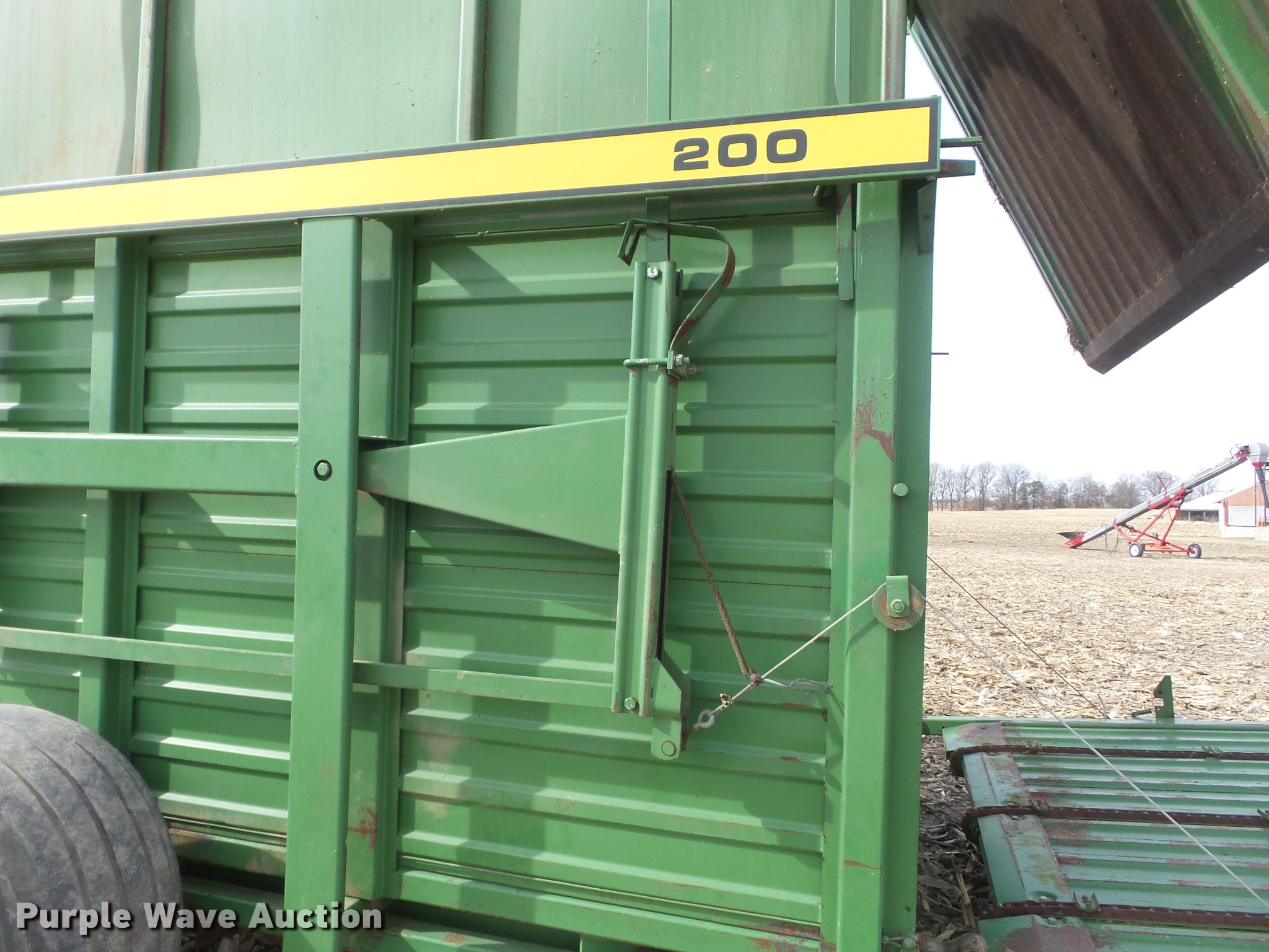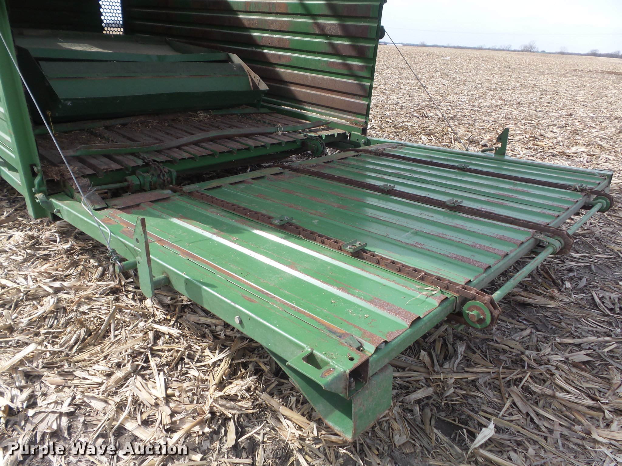 Purple Wave is selling a used Hay Handling in Illinois. This item is a John Deere E0200 bale stacker with the following: 24'L, 144" O.D. tire width, Approx. 8,000 lbs max capacity, Grandy Forage additive applicator, 1000 PTO, Pin hitch, Tandem axle, 16.5L-16.1 tires, Exhaust chute has been removed for storage, included in bed, Tractor not included, Serial 001401