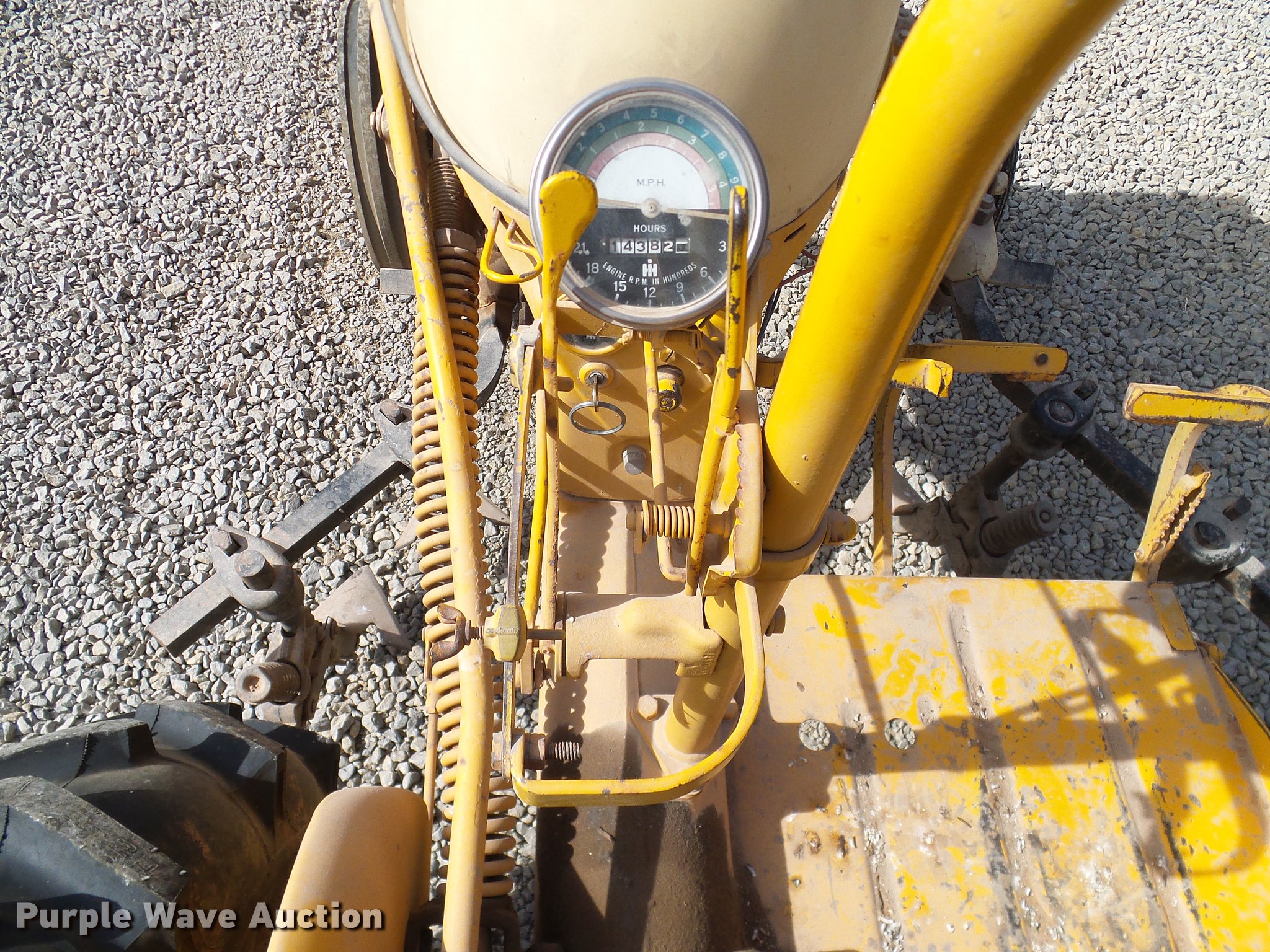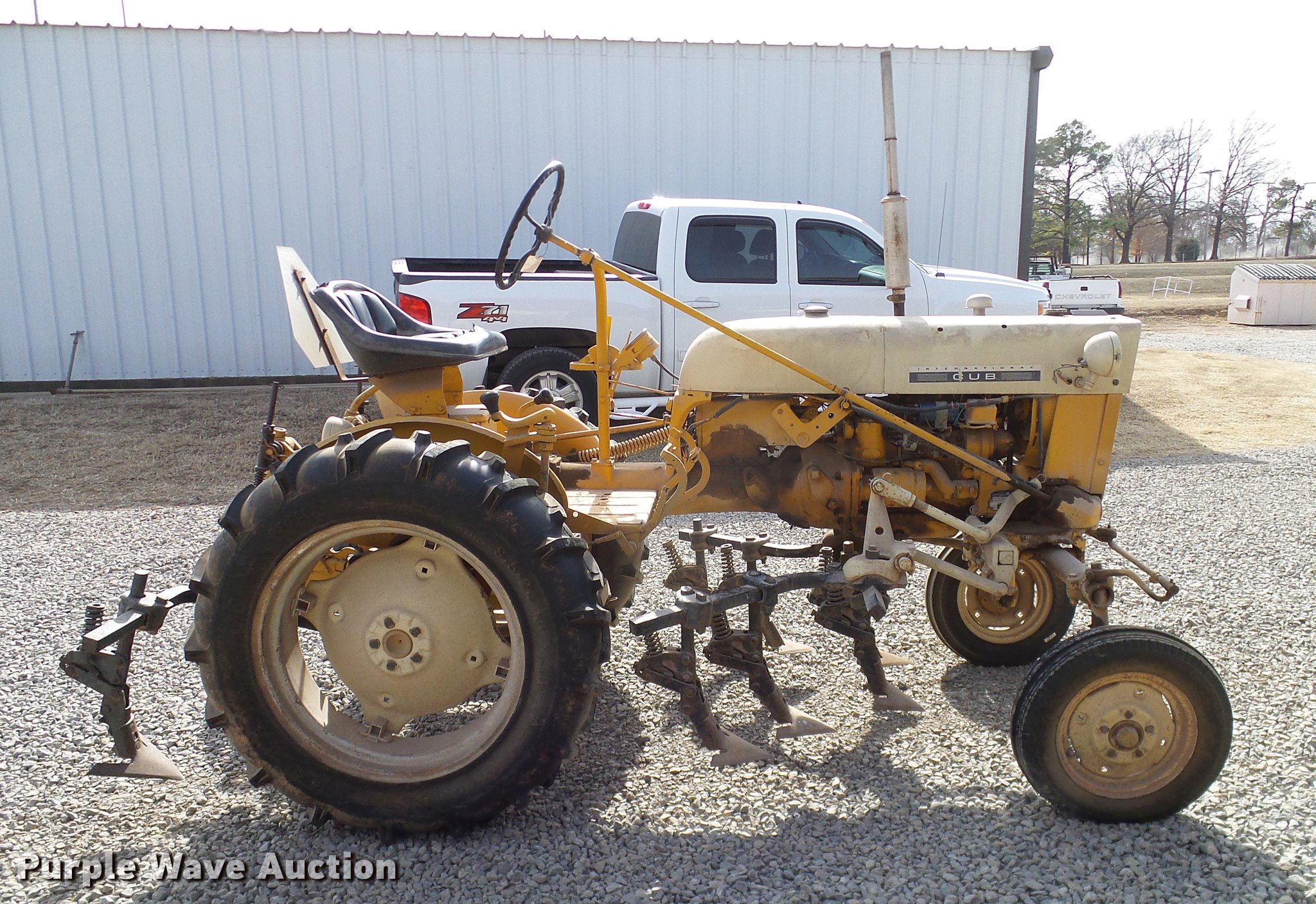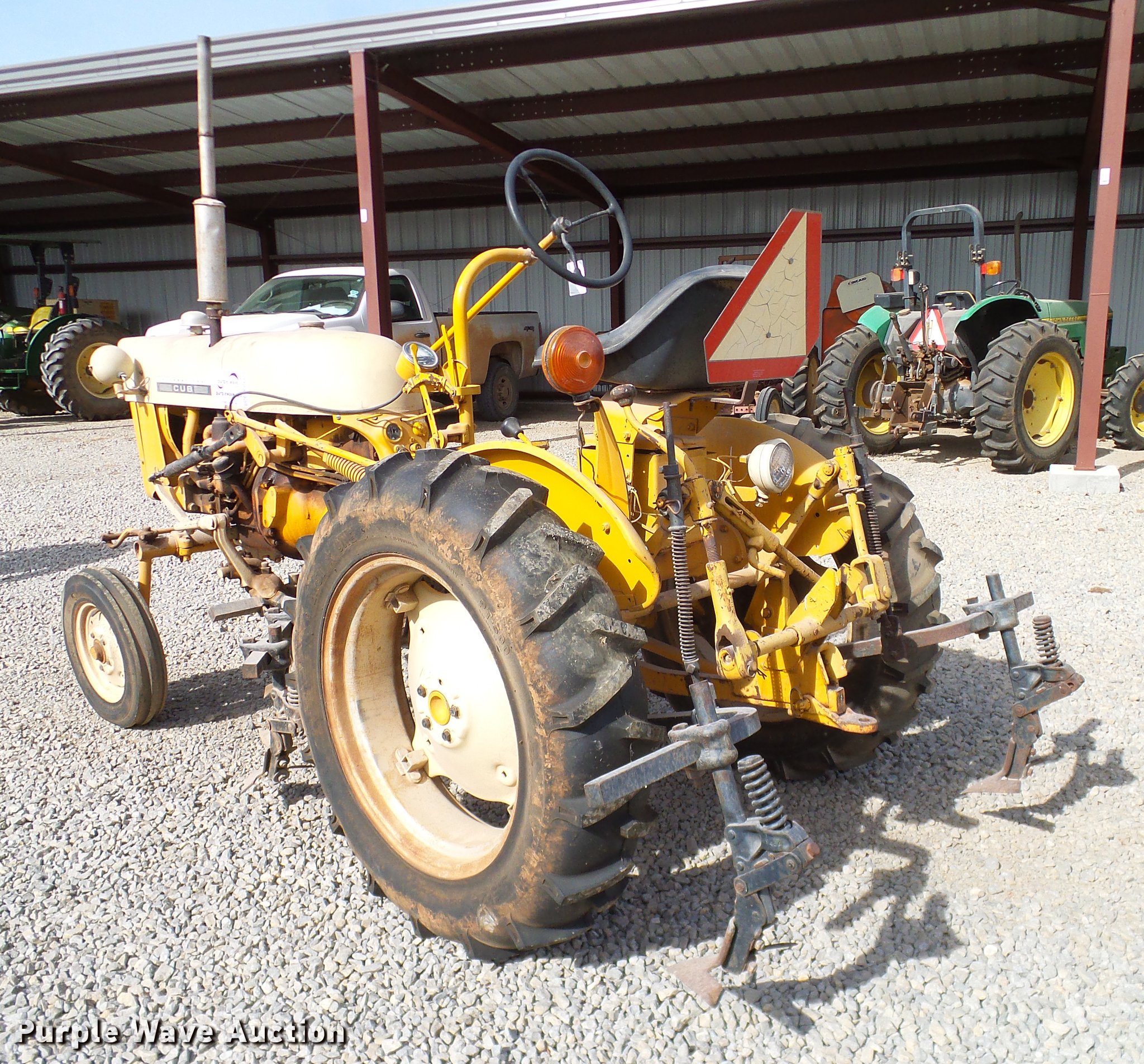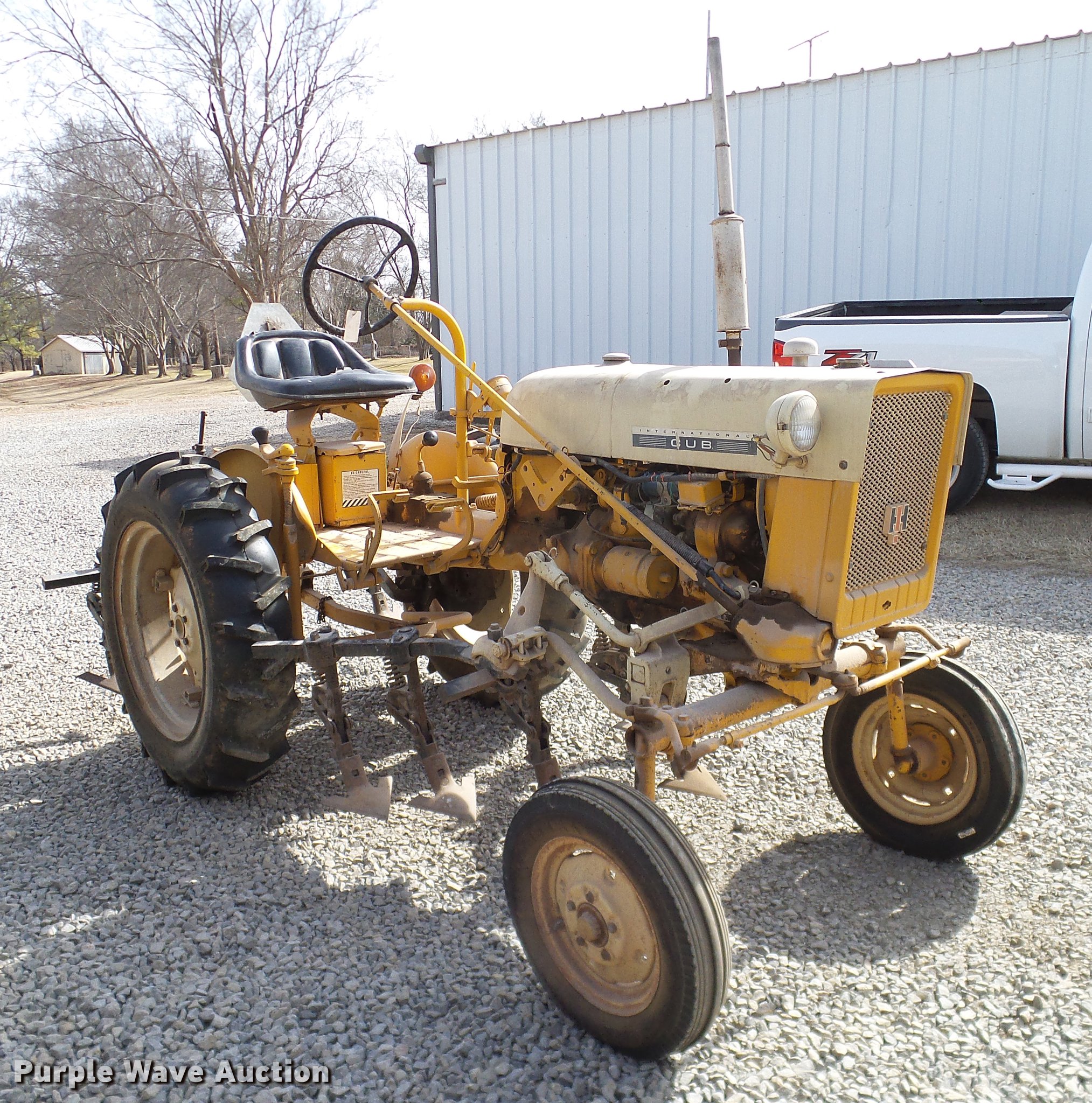 Purple Wave is selling a used Tractor in Oklahoma. This item is a 1970 International Cub tractor with the following: 1,438 hours on meter, International four cylinder gas engine, 13 HP, Sliding gear transmission, 3F-1R gears, Suspension seat, Three point, 540 PTO, Cultivator, (8) shanks, 4.00-12 front tires, 9.5-24 rear tires, Sale# 1827-KP, Serial 235705, Unit# 10086562