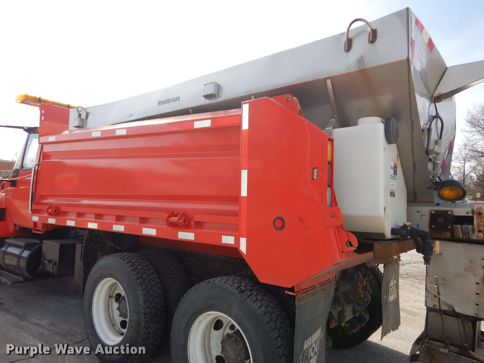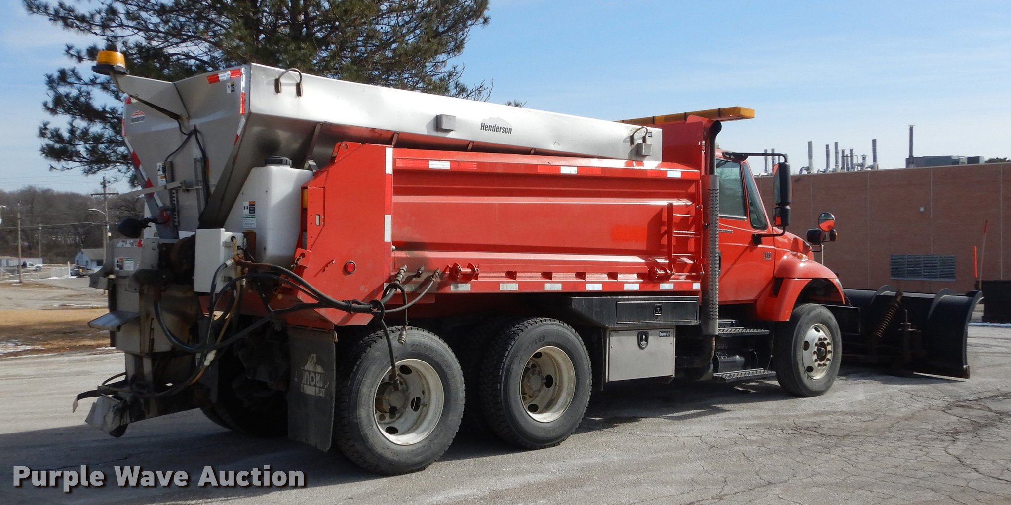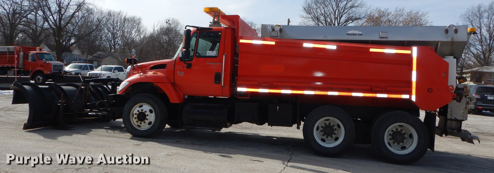 Purple Wave is selling a used Construction Dump Truck in Kansas. This item is a 2007 International 7400 dump truck with the following: 156,086 miles on odometer, 7,181 hours on meter, International DT466 7.6L L6 turbo diesel engine, Allison automatic transmission, Inter-axle differential lock, Tandem axle, AC and heat, Cruise, AM/FM, Heated mirrors, Air suspension seat, Front mounted PTO, Block heater, Henderson steel dump bed, 13.5'L x 96"W, 36" side height, Single ram hoist, Air operated end gate, Toolboxes, Light bar, Henderson spreader, 13'L, Nine cu.yd. capacity, Henderson 11'W snow plow, Single fuel tank, Pintle hitch, Spring over walking beam suspension, Air brakes, 275/80R22.5 front tires, 295/75R22.5 rear tires, GVWR 53,220 lbs, FAWR 13,220 lbs, IAWR 20,000 lbs, REAR 20,000 lbs, Engine pushes water out, KDOT ID 264-1037