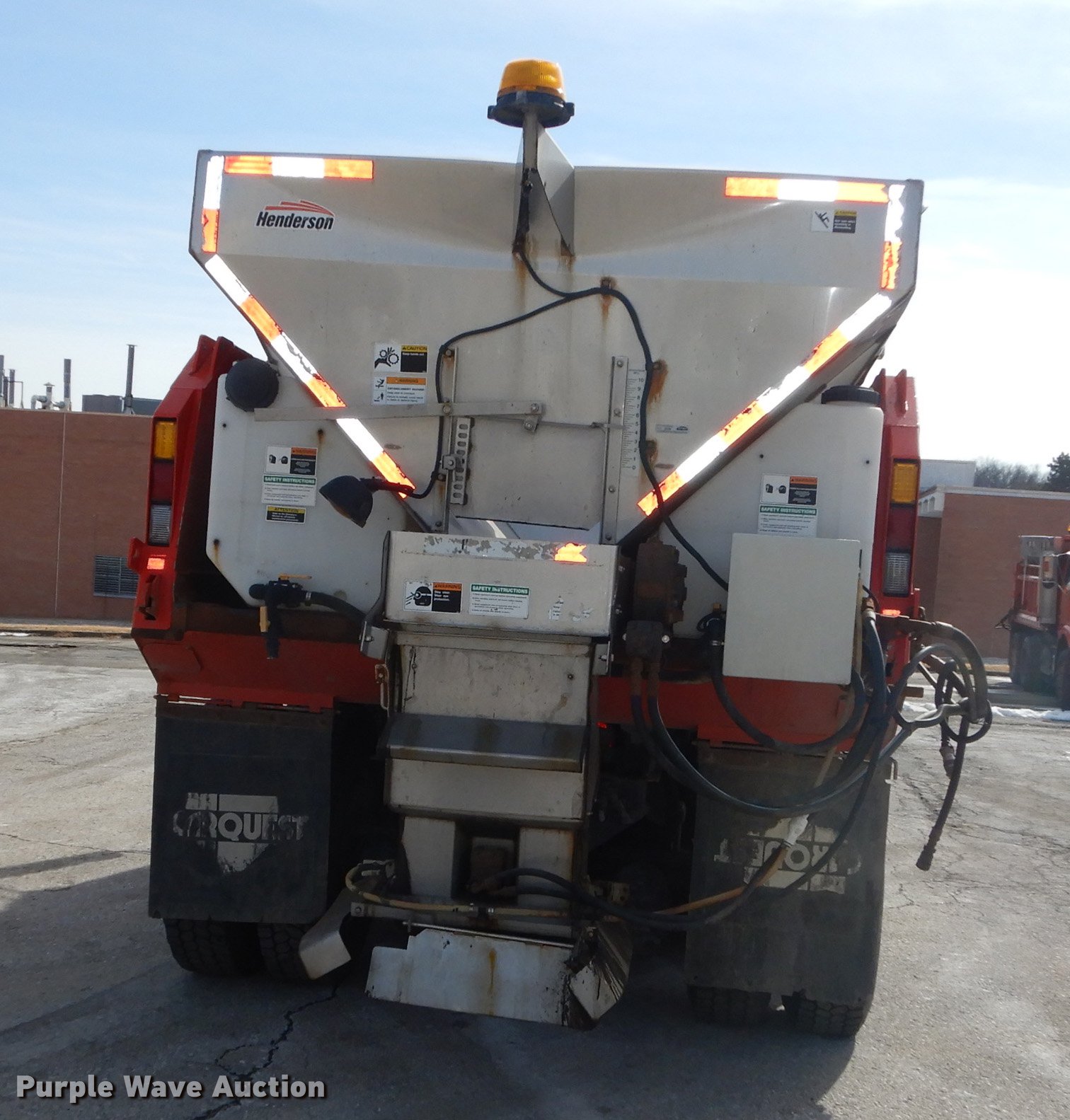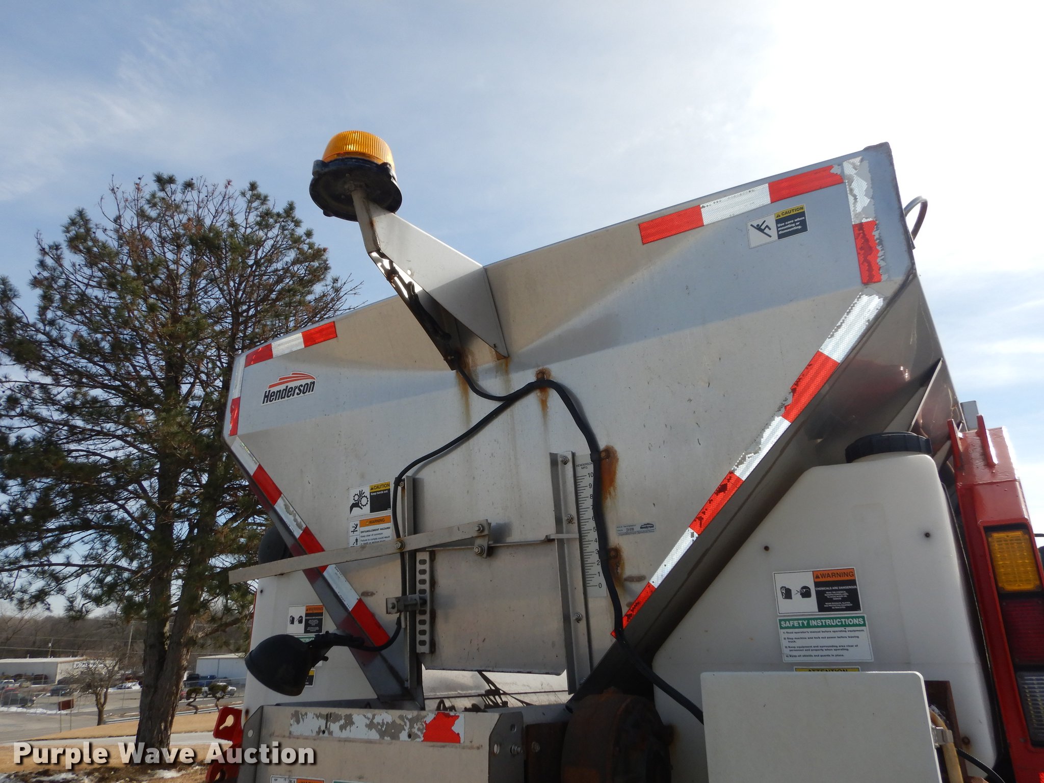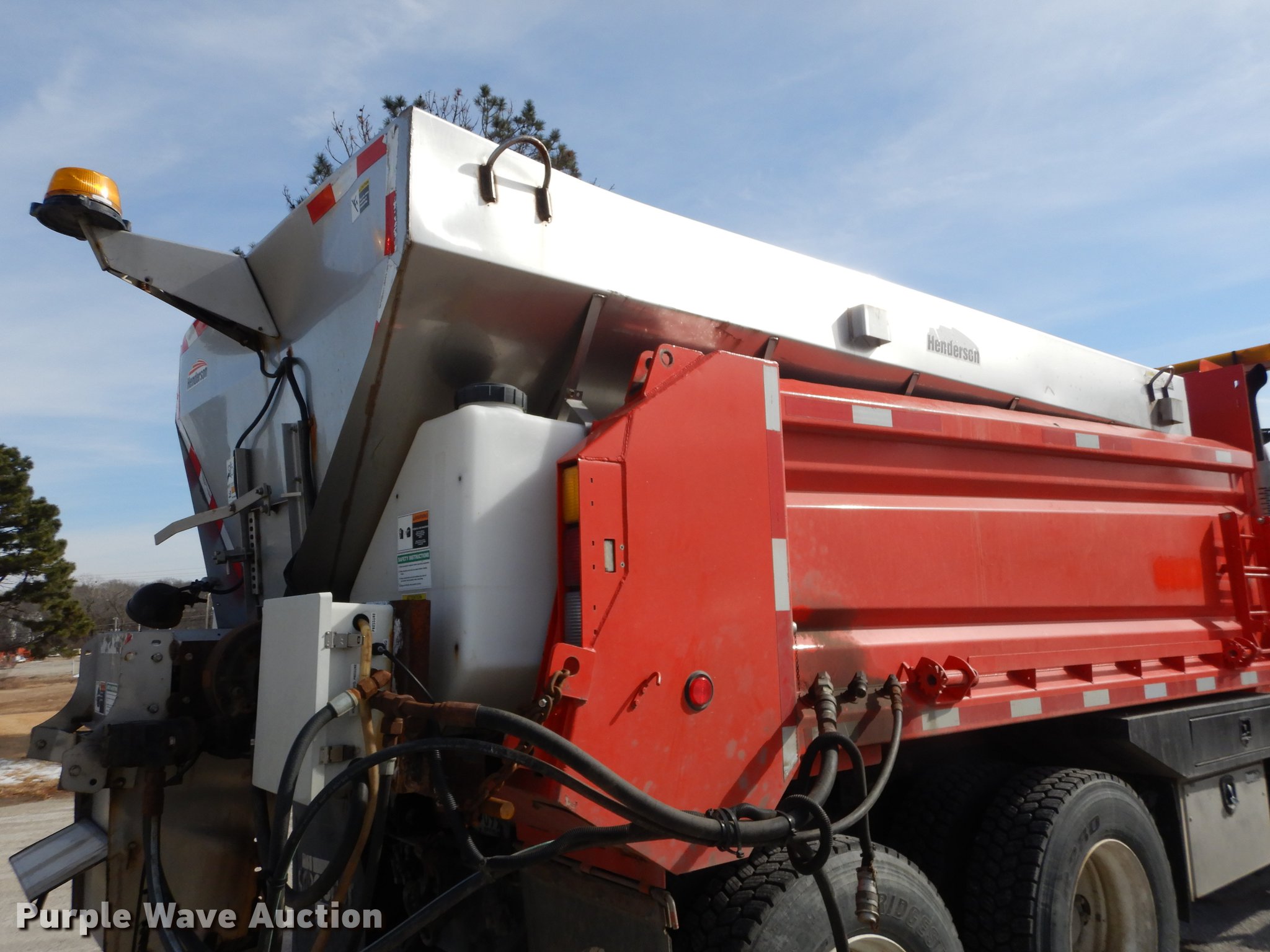 2007 International 7400 dump truck. 156,086 miles on odometer, 7,181 hours on meter, International DT466 7.6L L6 turbo diesel engine, Allison automatic transmission, Inter-axle differential lock, Tandem axle, AC and heat, Cruise, AM/FM, Heated mirrors, Air suspension seat, Front mounted PTO, Block heater, Henderson steel dump bed 13.5'L x 96"W, 36" side height, Single ram hoist, Air operated end gate, Toolboxes, Light bar, Henderson spreader 13'L, Nine cu.yd. capacity, Henderson 11'W snow plow, Single fuel tank, Pintle hitch, Spring over walking beam suspension, Air brakes, 275/80R22.5 front tires, 295/75R22.5 rear tires, GVWR 53,220 lbs, FAWR 13,220 lbs, IAWR 20,000 lbs, REAR 20,000 lbs, Engine pushes water out, KDOT ID 264-1037. Kansas title. Titles will be distributed after confirmation of payment and removal. 1HTWHAAR57J443225. Kansas Department of Transportation - Topeka. 101 SW Gage Blvd. Topeka, KS 66606