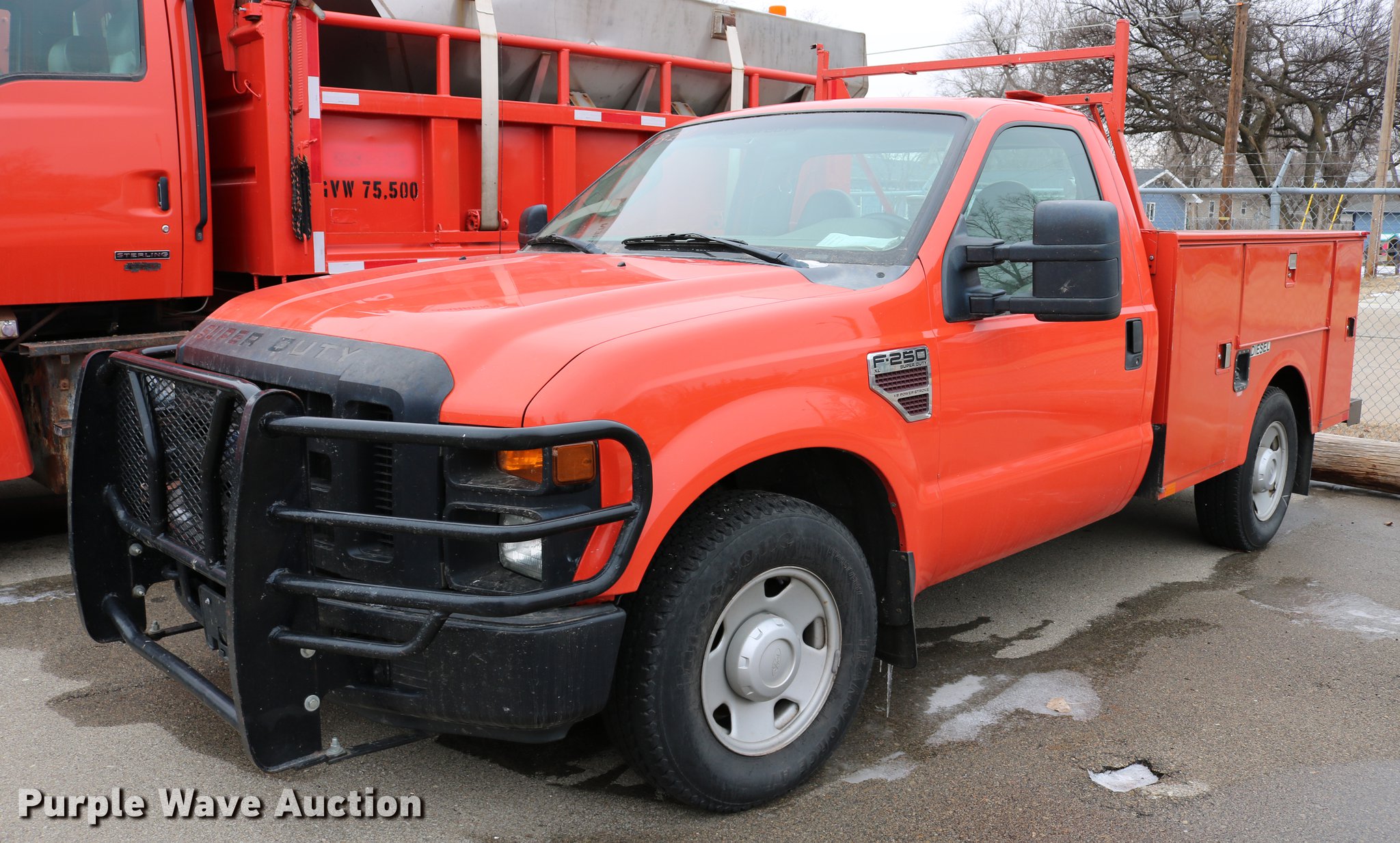 This 2008 Ford F250 Super Duty utility bed pickup truck will sell to the highest bidder regardless of price.