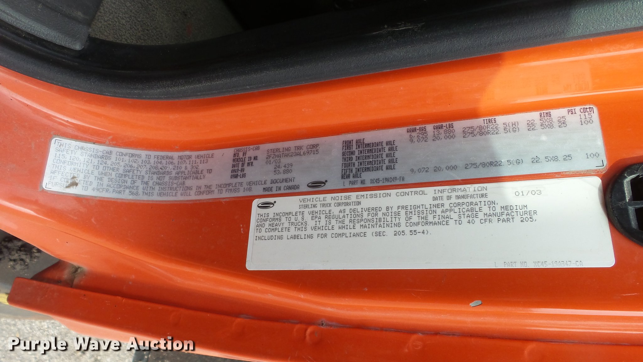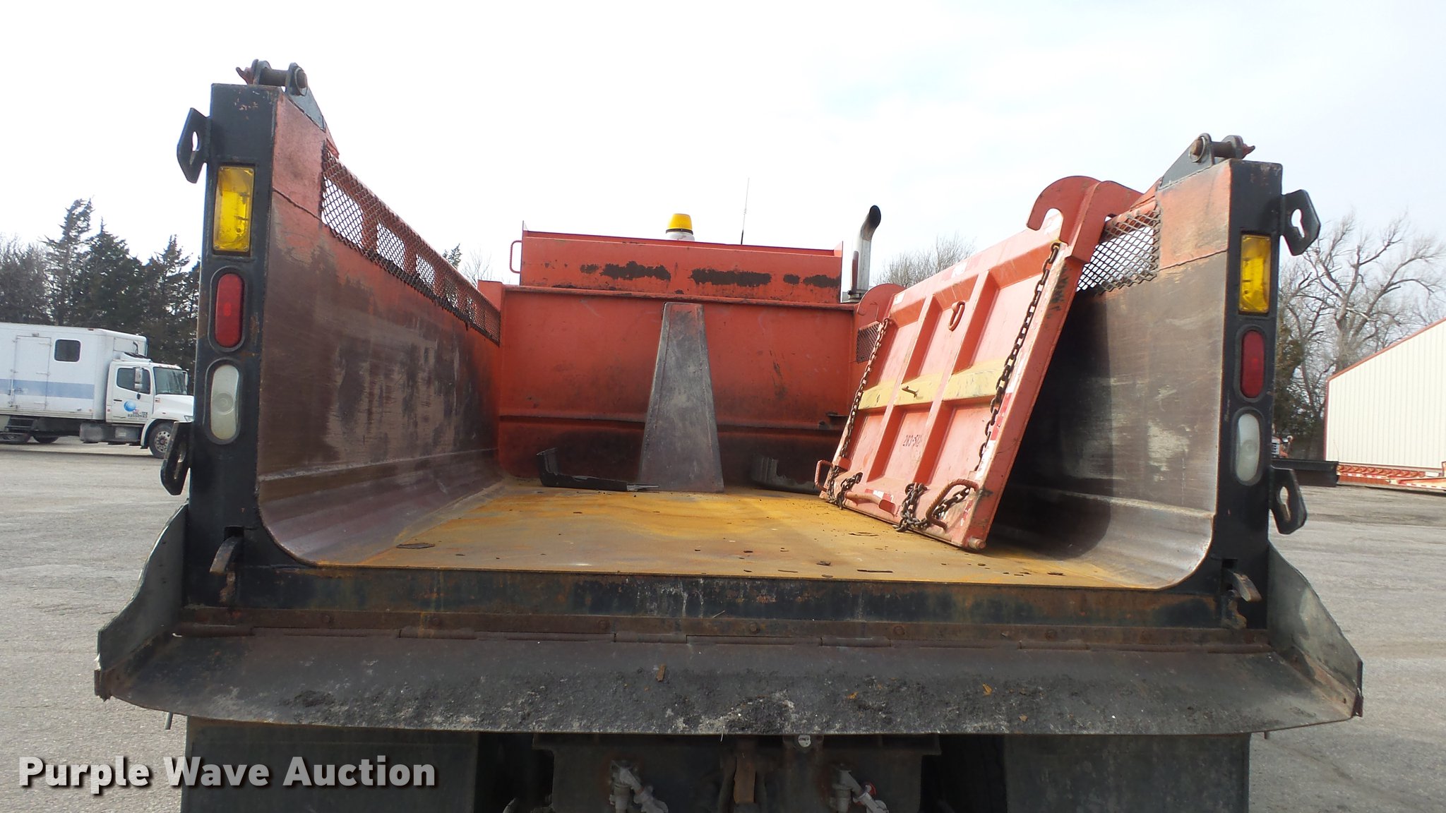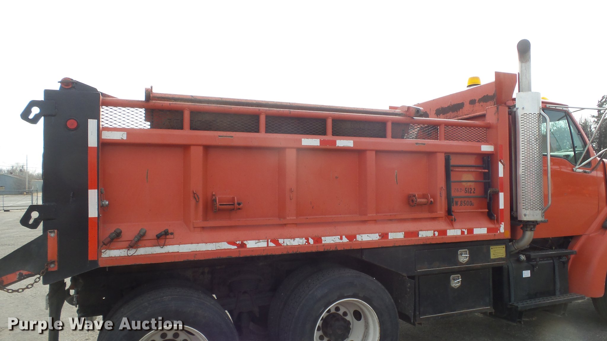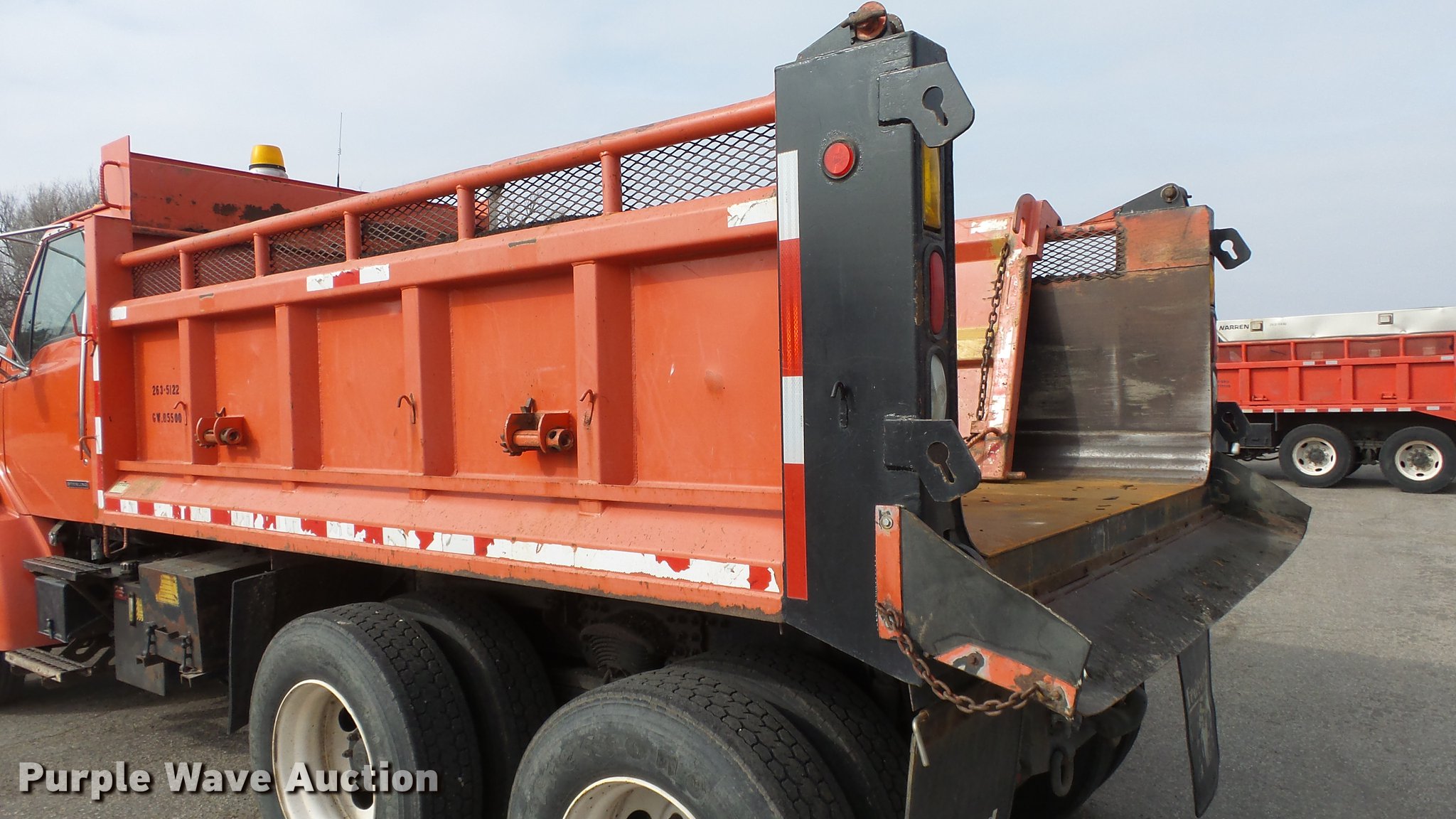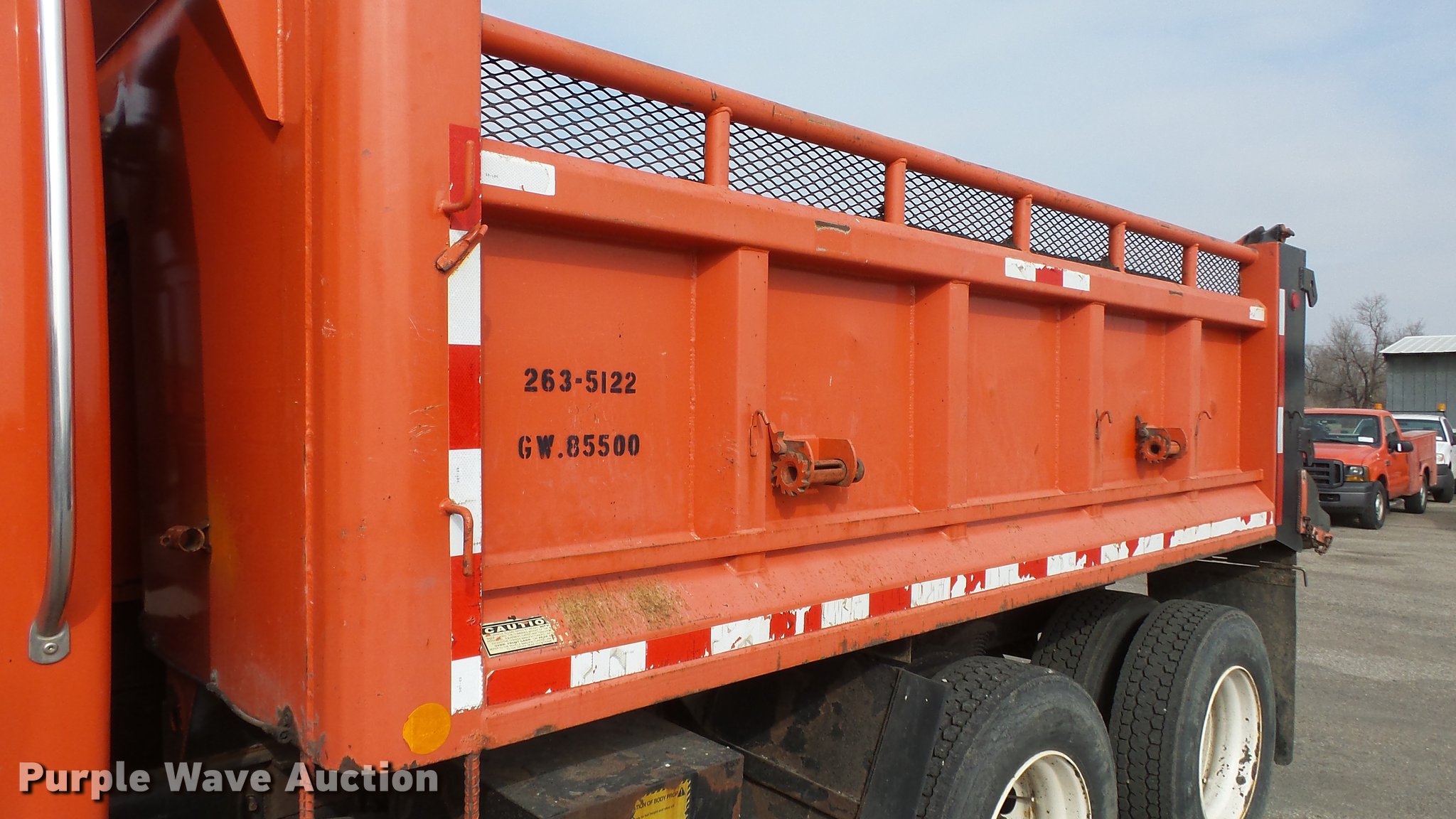 Purple Wave is selling a used Construction Dump Truck in Kansas. This item is a 2003 Sterling LT7501 dump truck with the following: 169,201 miles on odometer, 7,777 hours on meter, Caterpillar 3126 7.2L L6 turbo diesel engine, Allison MD3060 automatic transmission, Inter-axle differential lock, Tandem axle, AC and heat, Heated mirrors, Air suspension seat, Force SSc5100 in-cab controls, Front mounted PTO, Block heater, 13'L x 96"W steel dump bed, 32" side height, Single ram hoist, Monroe 11'W reversible snow plow, Single fuel tank, Pintle hitch, Trailer wiring, Spring suspension, Air brakes, 275/80R22.54 front tires, 295/75R22.5 rear tires, GVWR 53,880 lbs, FAWR 13,880 lbs, IAWR 20,000 lbs, RAWR 20,000 lbs, Batteries dead, Rust, Tires worn, KDOT ID 263-5122