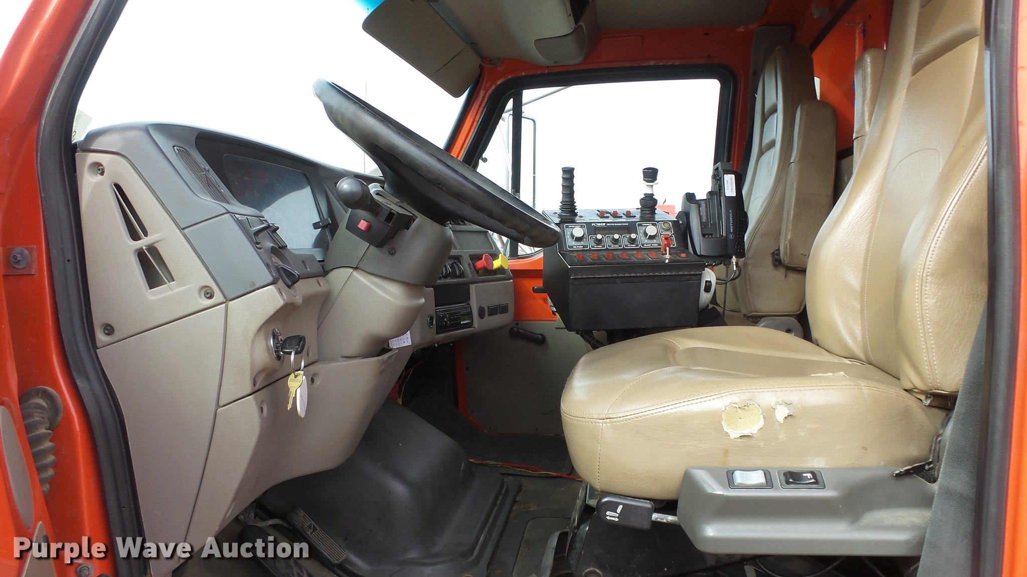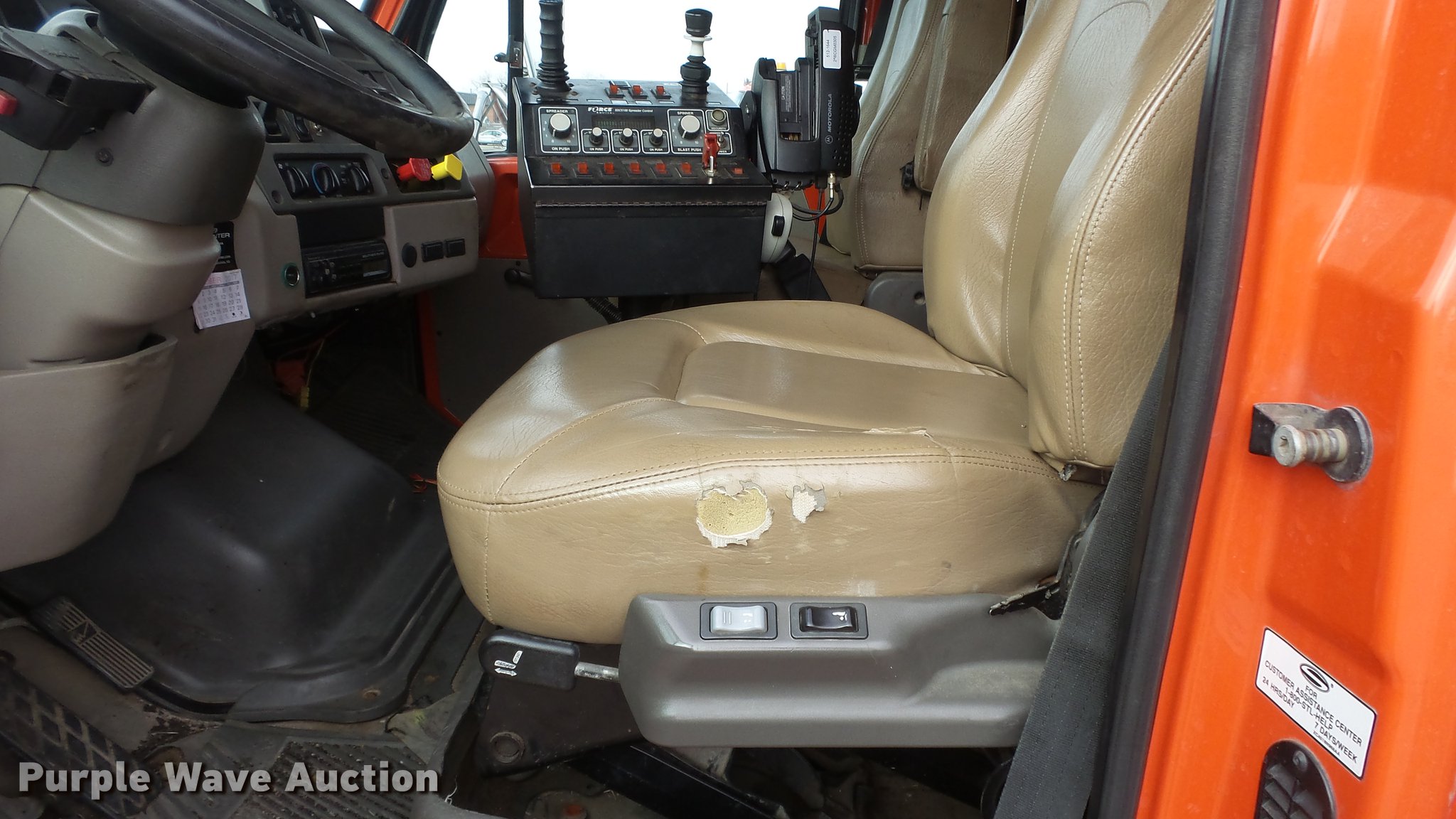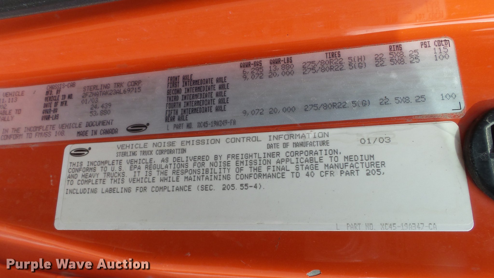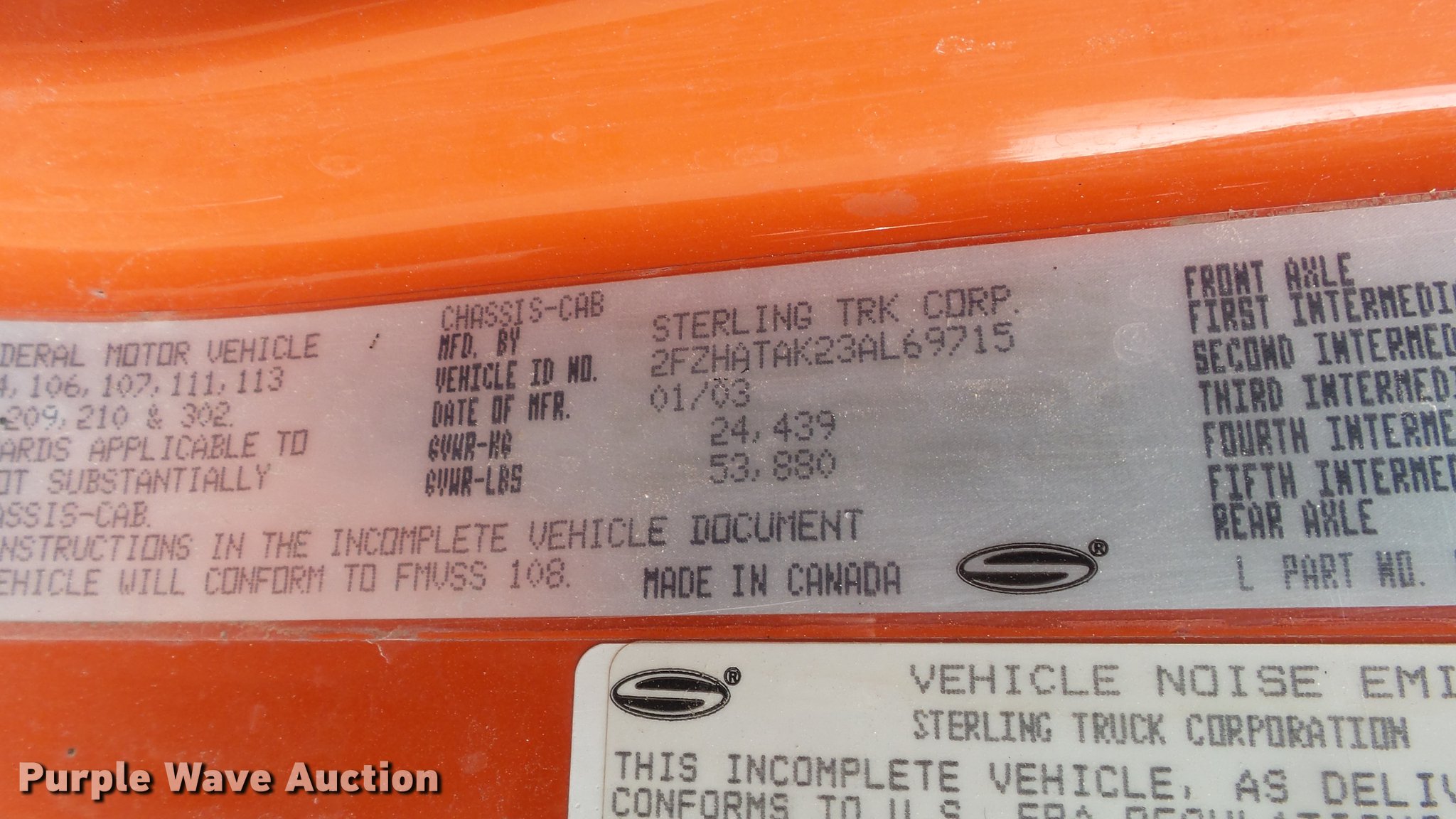 Purple Wave is selling a used Construction Dump Truck in Kansas. This item is a 2003 Sterling LT7501 dump truck with the following: 169,201 miles on odometer, 7,777 hours on meter, Caterpillar 3126 7.2L L6 turbo diesel engine, Allison MD3060 automatic transmission, Inter-axle differential lock, Tandem axle, AC and heat, Heated mirrors, Air suspension seat, Force SSc5100 in-cab controls, Front mounted PTO, Block heater, 13'L x 96"W steel dump bed, 32" side height, Single ram hoist, Monroe 11'W reversible snow plow, Single fuel tank, Pintle hitch, Trailer wiring, Spring suspension, Air brakes, 275/80R22.54 front tires, 295/75R22.5 rear tires, GVWR 53,880 lbs, FAWR 13,880 lbs, IAWR 20,000 lbs, RAWR 20,000 lbs, Batteries dead, Rust, Tires worn, KDOT ID 263-5122