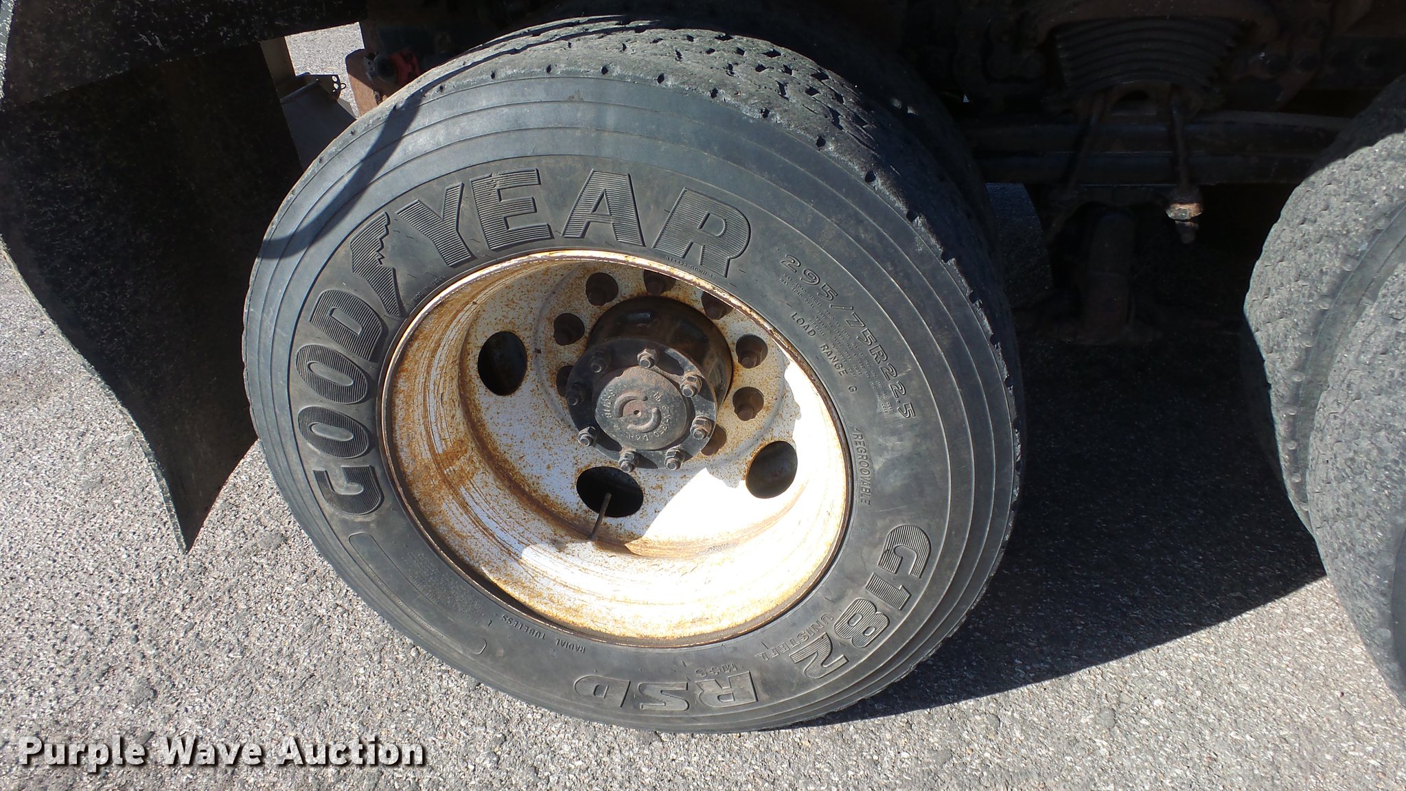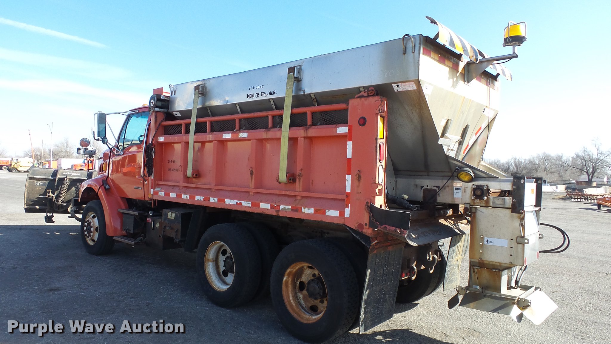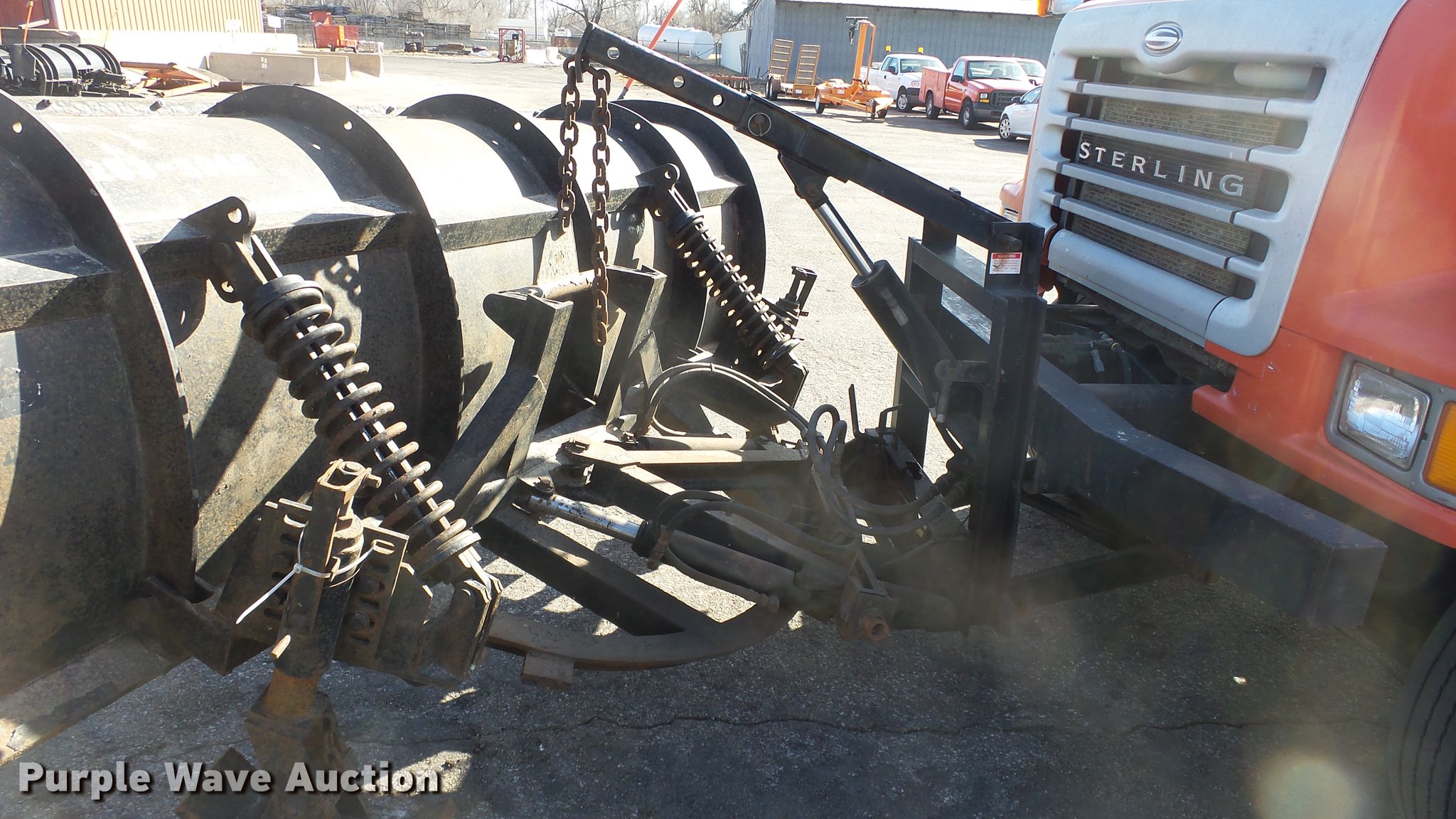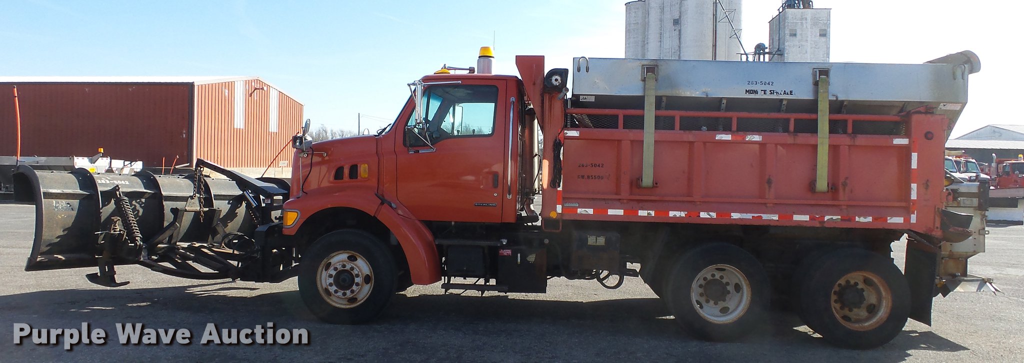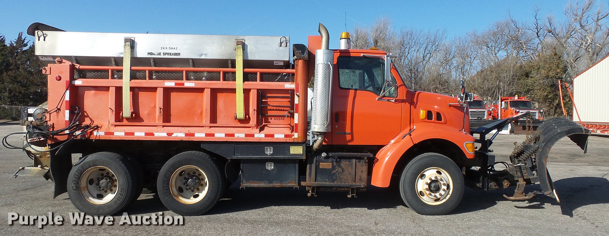 Purple Wave is selling a used Construction Dump Truck in Kansas. This item is a 2003 Sterling LT7501 dump truck with the following: 153,145 miles on odometer, 10,577 hours on meter, Caterpillar 3126 7.2L L6turbo diesel engine, Eaton Fuller Road Ranger RTO10710B-AS2 10 speed manual transmission, Inter-axle differential lock, Tandem axle, AC and heat, Heated mirorrs, Air suspension seat, Force SSC5100 spreader controls, Front mounted PTO, Block heater, 13'L x 8'W steel dump bed, 32" side height, Roll tarp, Single ram hoist, Tailgate, Monroe stainless steel spreader, Nine cu.yd. capacity, Monroe 11'W reversible snow plow, Single fuel tank, Pintle hitch, Trailer wiring, Spring suspension, Air brakes, 295/75R22.5 tires, GVWR 53,880 lbs, FAWR 13,880 lbs, IAWR 20,000 lbs, RAWR 20,000 lbs, Batteries dead, Scratches and dents, Rust, Tires worn, KDOT ID 263-5042