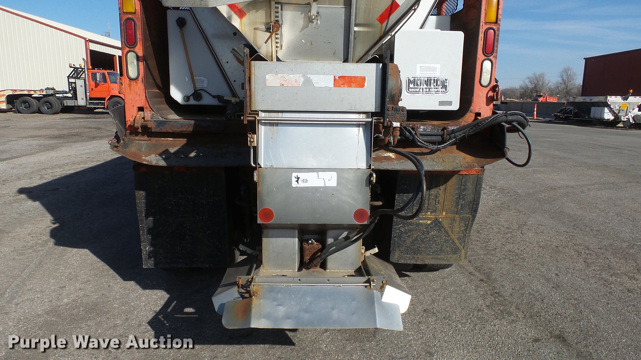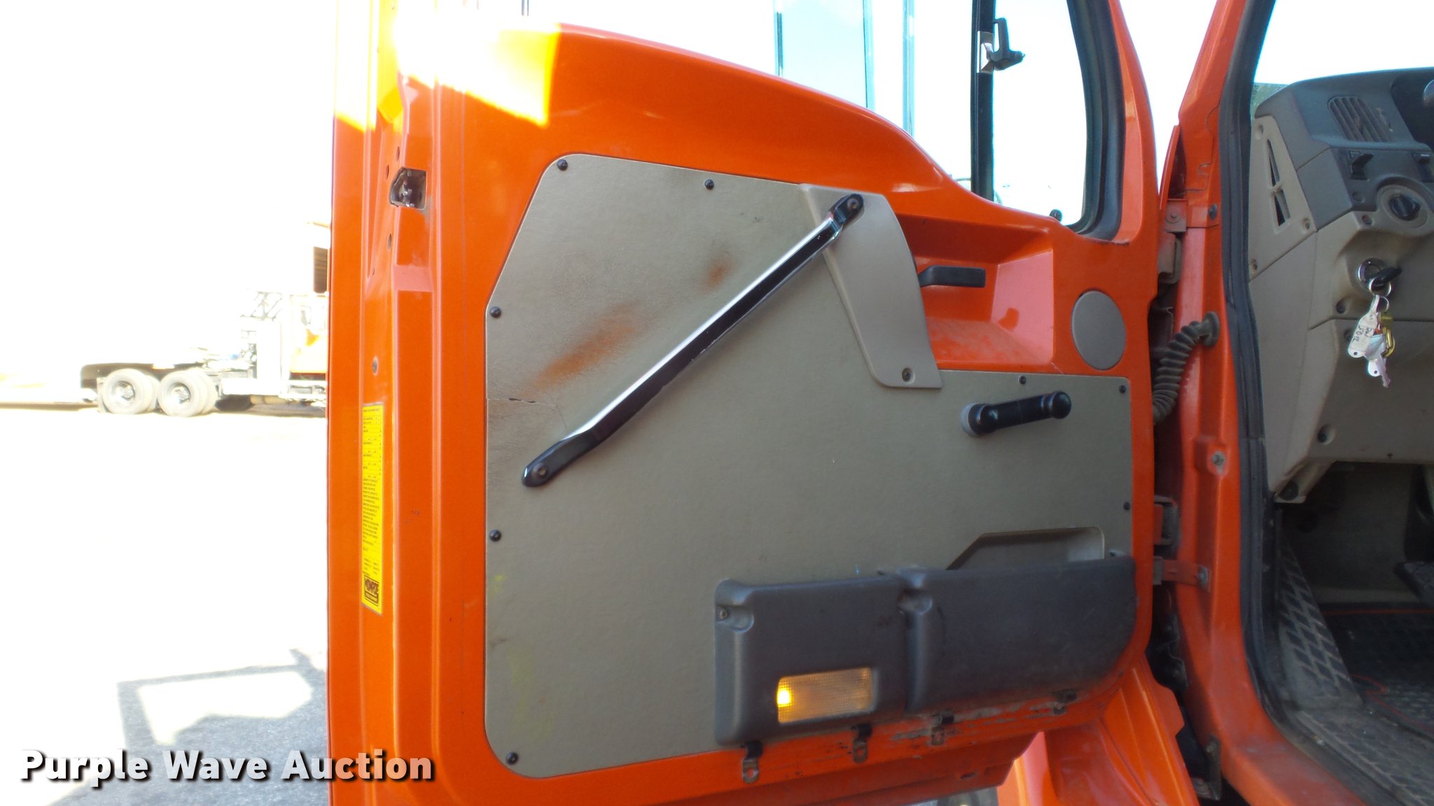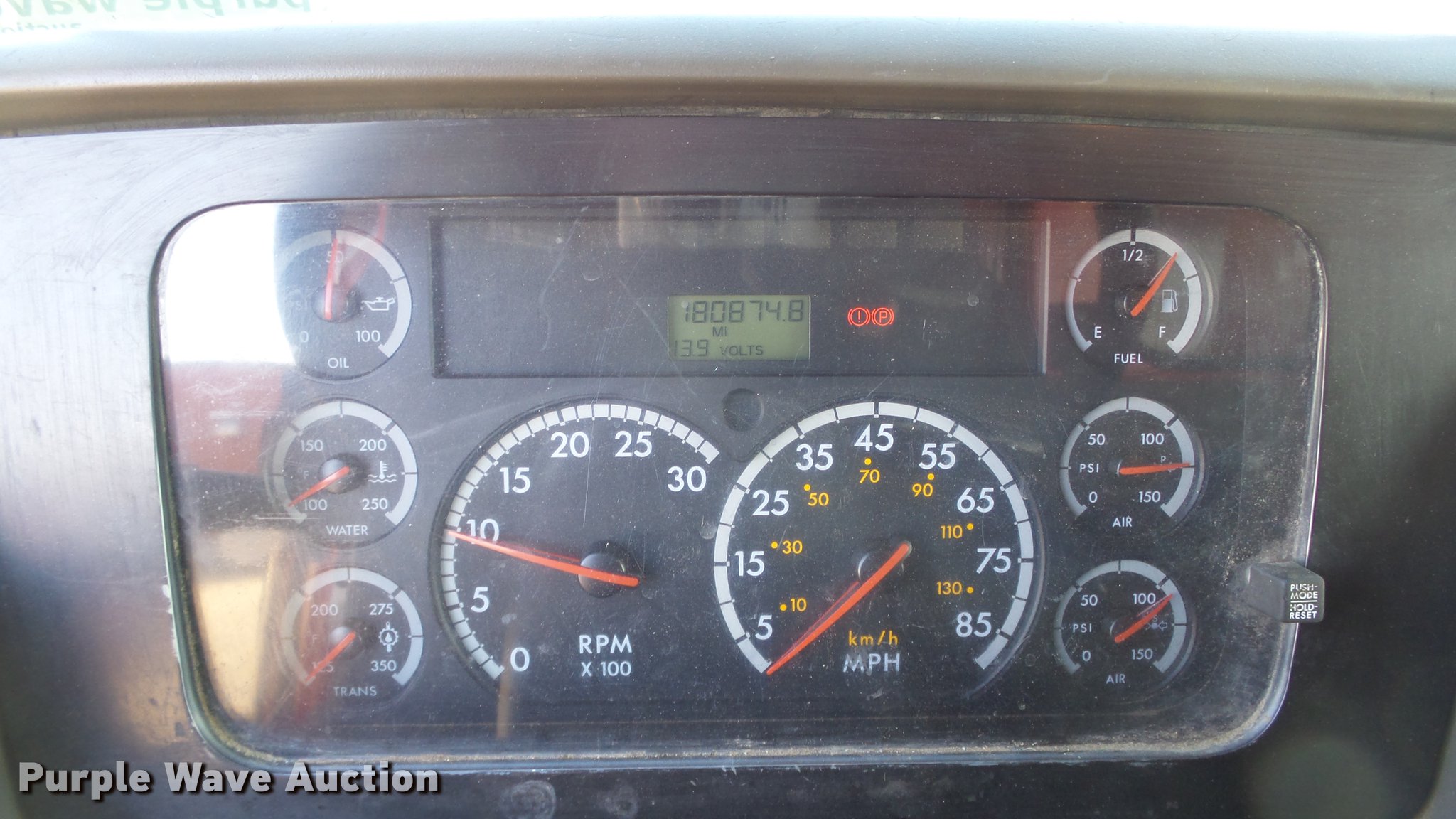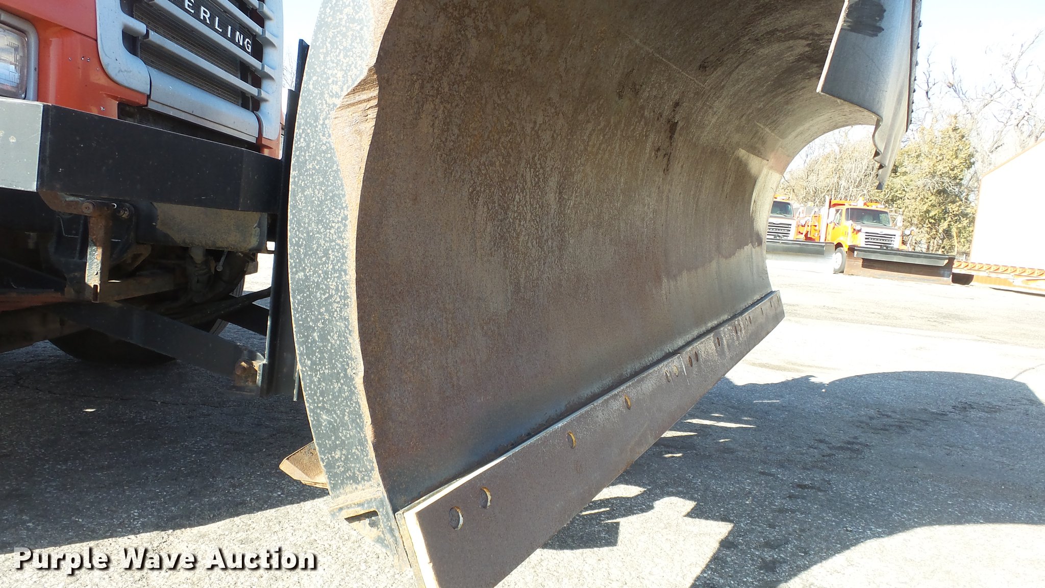 Purple Wave is selling a used Construction Dump Truck in Kansas. This item is a 2003 Sterling LT7501 dump truck with the following: 153,145 miles on odometer, 10,577 hours on meter, Caterpillar 3126 7.2L L6turbo diesel engine, Eaton Fuller Road Ranger RTO10710B-AS2 10 speed manual transmission, Inter-axle differential lock, Tandem axle, AC and heat, Heated mirorrs, Air suspension seat, Force SSC5100 spreader controls, Front mounted PTO, Block heater, 13'L x 8'W steel dump bed, 32" side height, Roll tarp, Single ram hoist, Tailgate, Monroe stainless steel spreader, Nine cu.yd. capacity, Monroe 11'W reversible snow plow, Single fuel tank, Pintle hitch, Trailer wiring, Spring suspension, Air brakes, 295/75R22.5 tires, GVWR 53,880 lbs, FAWR 13,880 lbs, IAWR 20,000 lbs, RAWR 20,000 lbs, Batteries dead, Scratches and dents, Rust, Tires worn, KDOT ID 263-5042