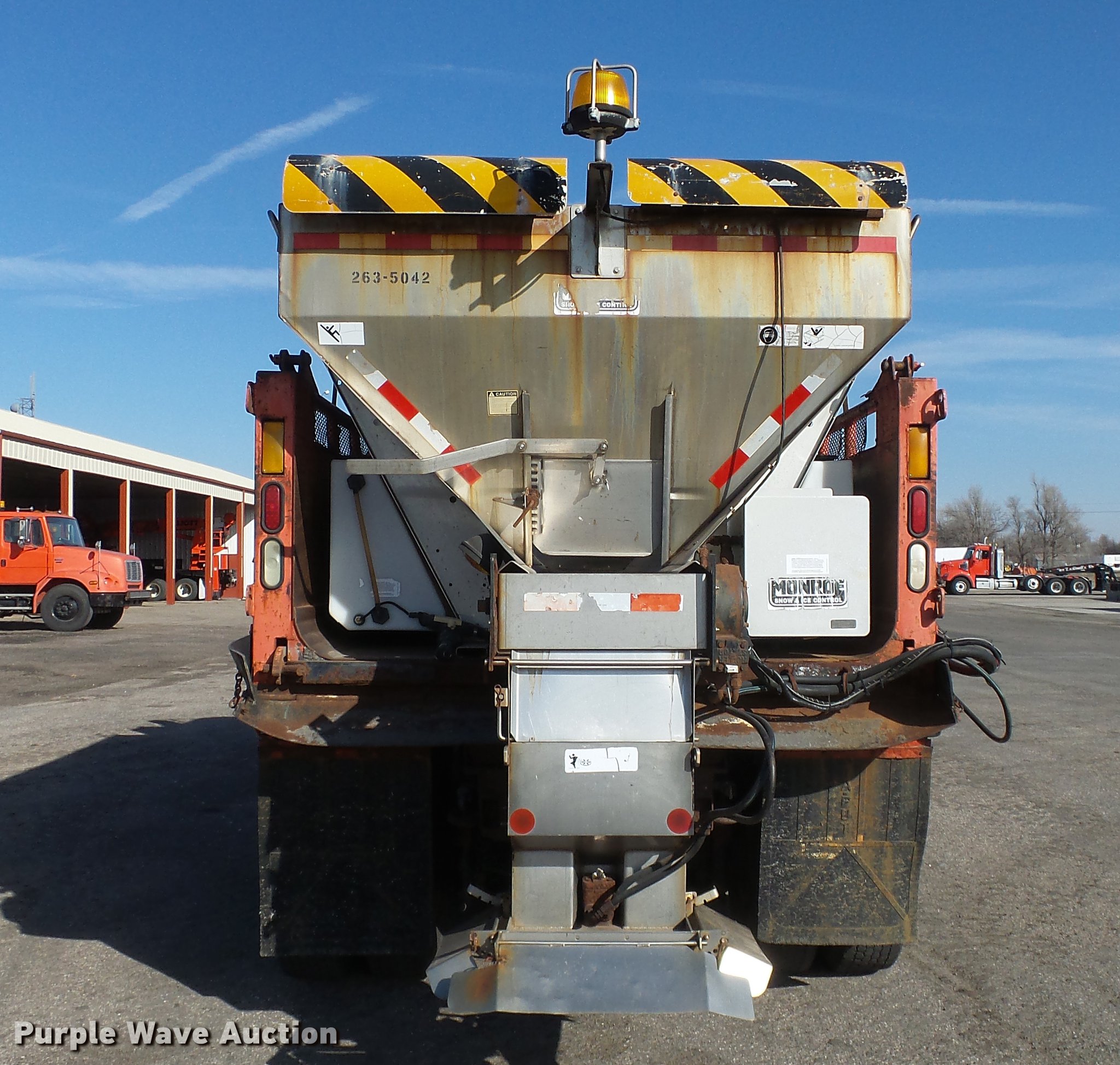 2003 Sterling LT7501 dump truck. 153,145 miles on odometer, 10,577 hours on meter, Caterpillar 3126 7.2L L6turbo diesel engine, Eaton Fuller Road Ranger RTO10710B-AS2 10 speed manual transmission, Inter-axle differential lock, Tandem axle, AC and heat, Heated mirorrs, Air suspension seat, Force SSC5100 spreader controls, Front mounted PTO, Block heater, 13'L x 8'W steel dump bed 32" side height, Roll tarp, Single ram hoist, Tailgate, Monroe stainless steel spreader Nine cu.yd. capacity, Monroe 11'W reversible snow plow, Single fuel tank, Pintle hitch, Trailer wiring, Spring suspension, Air brakes, 295/75R22.5 tires, GVWR 53,880 lbs, FAWR 13,880 lbs, IAWR 20,000 lbs, RAWR 20,000 lbs, Batteries dead, Scratches and dents, Rust, Tires worn, KDOT ID 263-5042. Kansas title. Titles will be distributed after confirmation of payment and removal. 2FZHATAK93AL69677. Kansas Department of Transportation - Hutchinson. 500 Hendricks St. Hutchinson, KS 67501