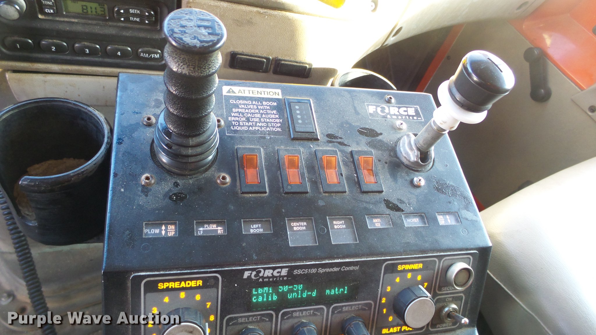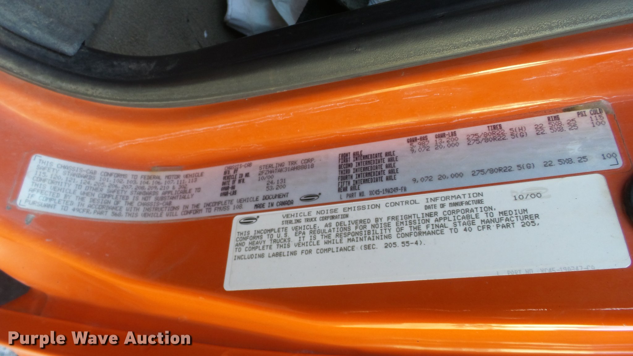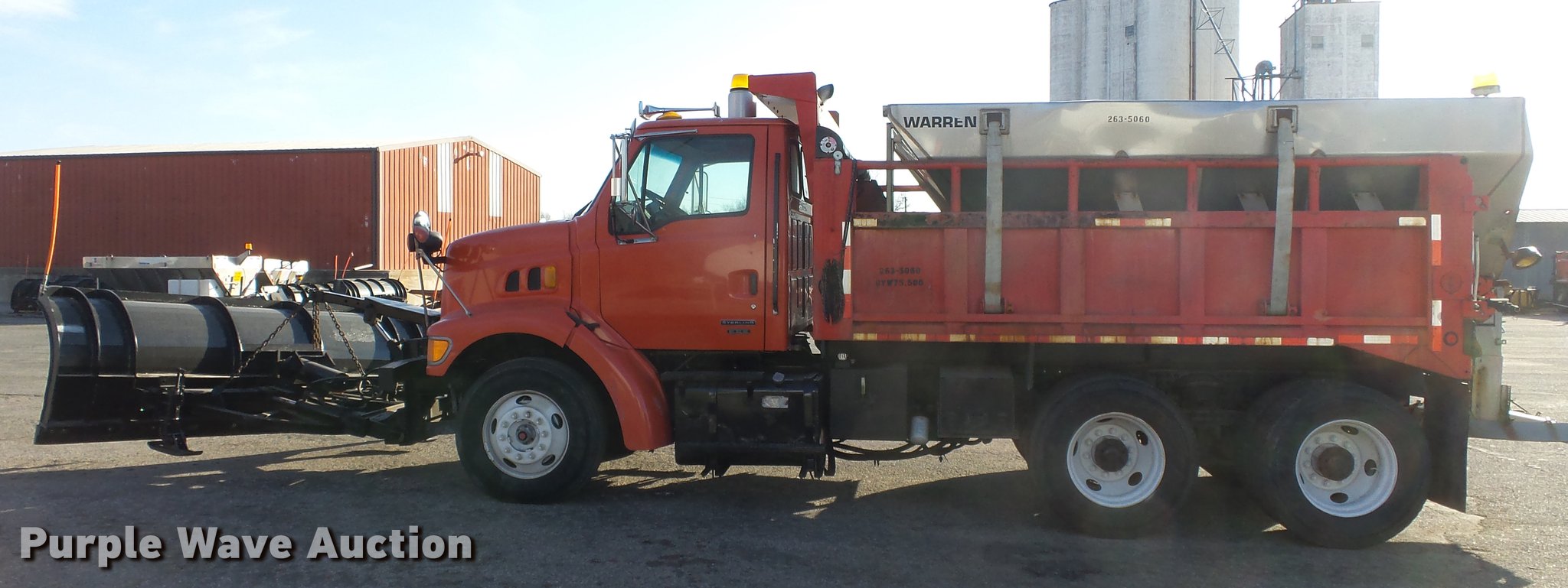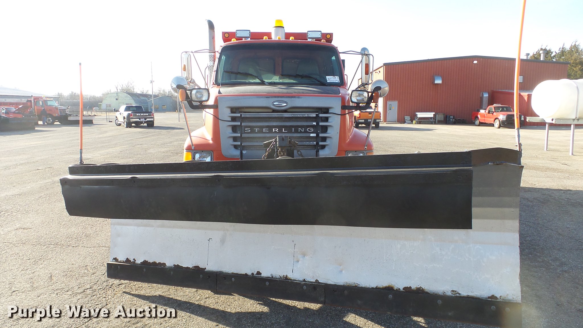 Purple Wave is selling a used Construction Dump Truck in Kansas. This item is a 2001 Sterling LT7501 dump truck with the following: 221,754 miles on odometer, 12,076 hours on meter, Caterpillar 3126 7.2L L6 turbo diesel engine, Allison MD3060 automatic transmission, Inter-axle differential lock, Tandem axle, AC and heat, Cruise, Heated mirrors, Air suspension seat, Force SSC5100 spreader controls, Front mounted PTO, Block heater, Warren steel dump bed, 13'L x 8'W, 32" side height, Roll tarp, Single ram hoist, Flink stainless steel nine cu.yd. spreader, Flink 11'W reversible snow plow, Single fuel tank, Pintle hitch, Trailer wiring, Spring suspension, Air brakes, 295/75R22.5 tires, GVWR 53,200 lbs, FAWR 13,200 lbs, IAWR 20,000 lbs, RAWR 20,000 lbs, No tailgate, Batteries dead, Rust, Tires worn, KDOT ID 263-5060