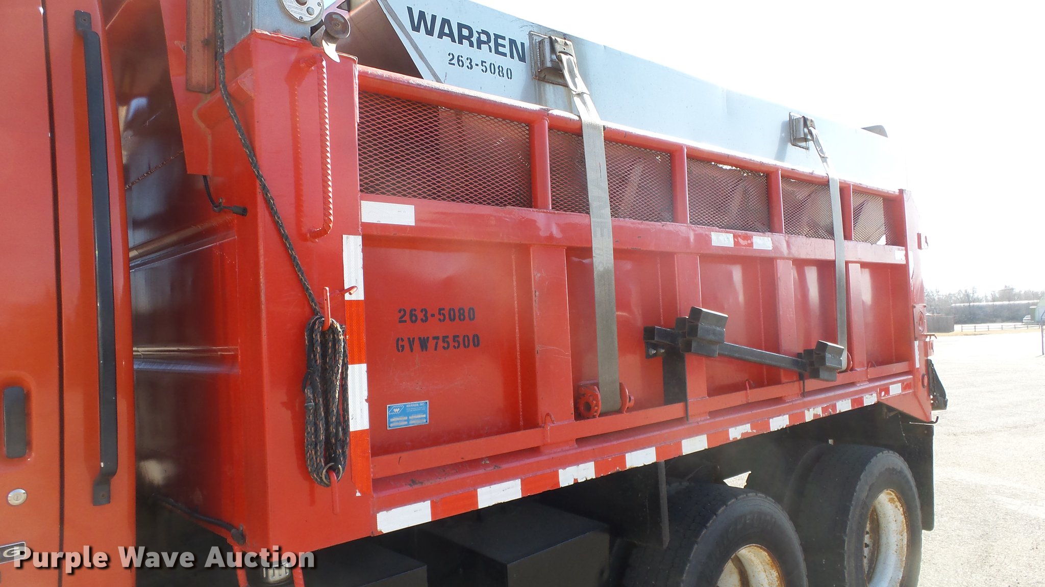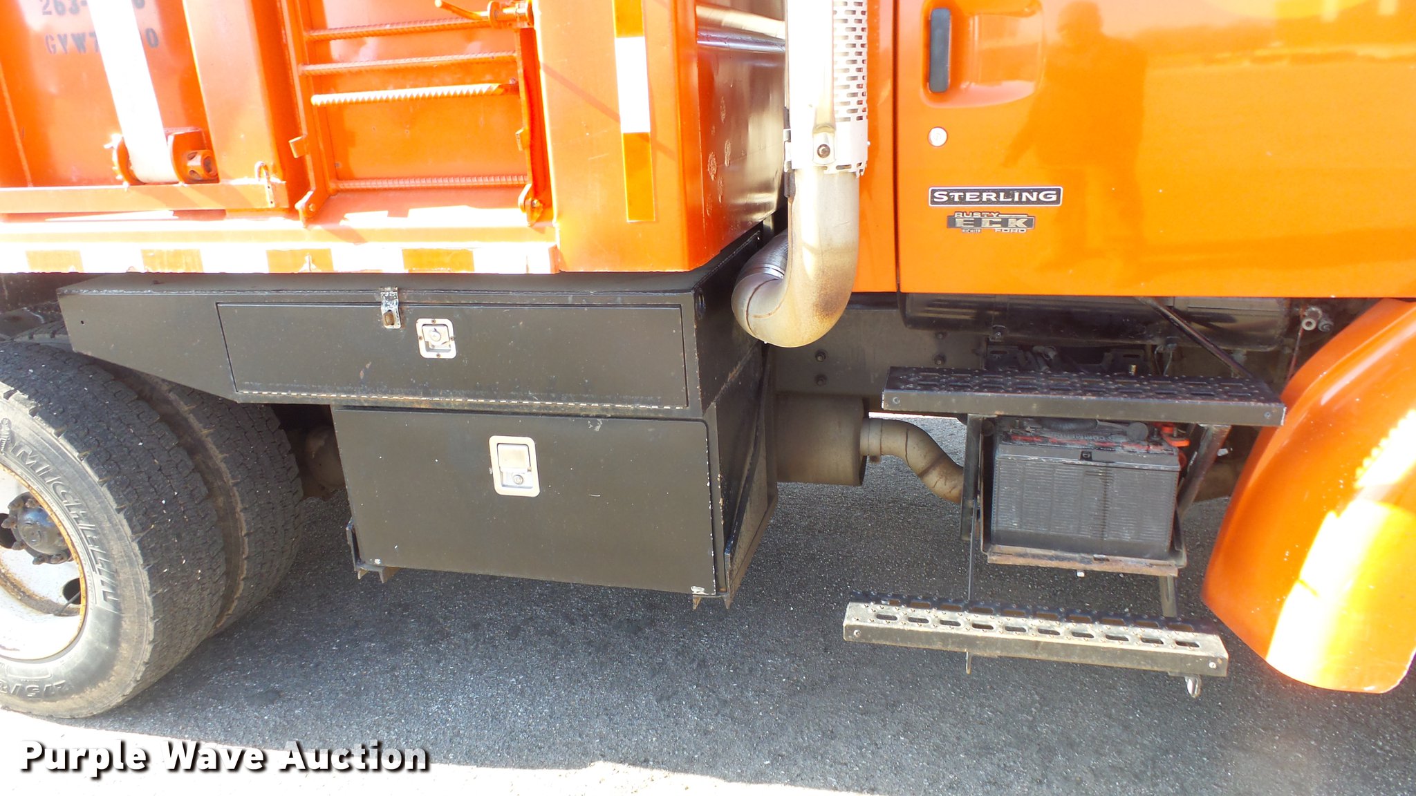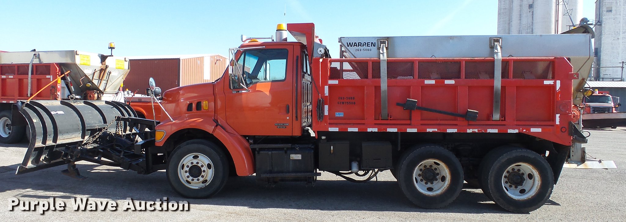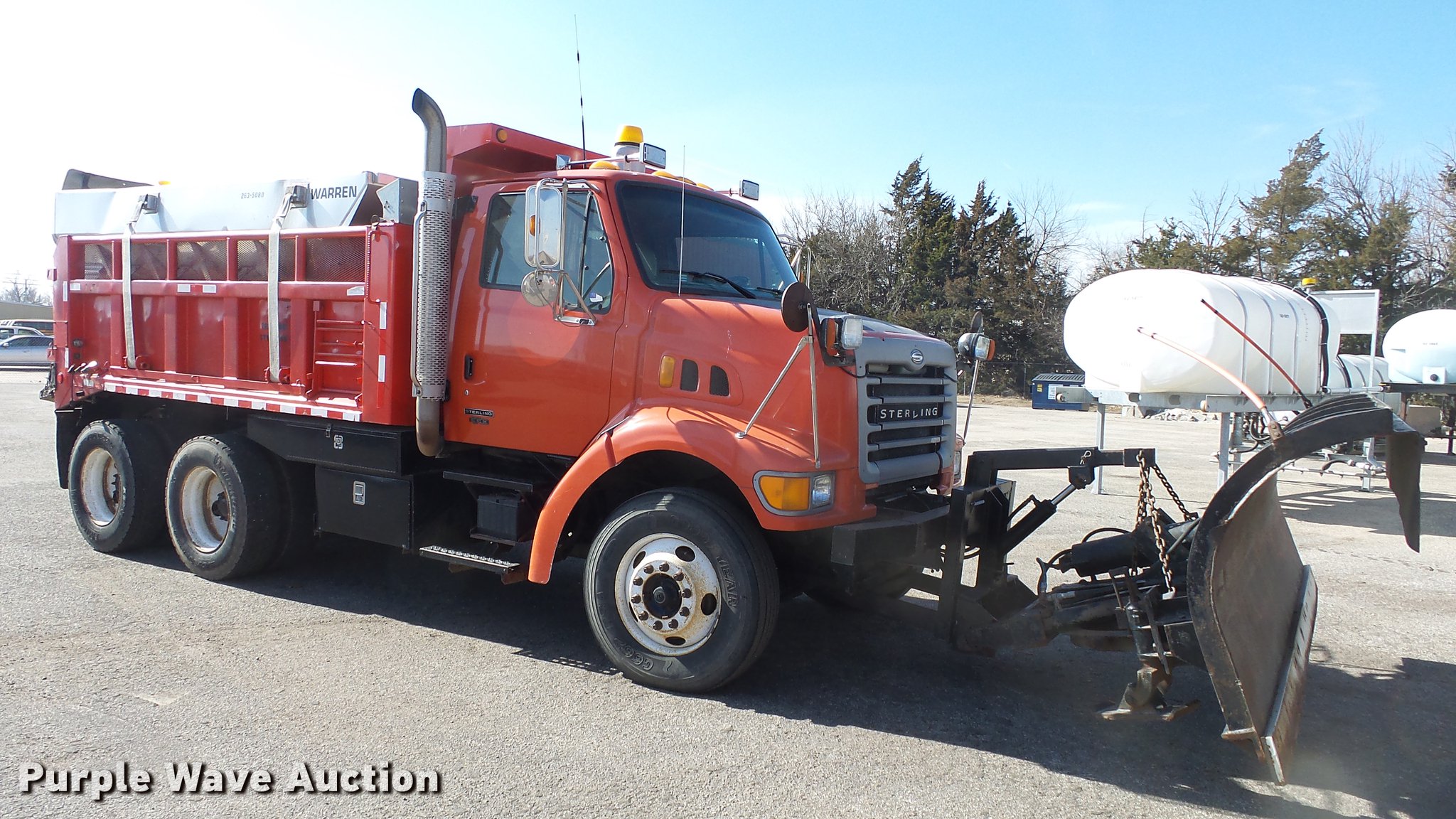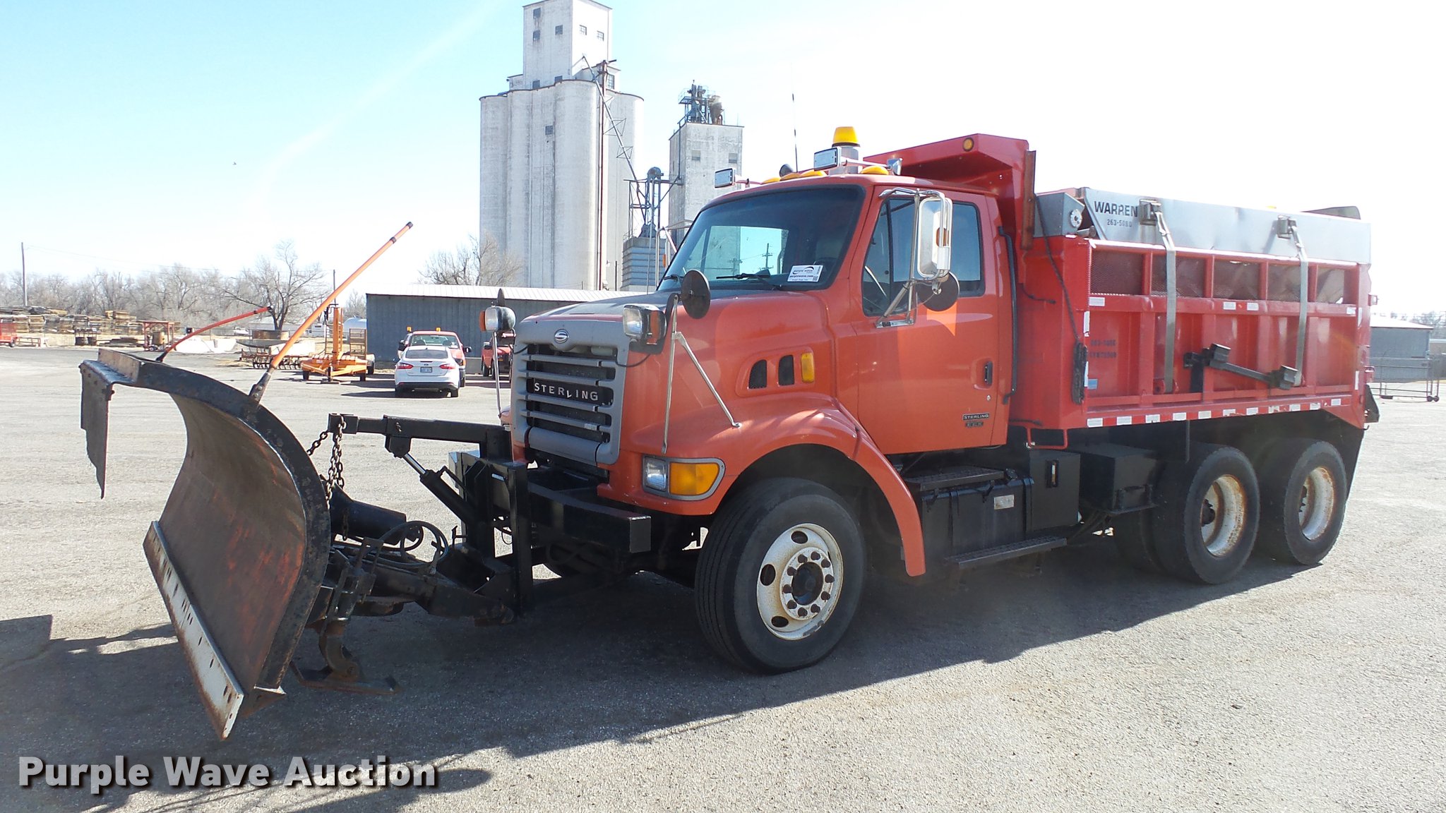 Purple Wave is selling a used Construction Dump Truck in Kansas. This item is a 2001 Sterling LT7501 dump truck with the following: 197,961 miles on odometer, 10,174 hours no meter, Caterpillar 3126 7.2L L6 turbo diesel engine, Allison MD3060 automatic transmission, Inter-axle differential lock, Tandem axle, AC and heat, Heated mirrors, Air suspension seat, Force SSC5100 spreader controls, Front mounted PTO, Block heater, Warren steel dump bed, 13'L x 8'W, 32" side height, Roll tarp, Single ram hoist, Warren stainless steel spreader, Nine cu.yd. capacity, Flink 11'W reversible spreader, Single fuel tank, Pintle hitch, Trailer wiring, Spring suspension, Air brakes, GVWR 53,200 lbs, FAWR 13,200 lbs, IAWR 20,000 lbs, RAWR 20,000 lbs, No tailgate, Diesel fuel in coolant, Wheel seal leaking, Batteries dead, Rust, Tires worn, KDOT ID 263-5080