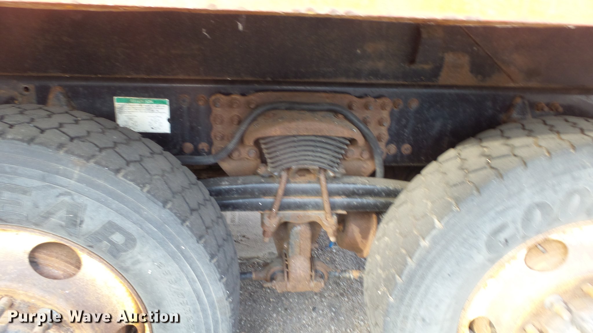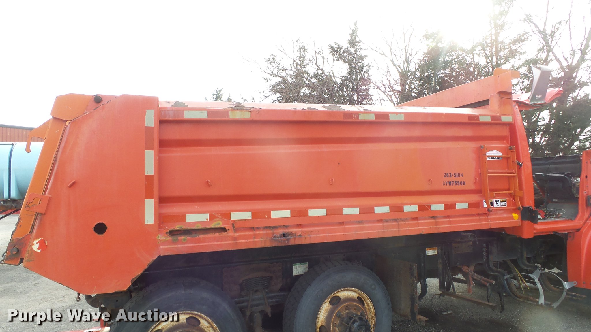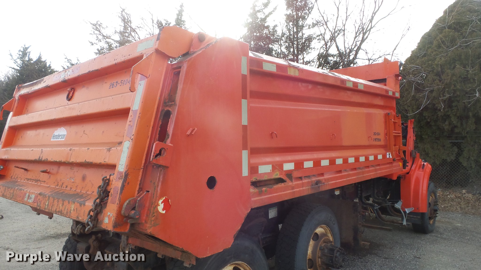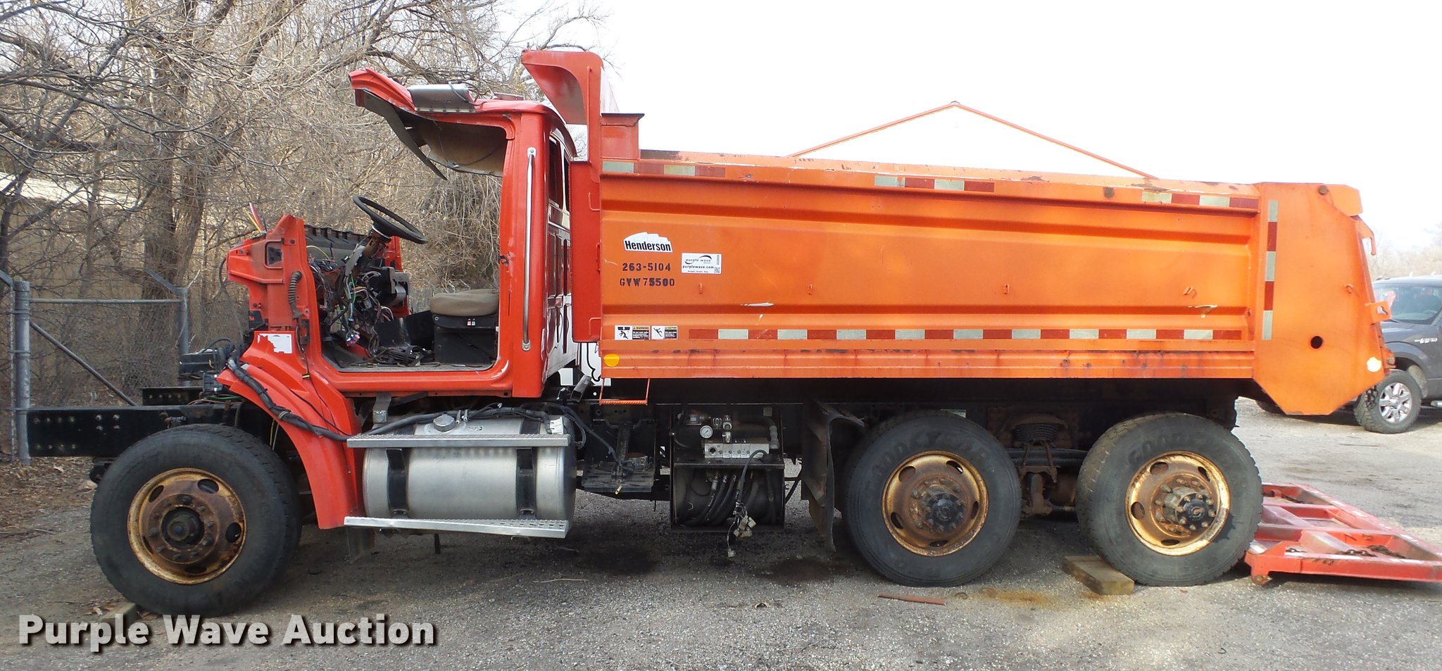 Purple Wave is selling a used Construction Dump Truck in Kansas. This item is a 2009 Sterling LT7501 dump truck with the following: 93,552 miles on odometer, No engine, No transmission, Tandem axle, Henderson 13.5XHX25277XKDOT steel dump bed, 13.5'L x 8'W, Single ram hoist, Pintle htich, Spring suspension, Air brakes, 275/80R22.5 front tires, 295/75R22.5 rear tires, Vehicle wrecked, Parts missing, Hydraulics removed, Body parts missing, Outer rear wheels missing, Lug nuts missing, KDOT ID 263-3118