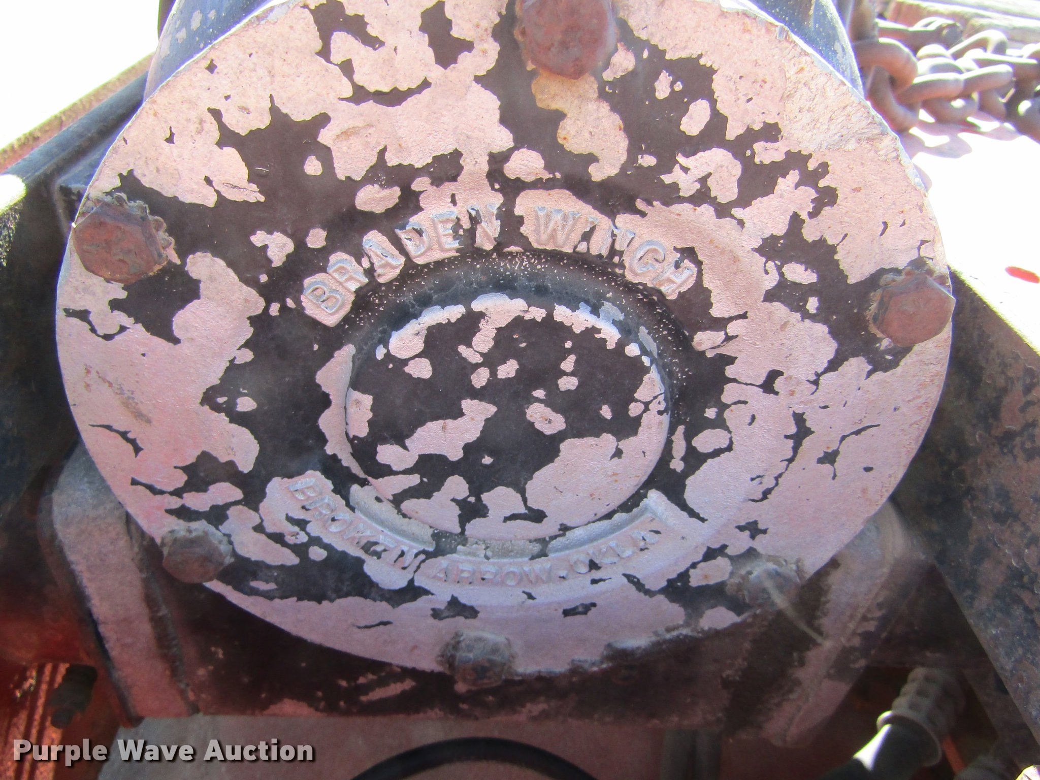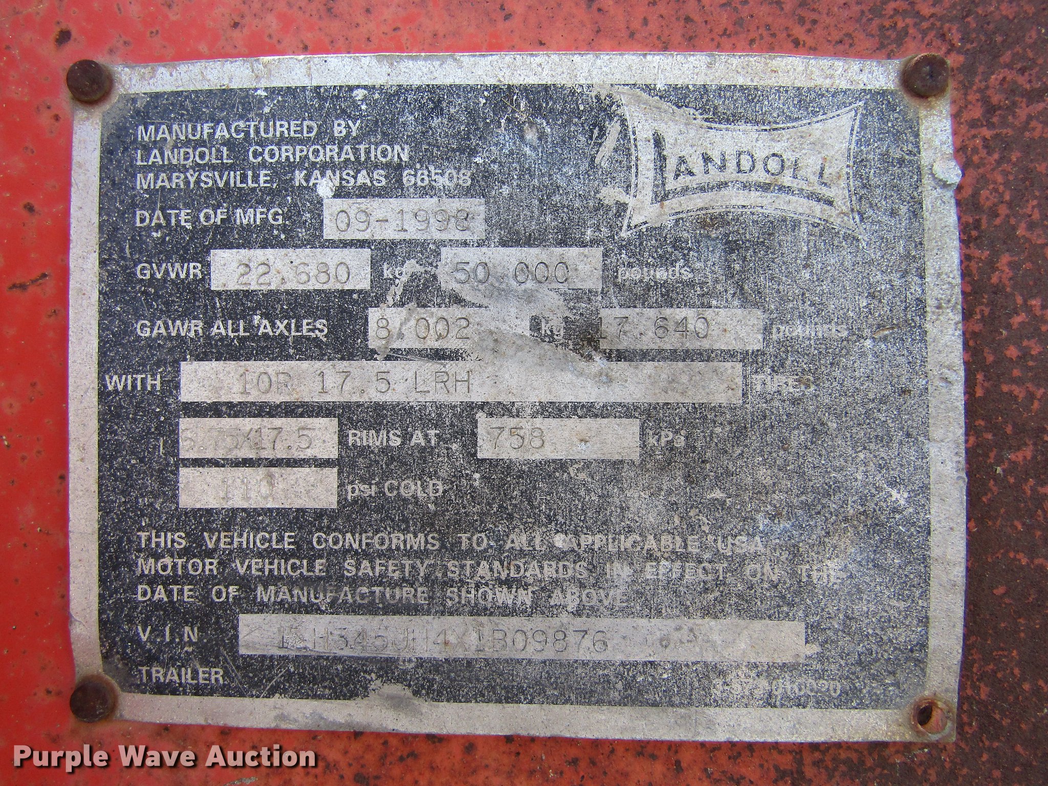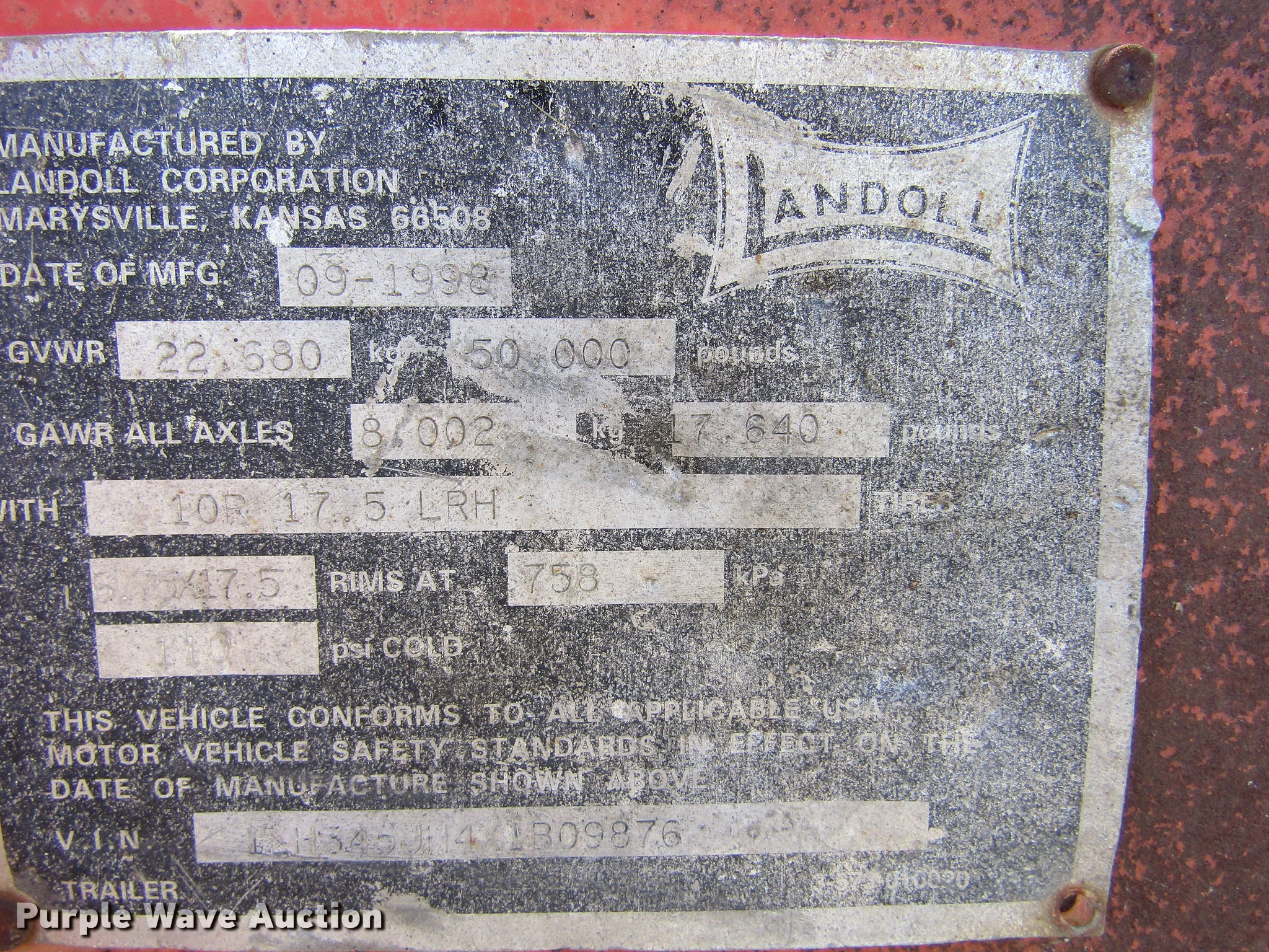 Purple Wave is selling a used Equip. Trailer in Kansas. This item is a 1999 Landoll 345B tilt deck equipment trailer with the following: 38'L x 102"W overall, 31'L wood deck, D-ring tie downs, Stake pockets, Braden winch, Hydraulic controls, Recessed toolbox, Pintle hitch, Dual leg landing gear, Spring suspension, Air brakes, Sliding tandem axle, Steel wheels, 10R17.5 tires, GVWR 50,000 lbs, GAWR 17,640 lbs, Deck boards need to be replaced, KDOT ID 777-6029