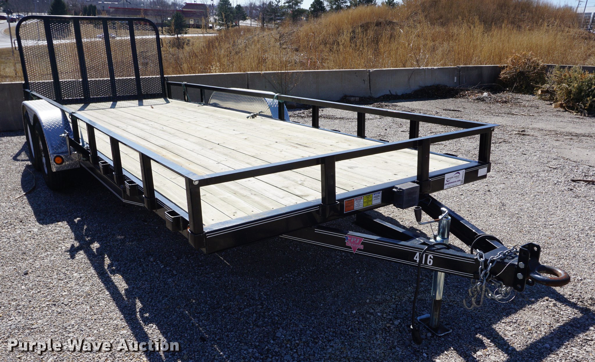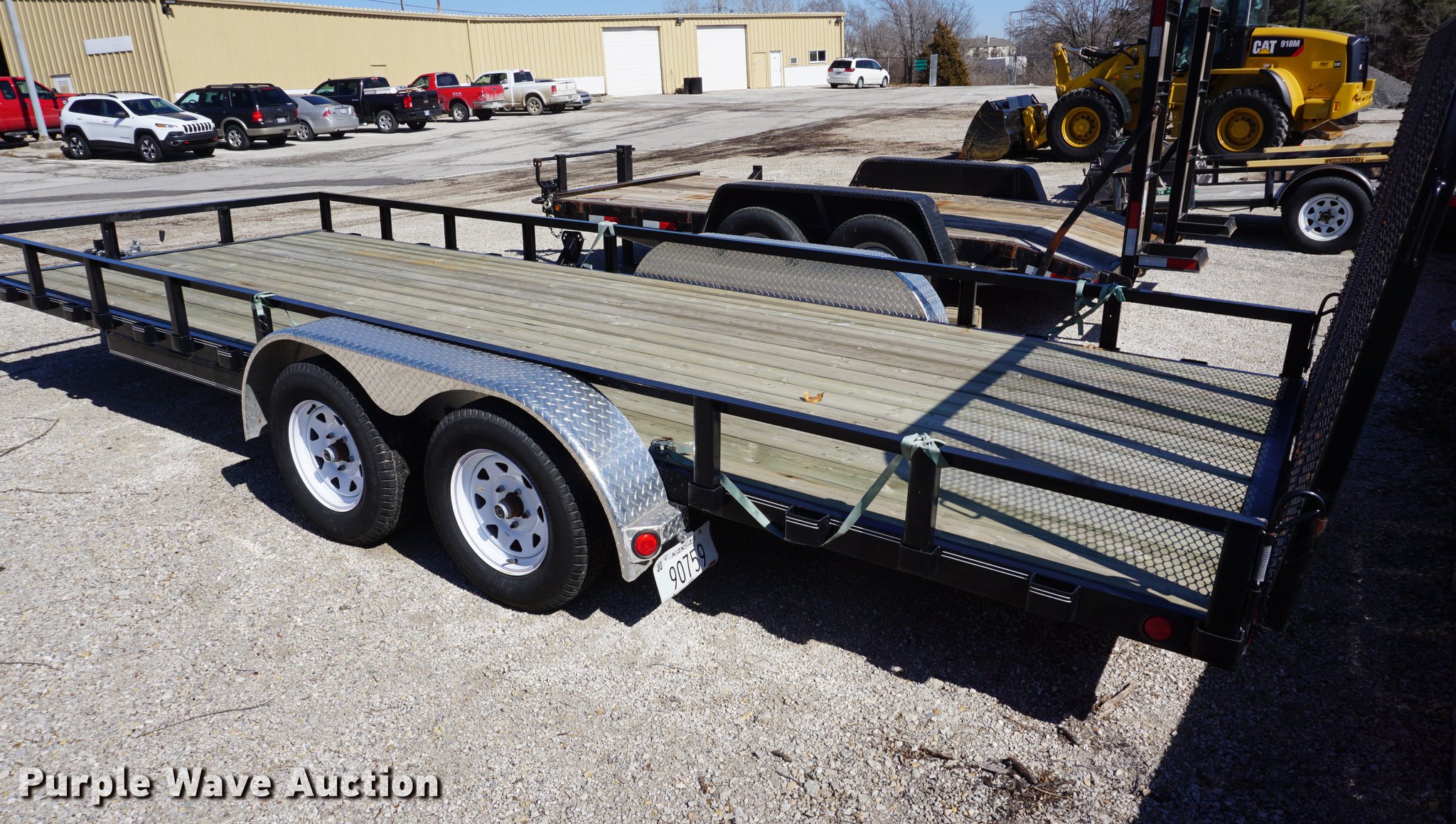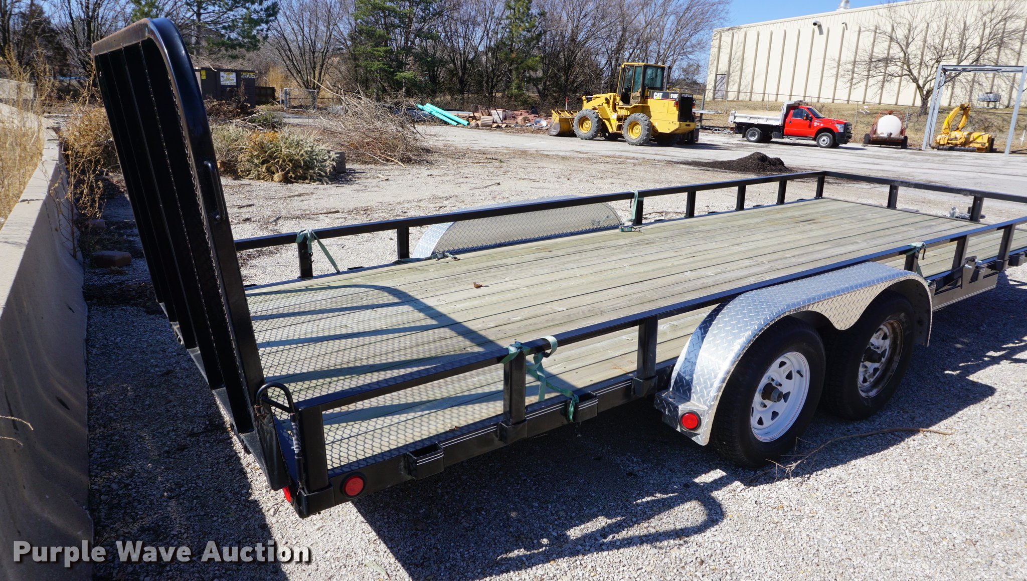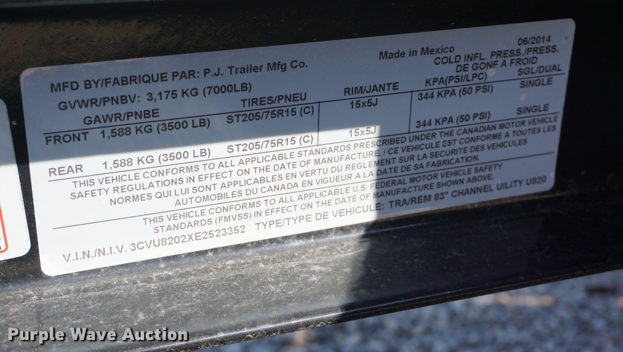 Purple Wave is selling a used Car or Utility Trailer in Kansas. This item is a 2014 PJ utility trailer with the following: 20'L x 83"W wood deck, 48"L ramp, Stake side pockets, Single leg landing gear, Pintle hitch, Tandem axle, Spring suspension, Electric brakes, 205/75R15 tires, GVWR 7,000 lbs, GAWR 3,500 lbs