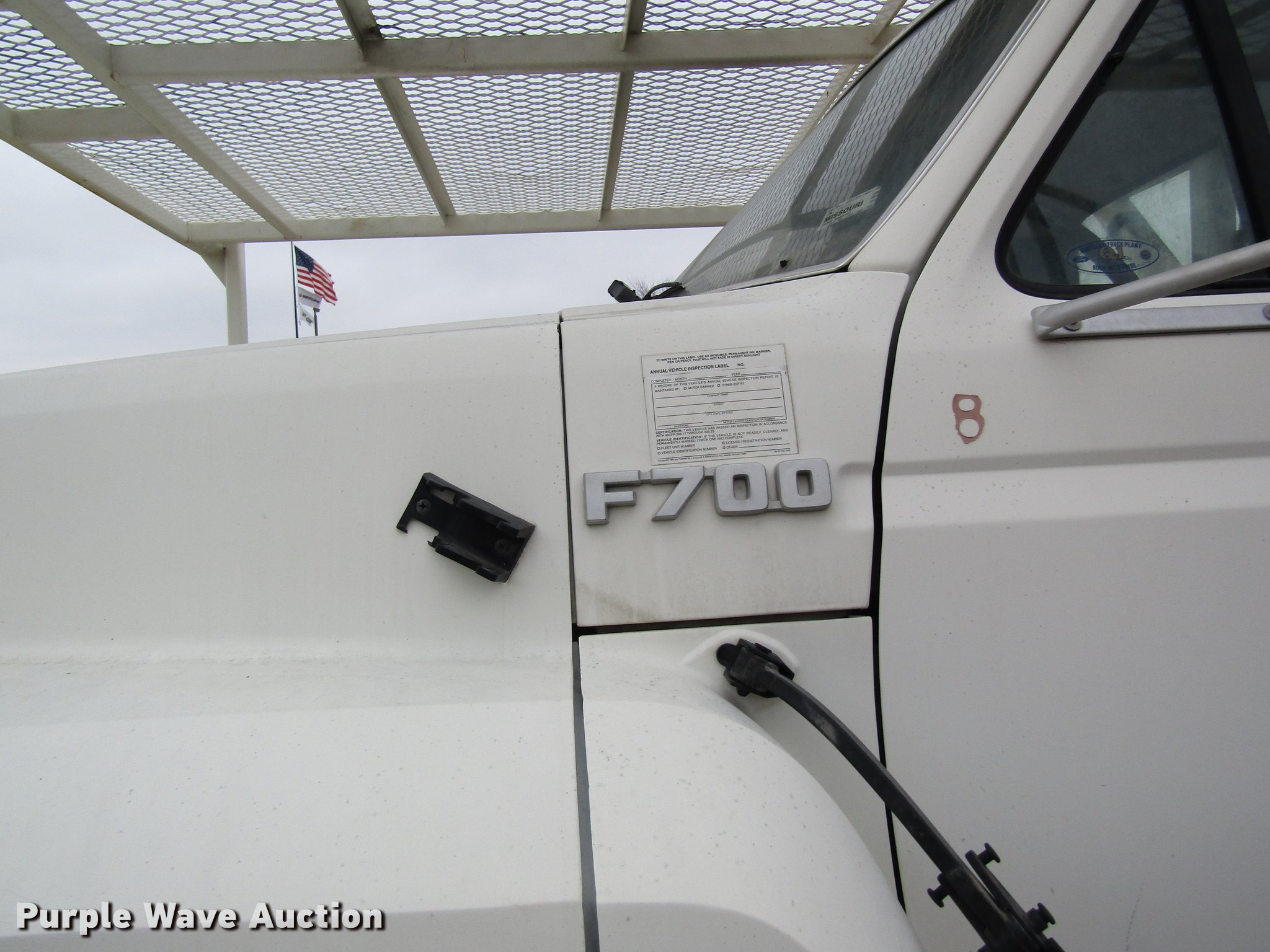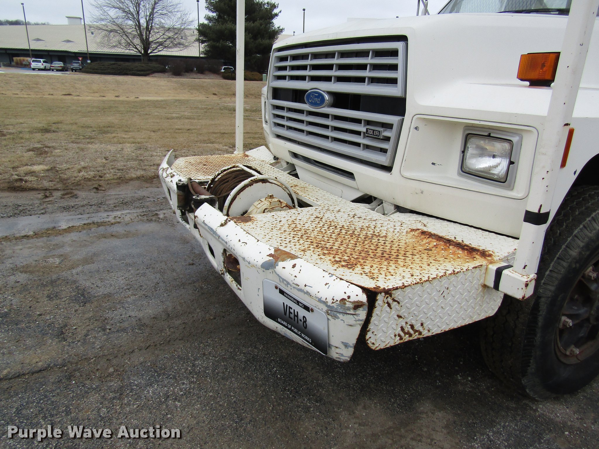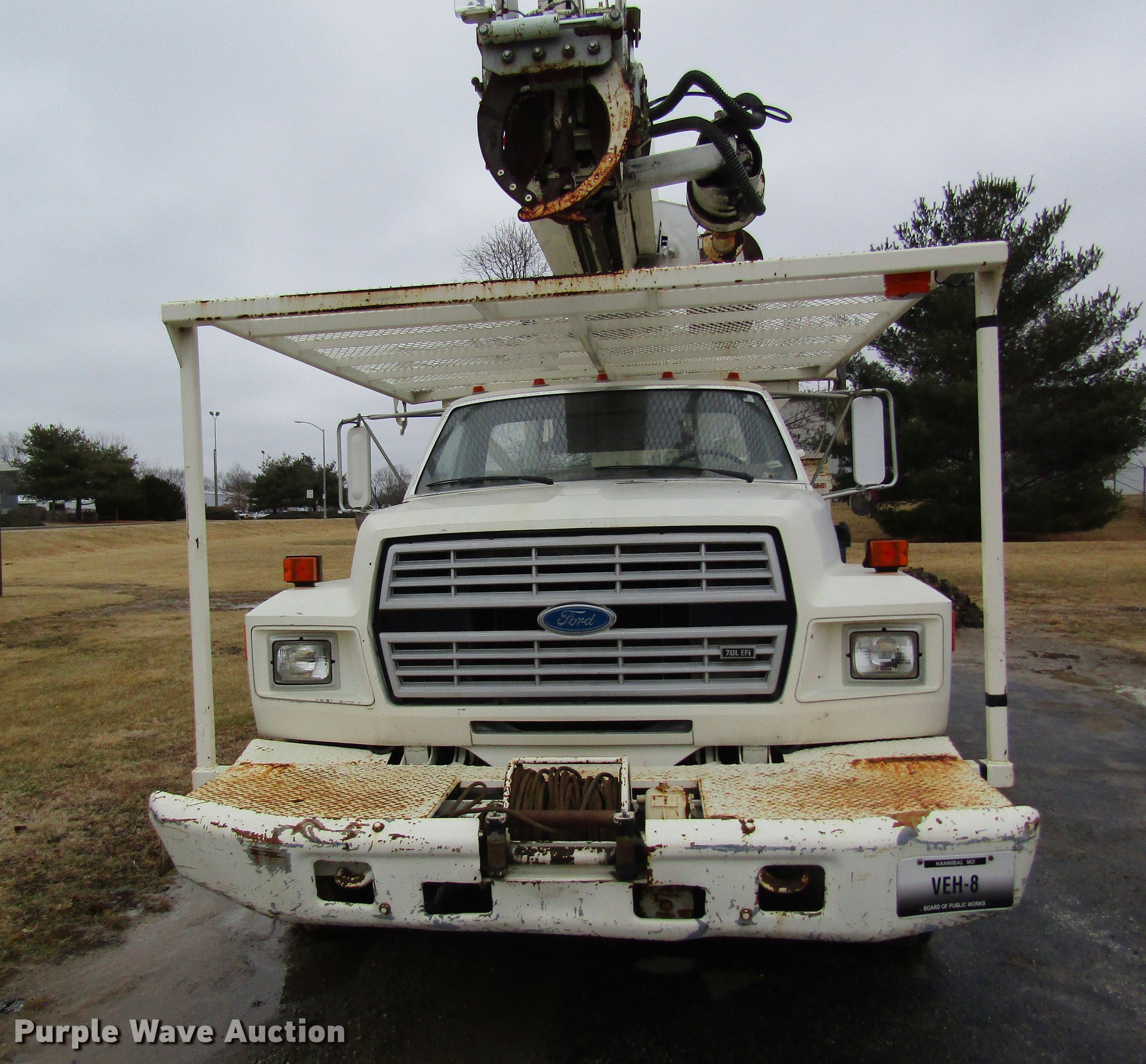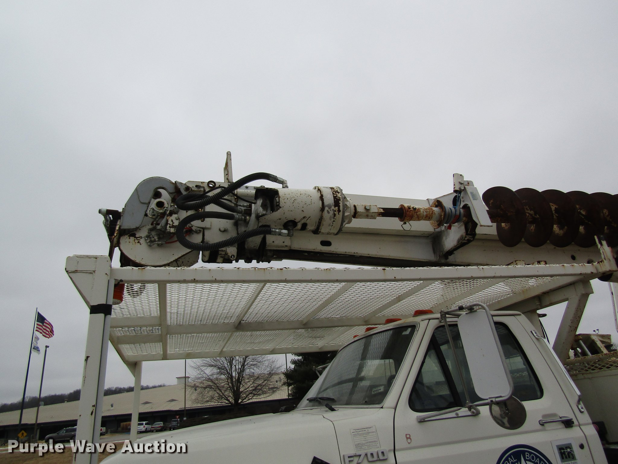 Purple Wave is selling a used Bucket Truck in Missouri. This item is a 1993 Ford F700 digger derrick truck with the following: 46,384 miles on odometer, 85,301 hours on meter, 7.0L V8 gas engine, Five speed manual transmission, Two speed rear end, Single axle, Heat, AM/FM, Suspension seat, Front tow hooks, PTO, Altec D945 service bed, 13'L, Winch, Serial 37-63813, Altec D945 digger derrick, 20,000 lbs max lift capacity, 45' max lift height, Ground boom controls, Boom rotation, Telescopic boom, 18" diameter auger, Rope material handler, Outriggers, Serial 0293RA0148, Pintle hitch, Trailer wiring, Spring suspension, Hydraulic brakes, 10.00-20 tires, View dielectric test, 06/2017, Unit# 8